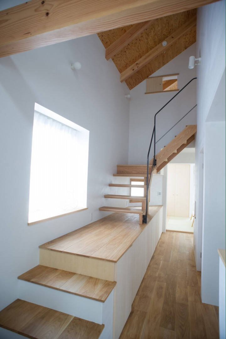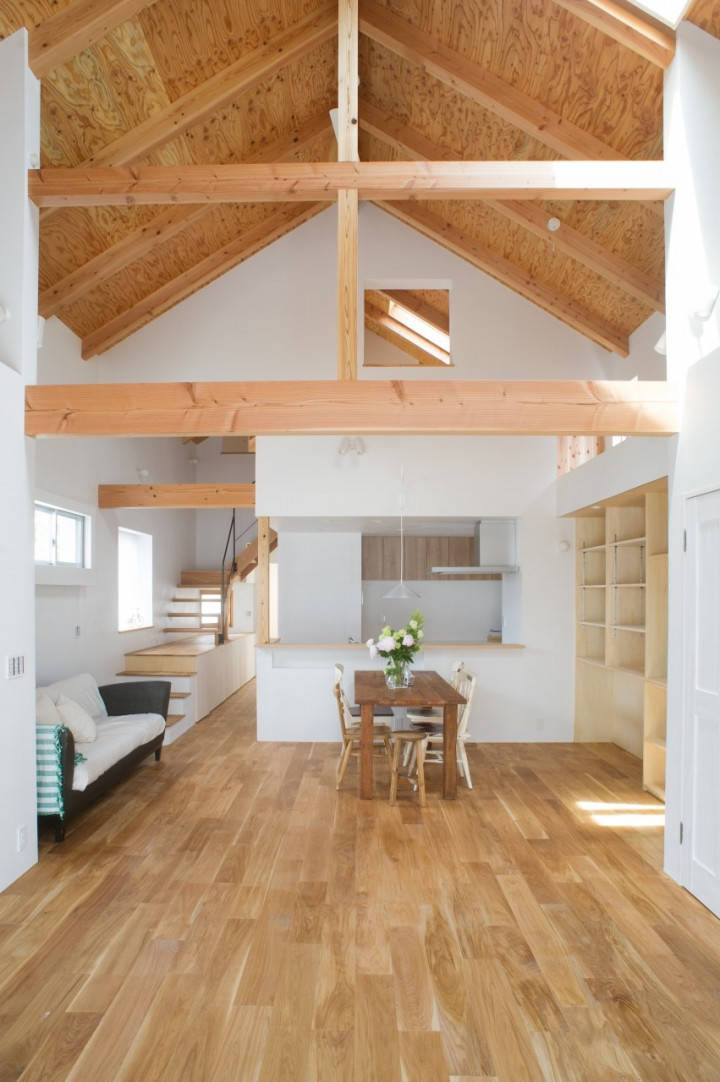 家型のボリュームの小屋裏部分(三角屋根の裏)を使用できる空間とすることで2 階は屋根裏部屋のような空間となり、建物の高さを低く抑えることが可能となります。外から見ると1.5 階建てのような少し不思議な小さなボリューム感となっています。