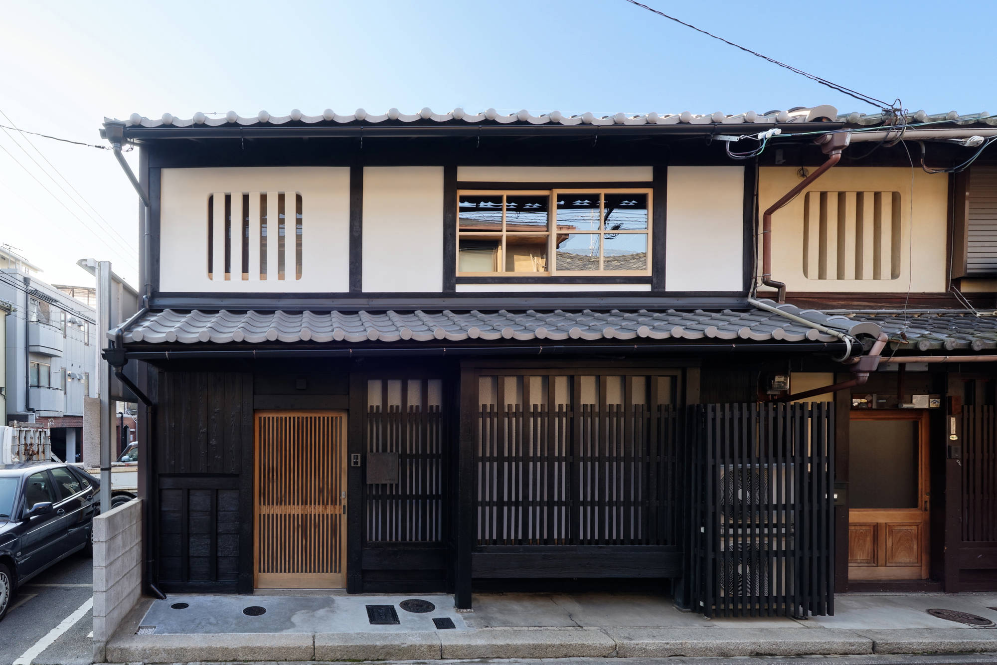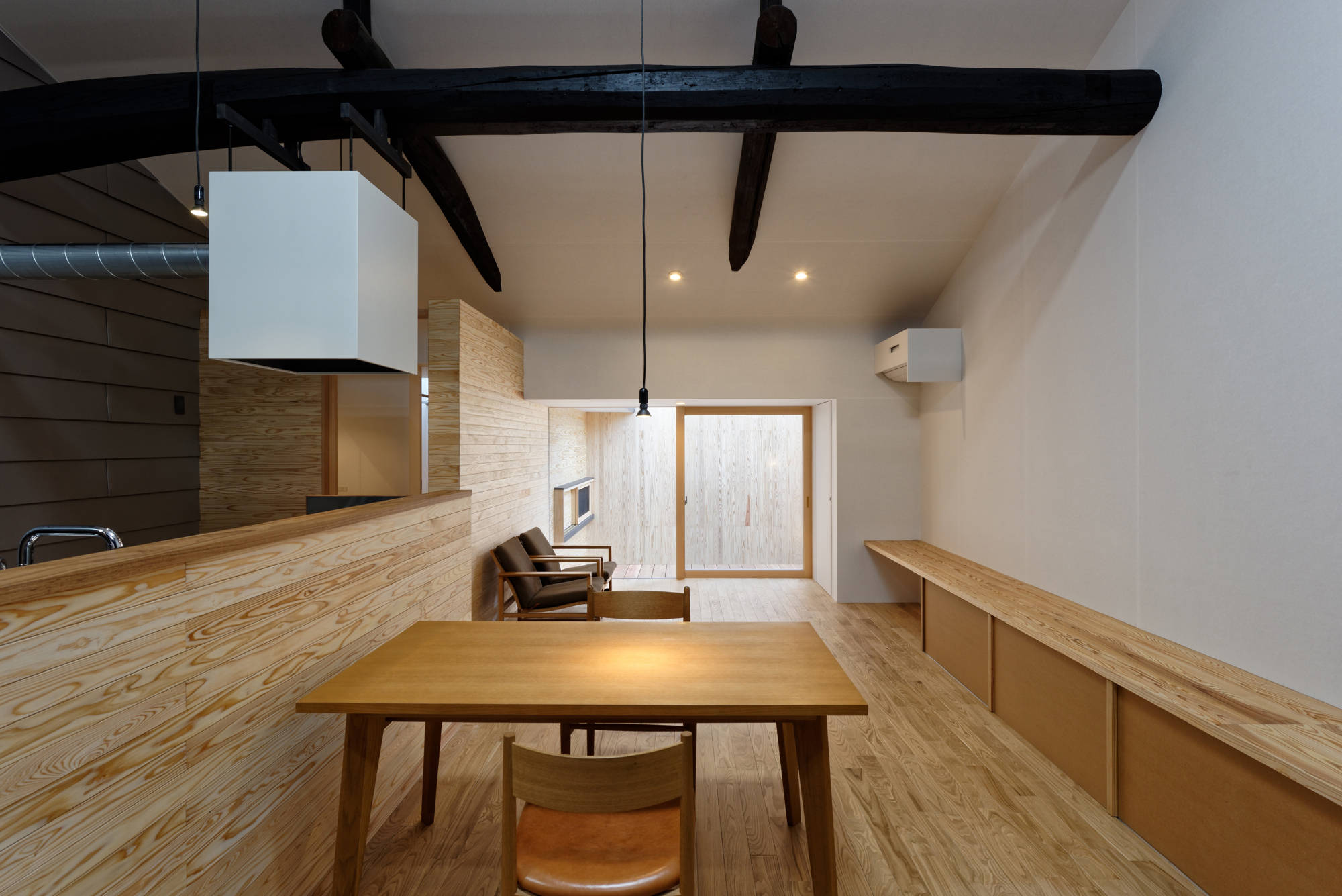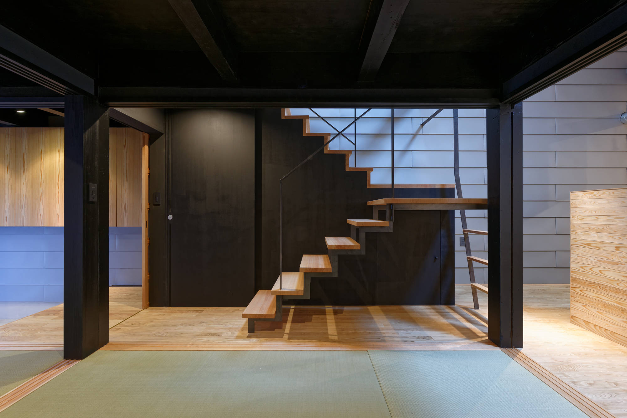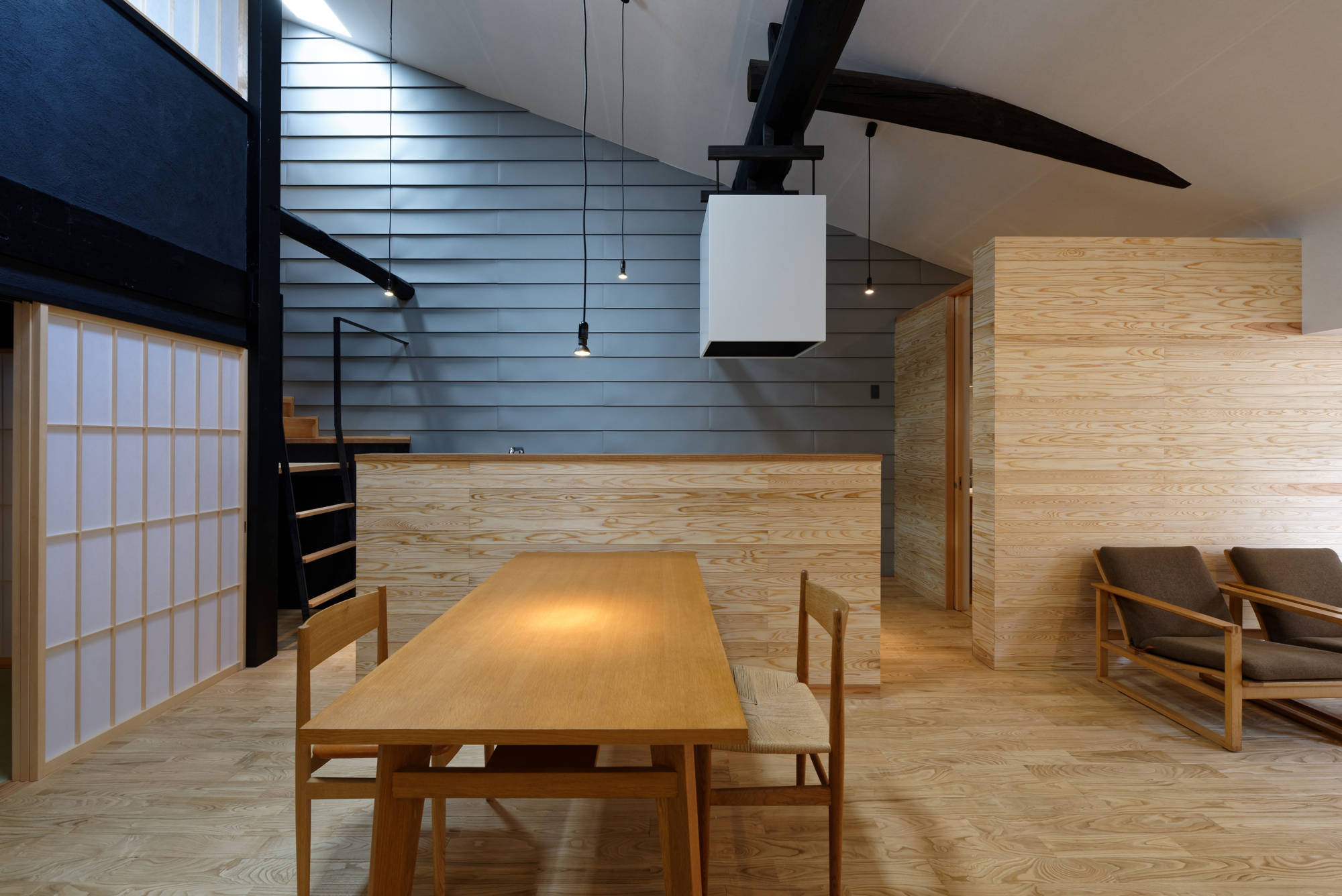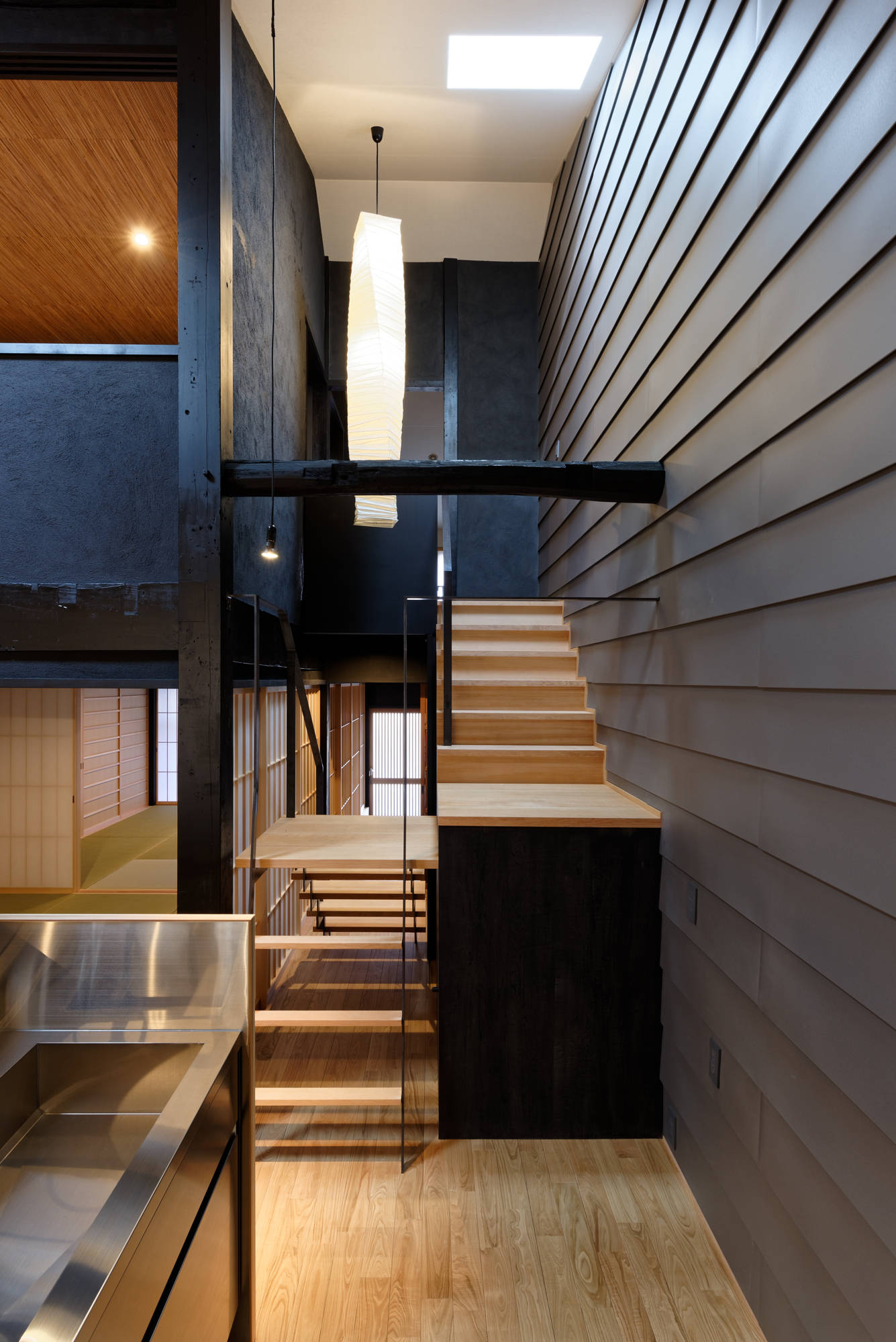 伝統的な町家の良さを残しながら、クライアントが要望する現代的生活の実現を試みています。外観は町家の特徴を色濃く残しており、修復を行いました。外壁や隣家との界壁は断熱材と遮音板を封入した大壁構造としています。そして、その仕上げは100年以上の年月を経た構造体に負けない素材の強さ、素朴さを持ったものとして「ガルバリウム鋼板」と「和紙」を新たに採用しています。一方、間仕切り壁については真壁構造のまま柱を現しとし、既存土壁の上に黒漆喰塗りとして伝統的な町家の良さを生かしています。