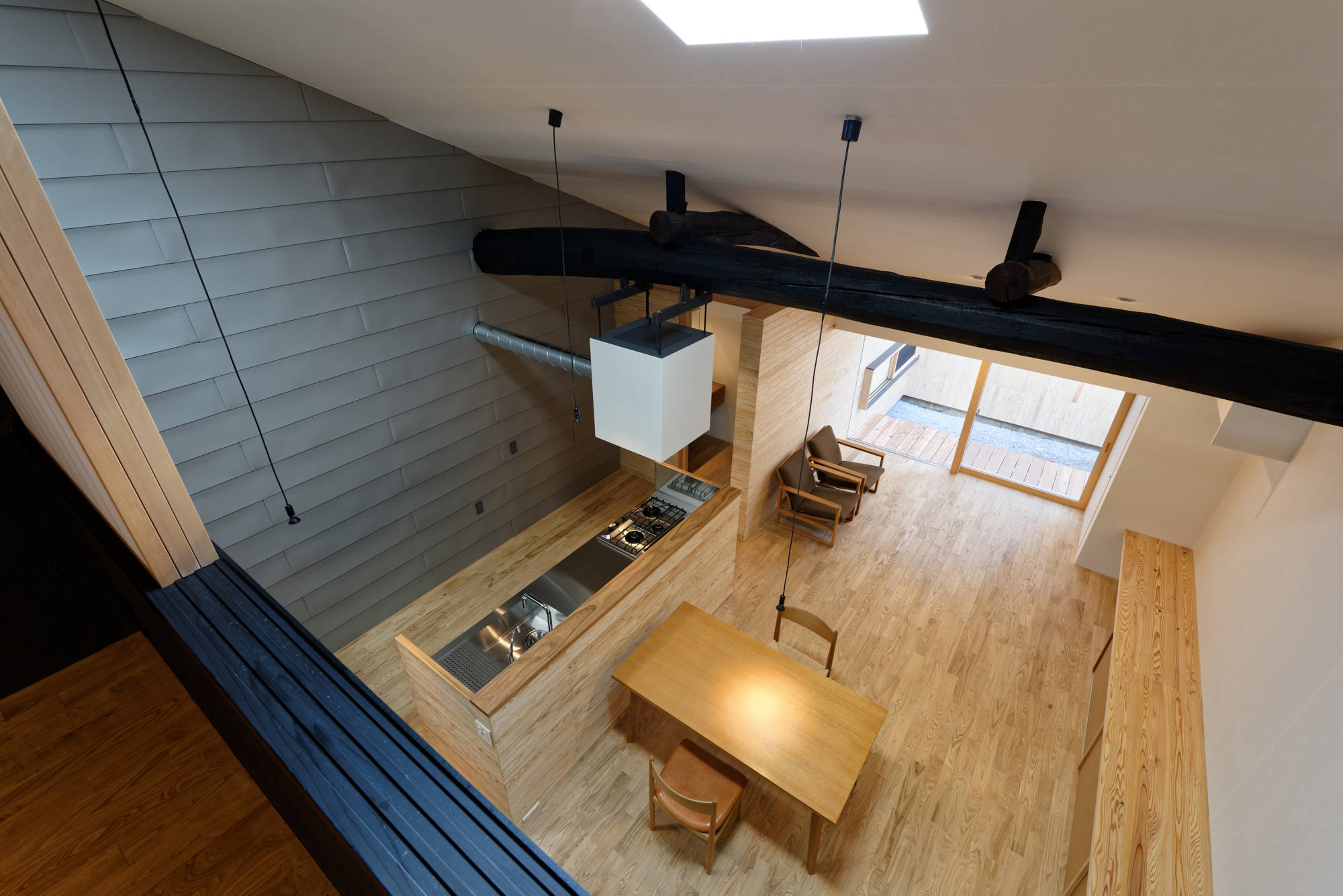 また、過去の改装で完全に塞がれていた奥の間の吹抜けを元に戻し、伝統的な織屋建ての空間を再生することによって、ダイナミックな広がりのある空間となりました。