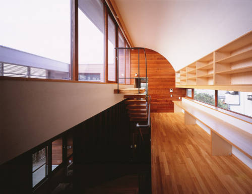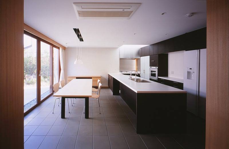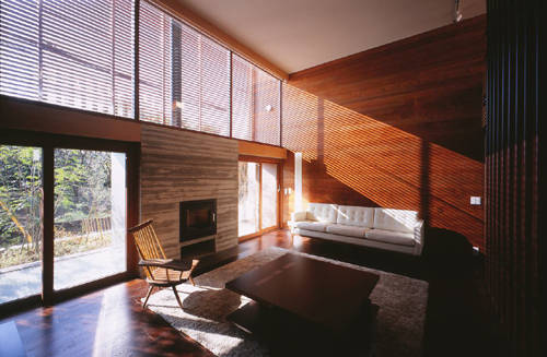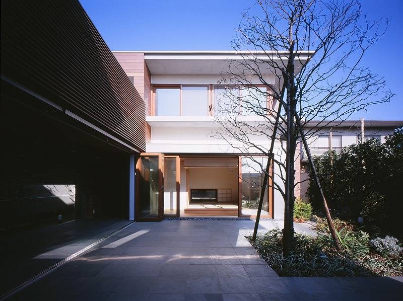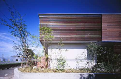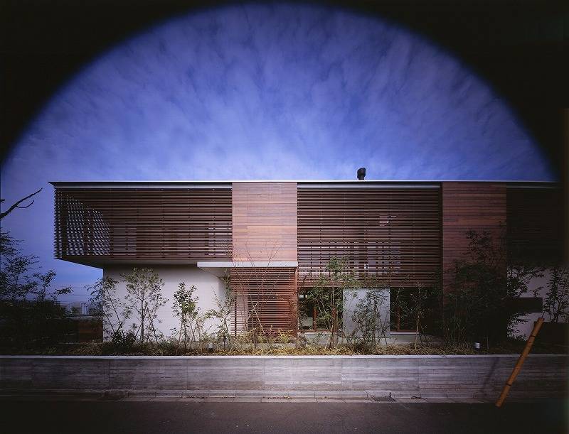 生産緑地がまだ点在する郊外の住宅地の一角に建つこの住宅は木製のルーバーを開口部の前面に取り付けた外観を見せている。150坪のL型の敷地で南側と西側が前面道路に面している。その道路に面した部分に母屋、そして奥の住宅に囲まれた部分に中庭を挟んで離れをつくった。母屋の1階はコモンスペースとし、居間、ダイニングキッチンは分節されながら、水平方向に穏やかに繋がっている。