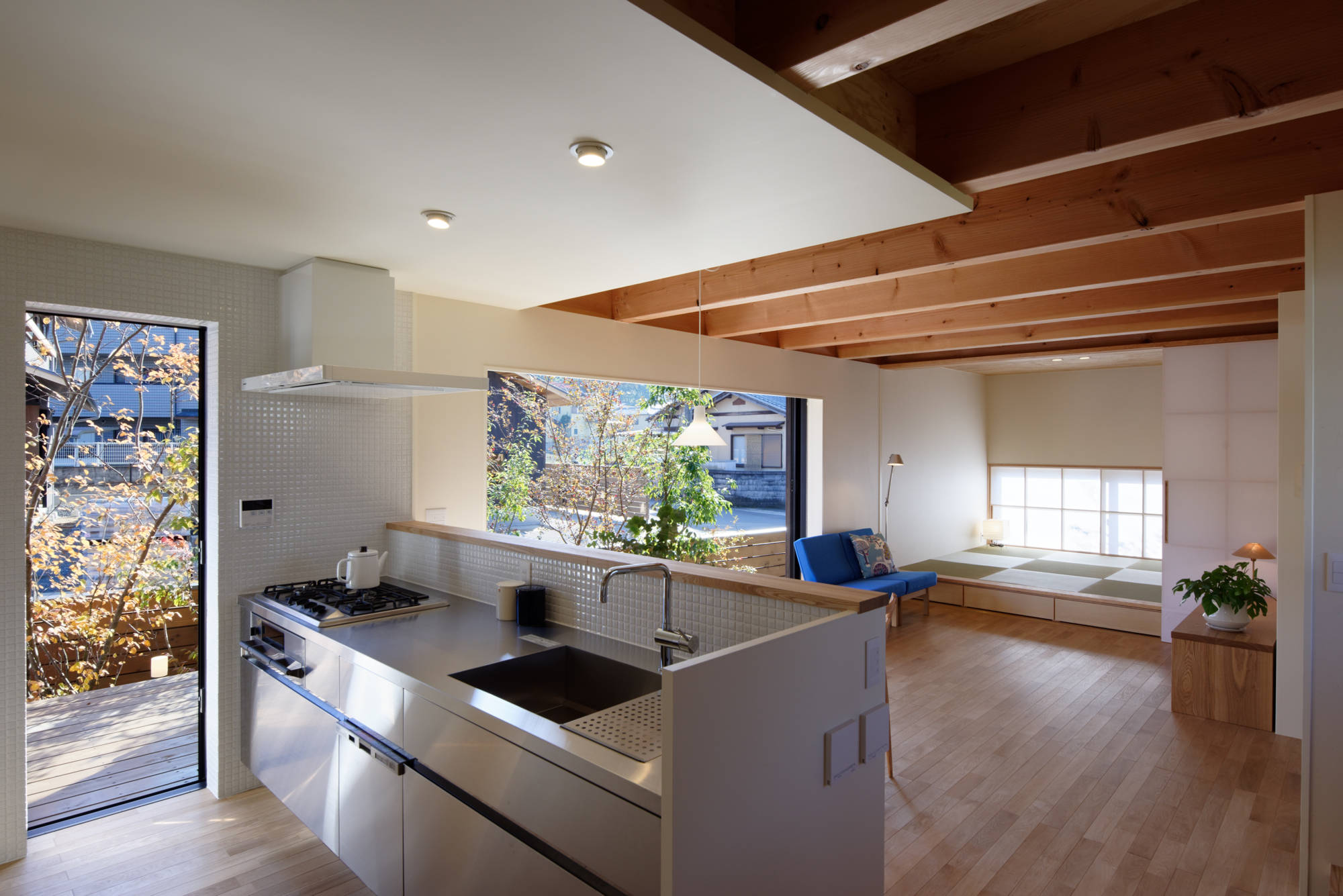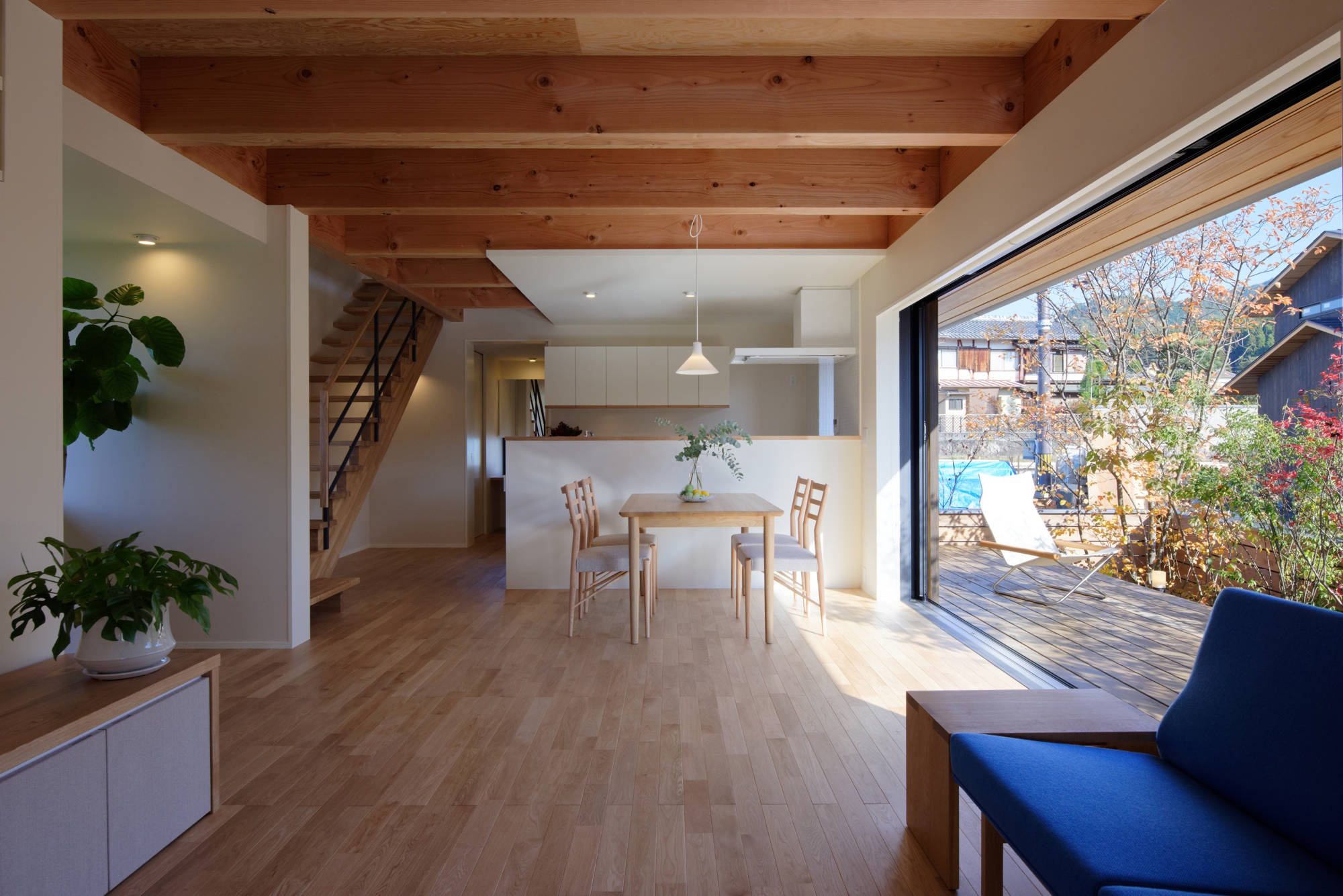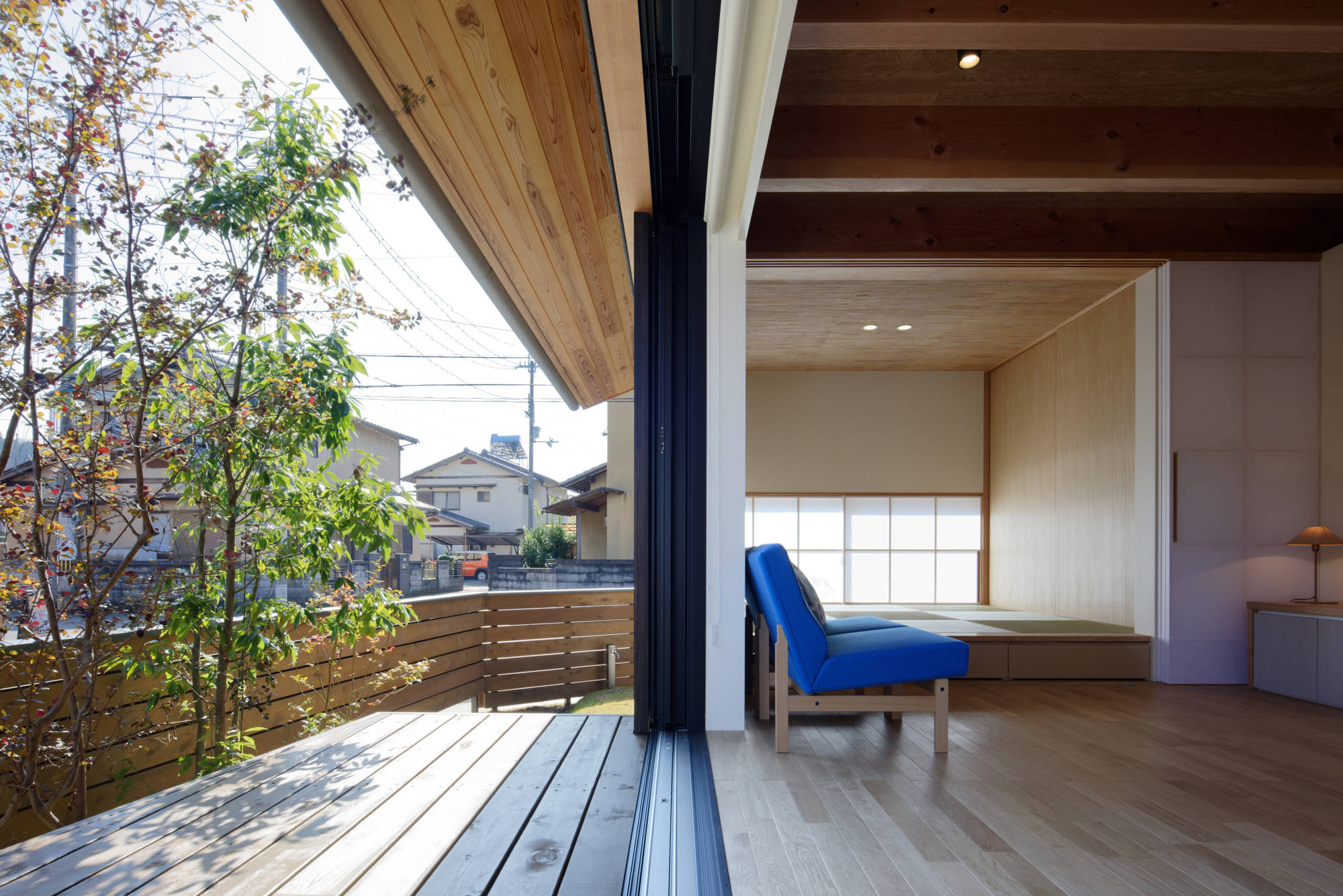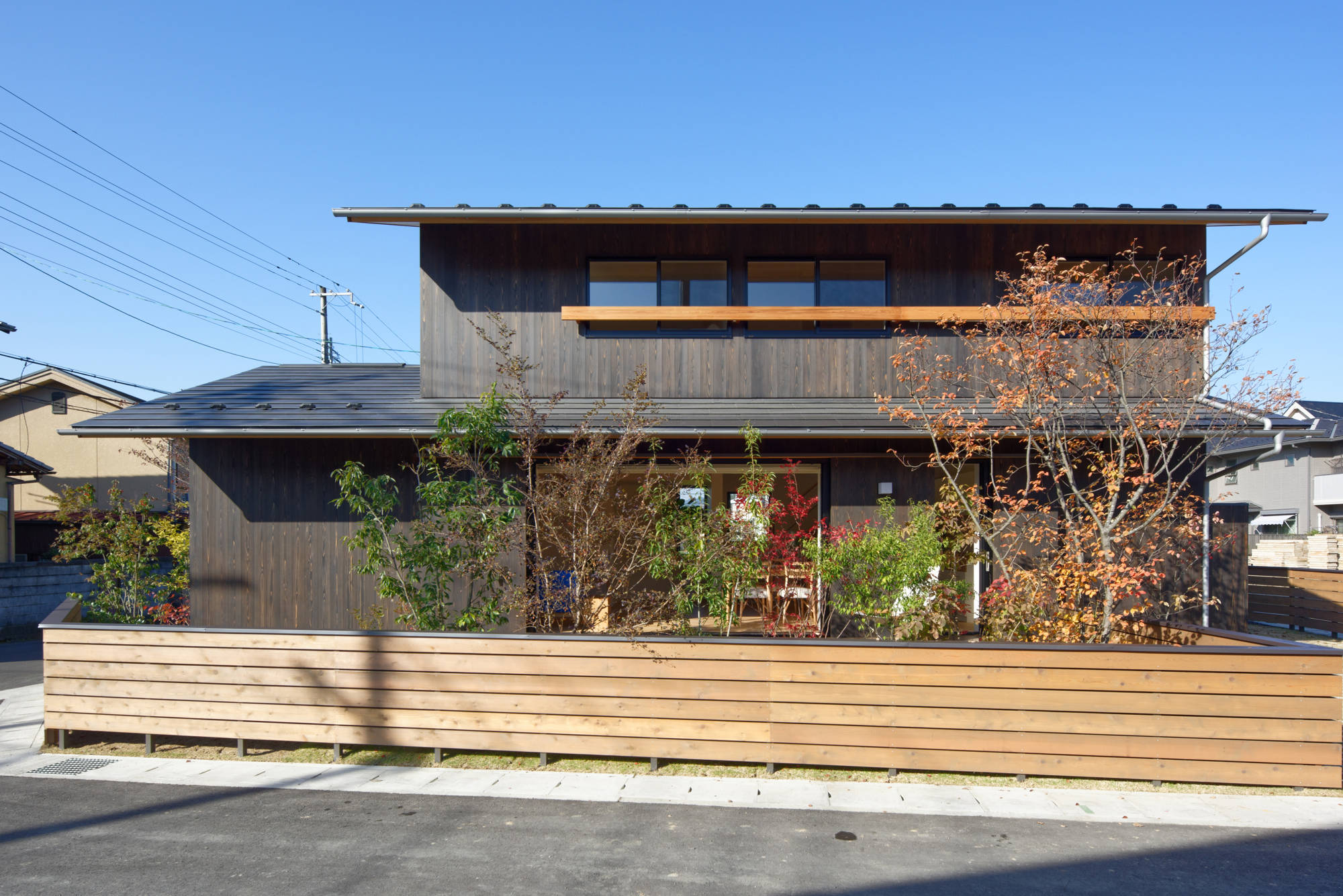 素材や形状は風土に馴染むことを大切にしており、自然豊かな京都の岩倉地区 の風景をつくっていくことに貢献したいと考えて設計してます。 プライバシーの確保された庭を、デッキテラスで連続的につないだ構成と、 杉板が特徴的な外観など、自然素材のマテリアルを用いて、 緑豊かな環境に映える住宅群をつくりだしています。
