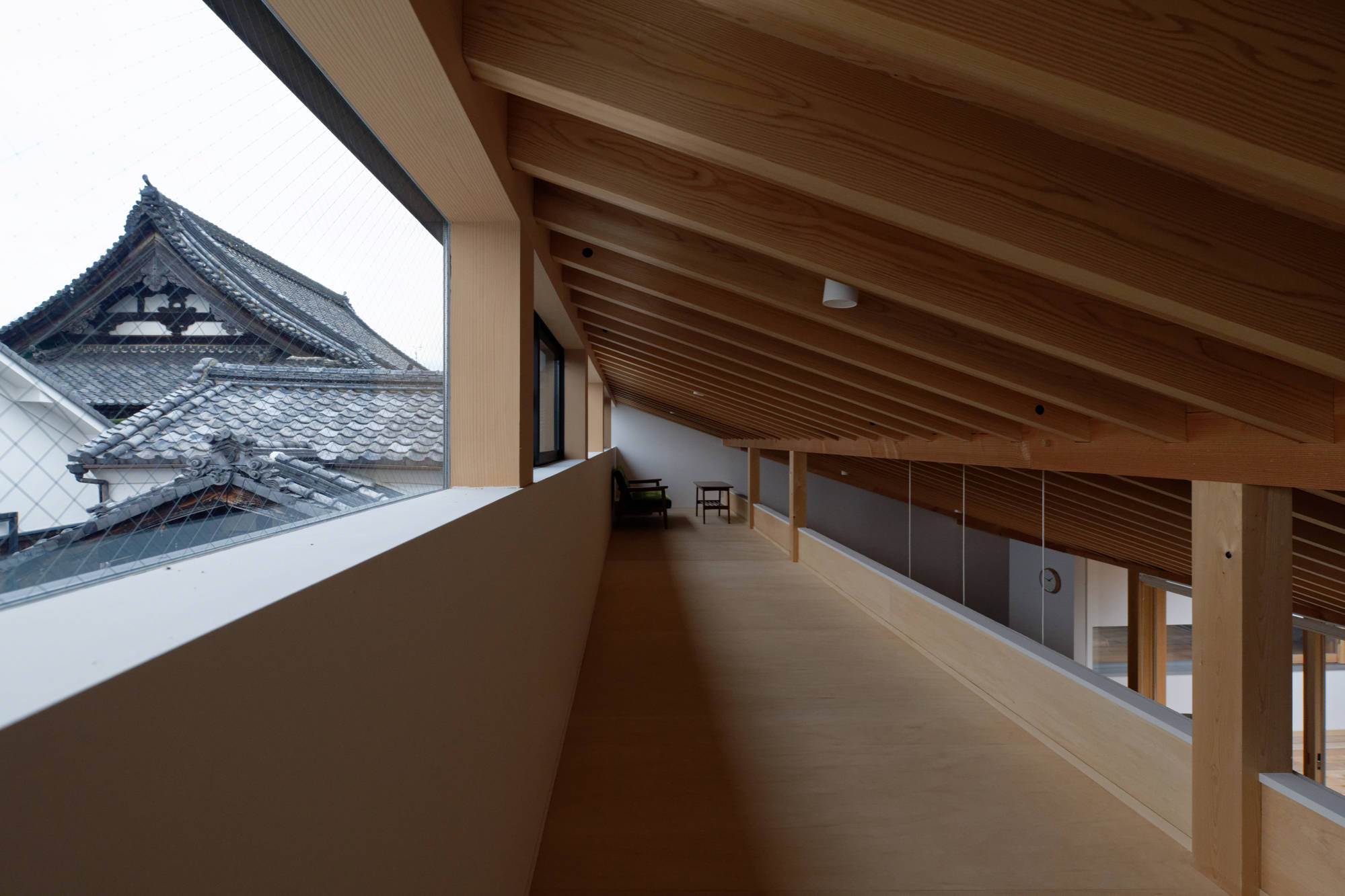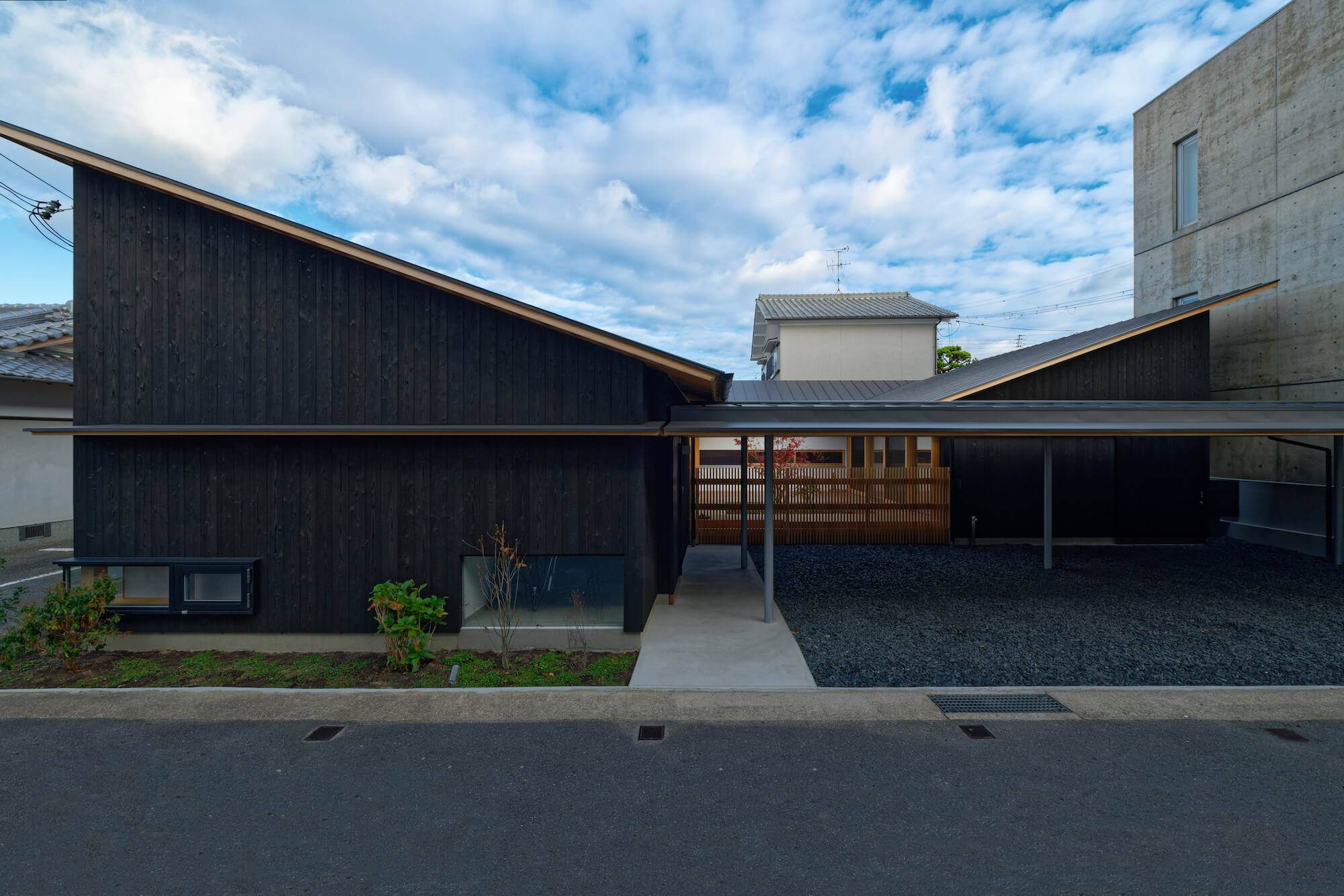 外壁には焼杉板と白漆喰を用いて地域景観との調和を図り、低く抑えた駐車場屋根のラインを 建物の外周部にも巡らせることで街のスケール感に合わせています。