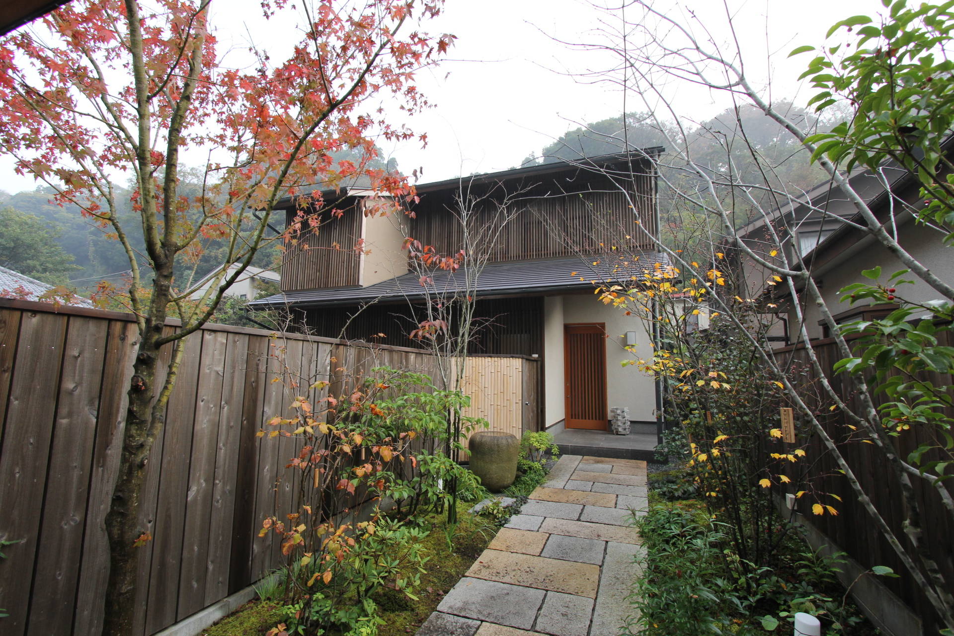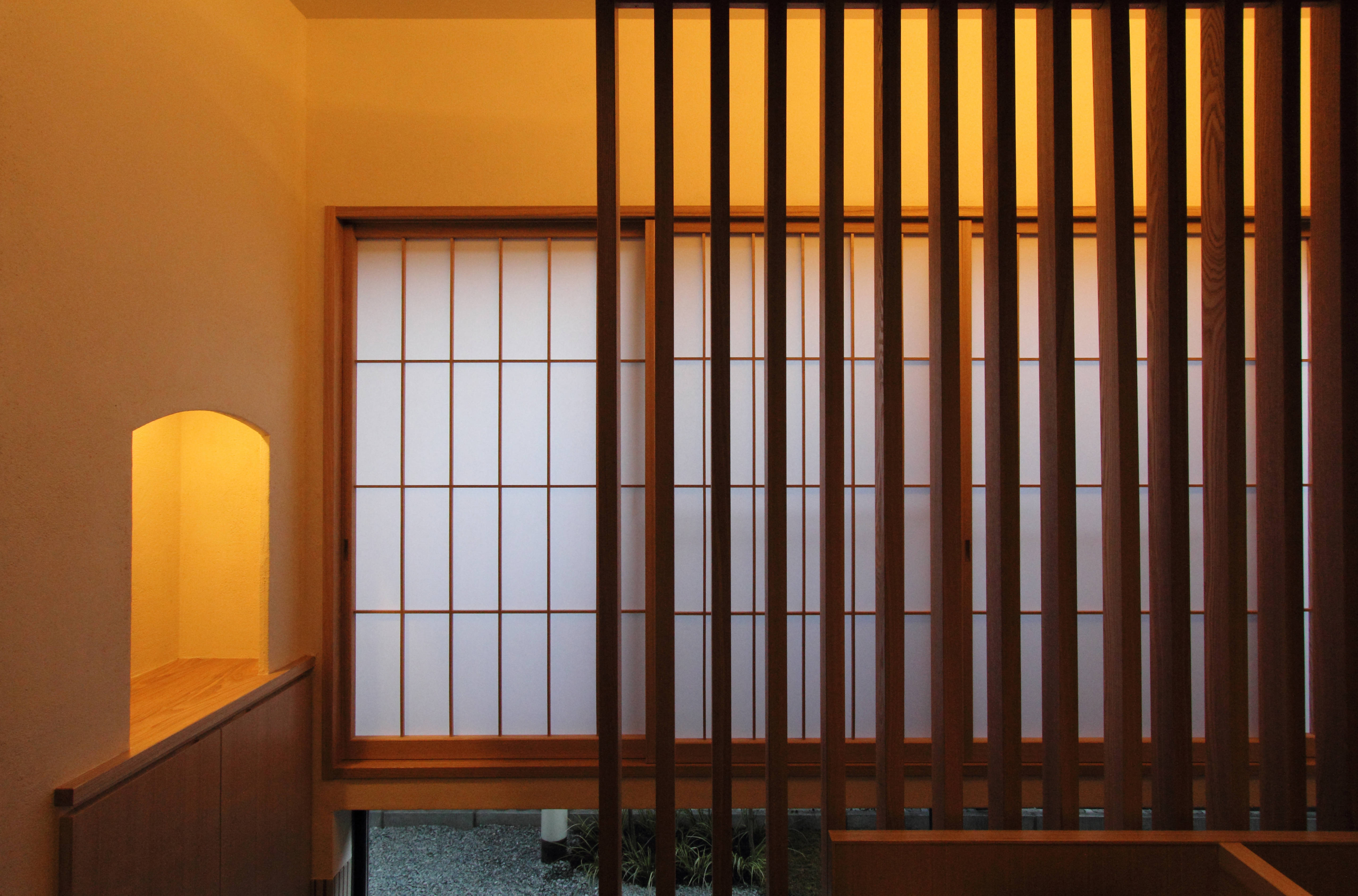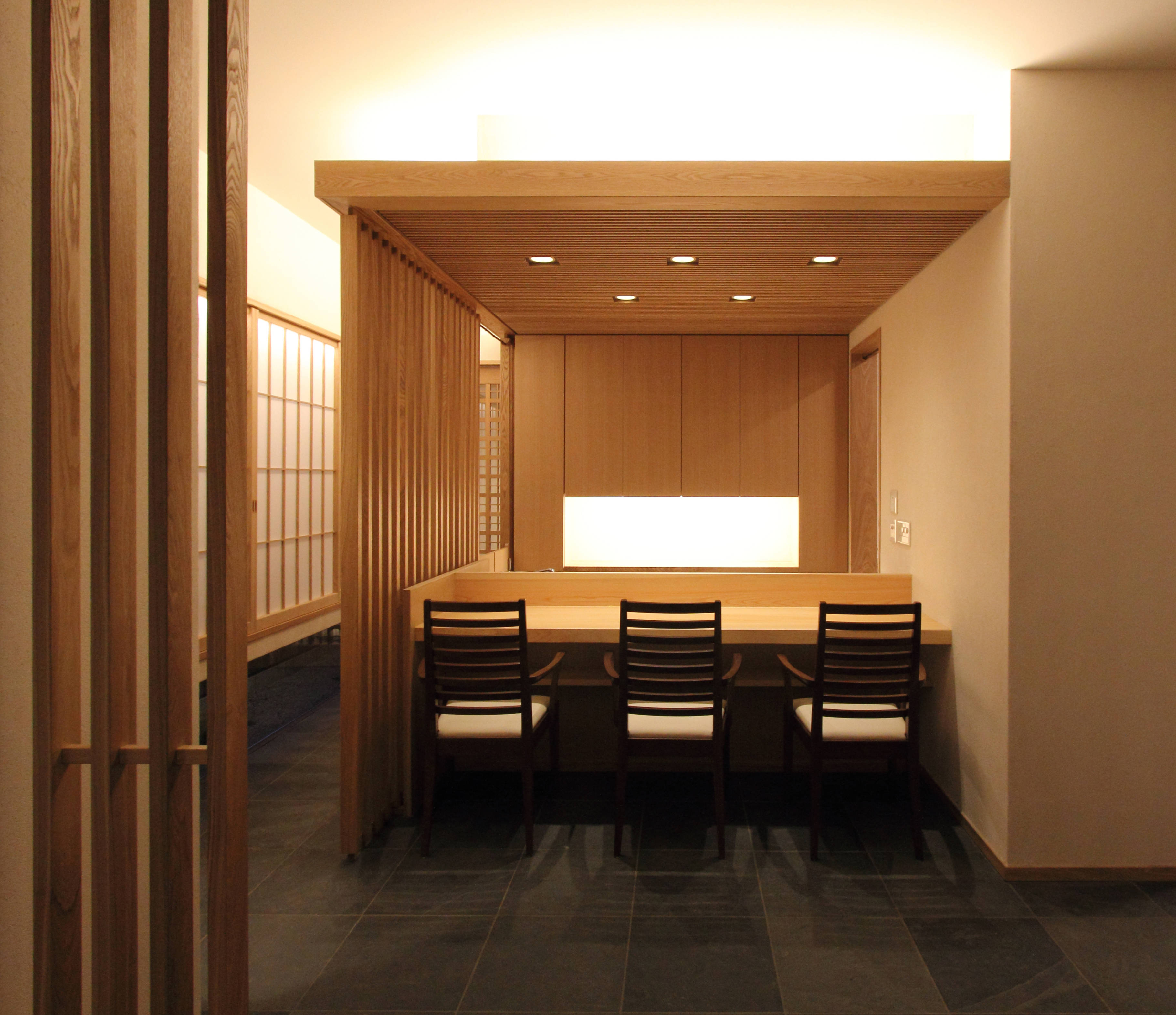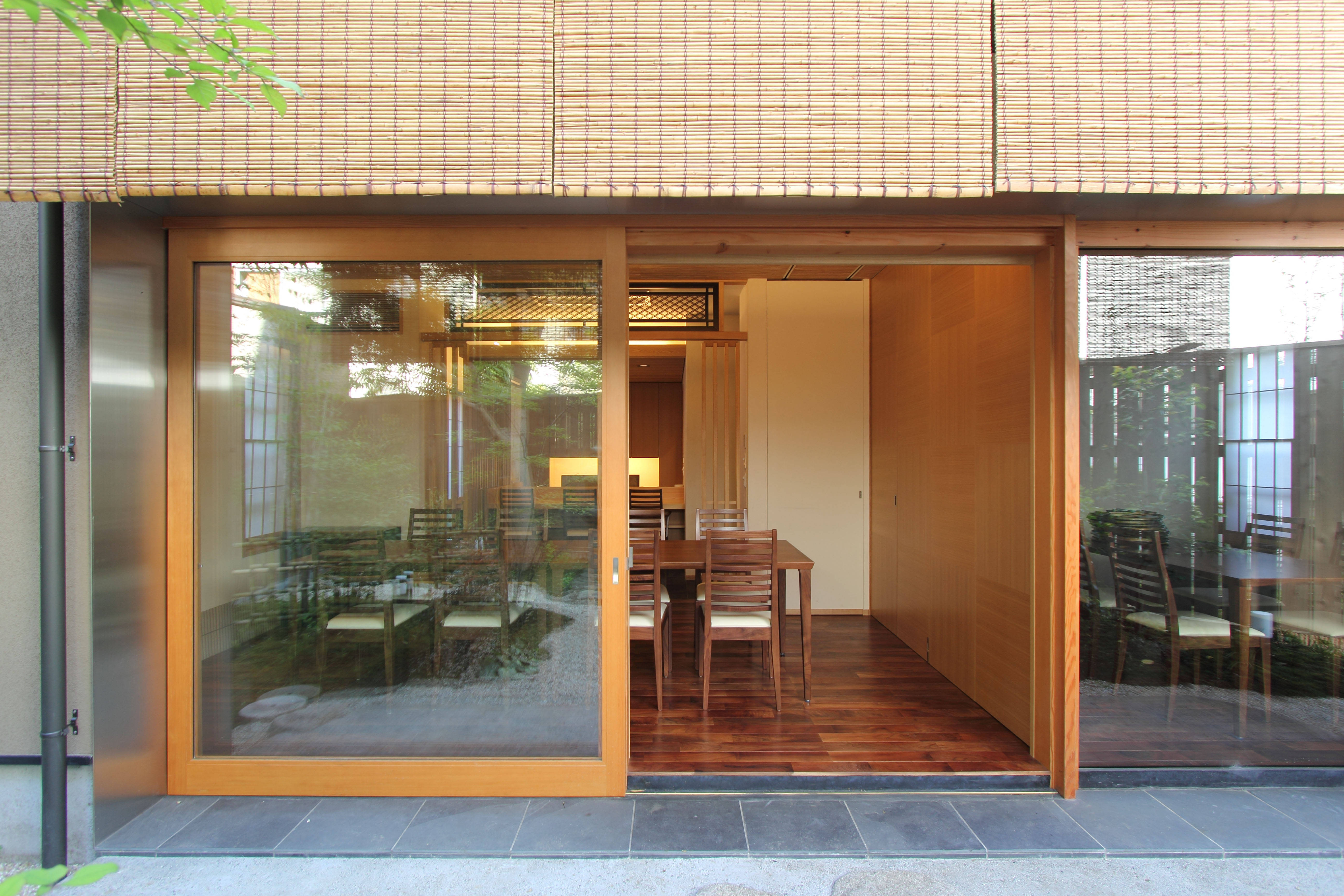 鎌倉の奥座敷ともいえる二階堂の日本料理「米倉」の新店舗兼用住宅。敷地は薬師堂ヶ谷といわれる覚園寺のある谷戸に位置し、鎌倉の中心地の喧騒から離れた歴史と自然に囲まれた静かな環境である。周囲の自然に溶け込むように、できるかぎり建物の存在を消したいと考えた。木造2階建ての建物は前面道路から離し、平入りの切妻屋根は棟を奥にずらし、手前に下屋を設けることで、手前から見えるボリューム感を減らしている。