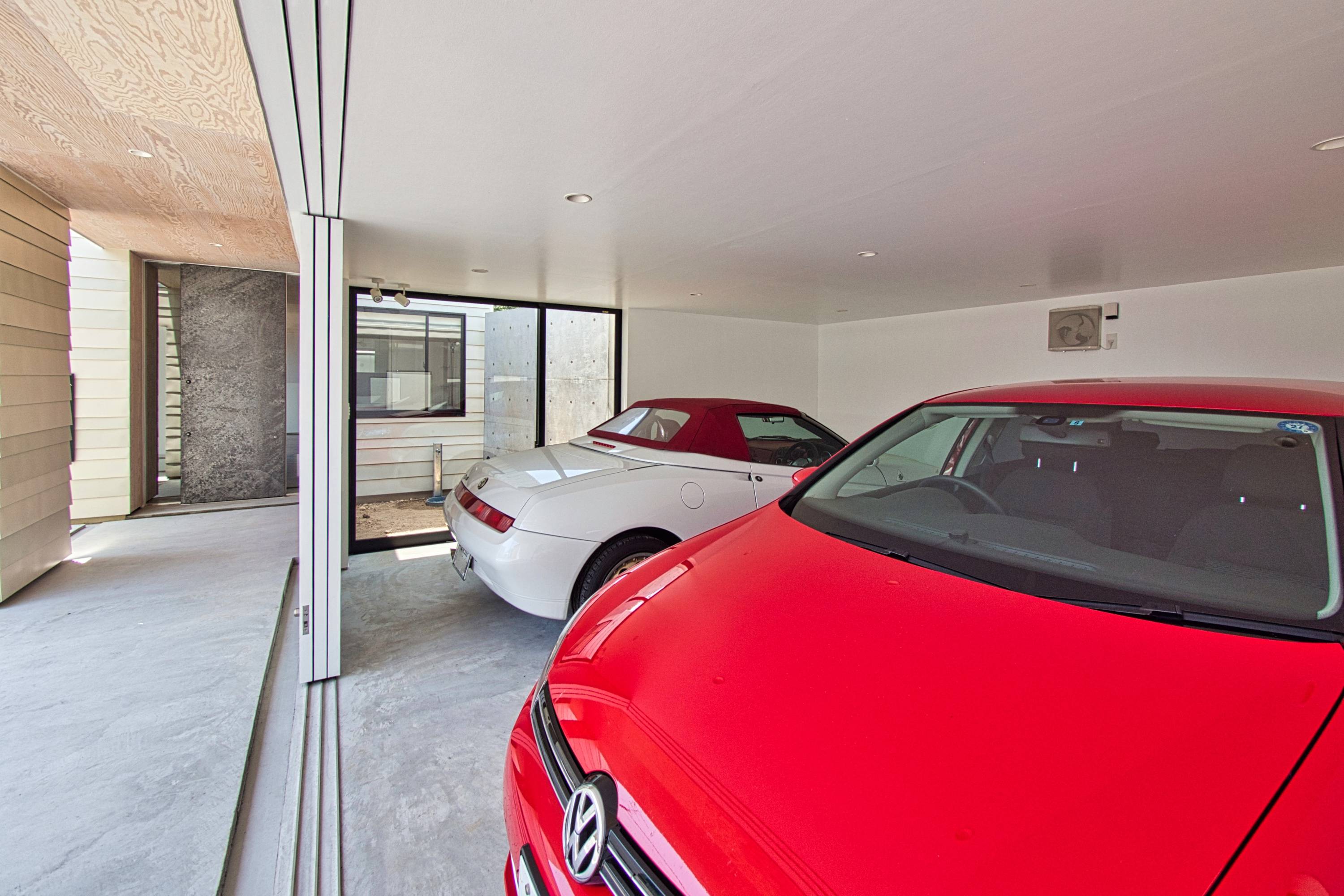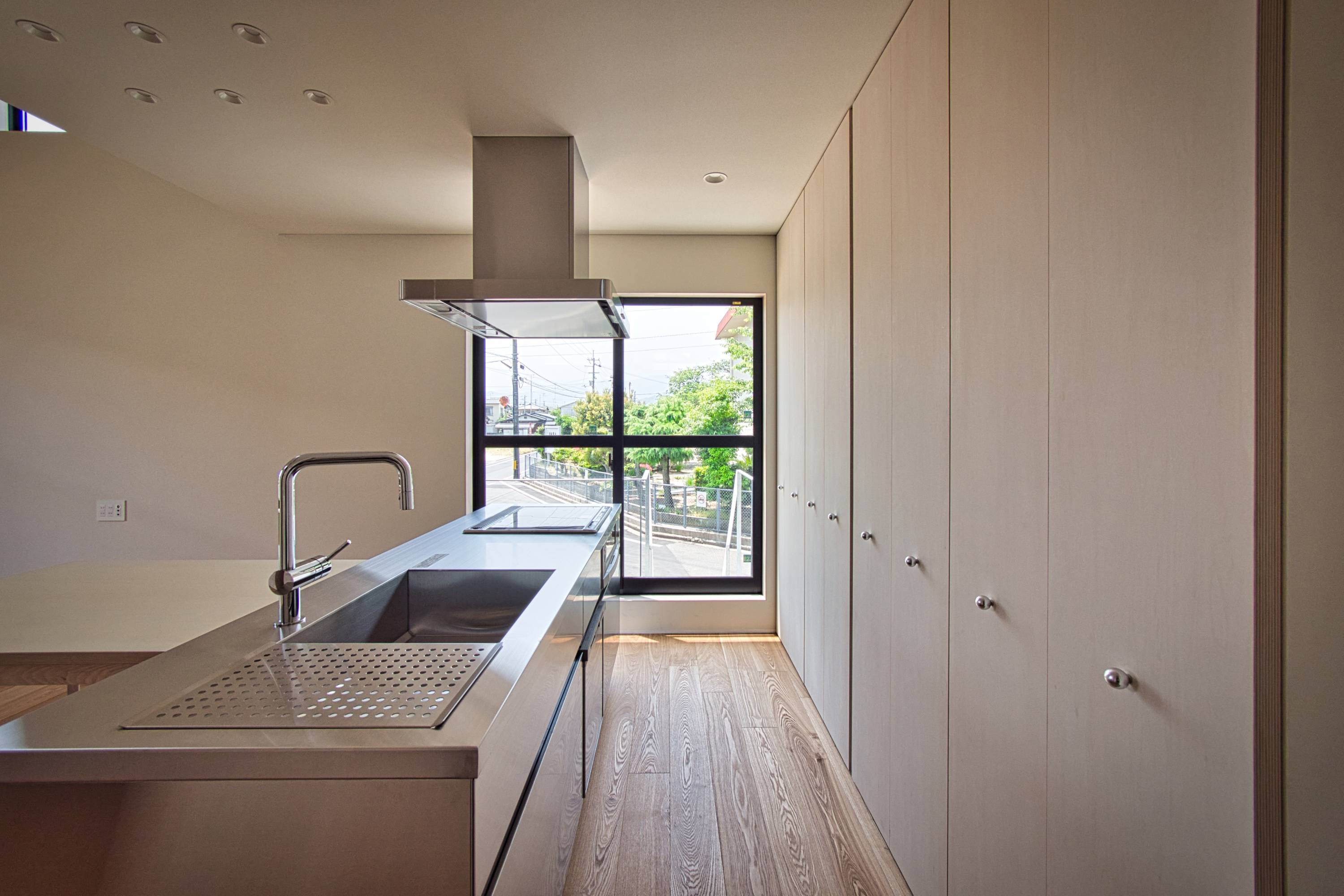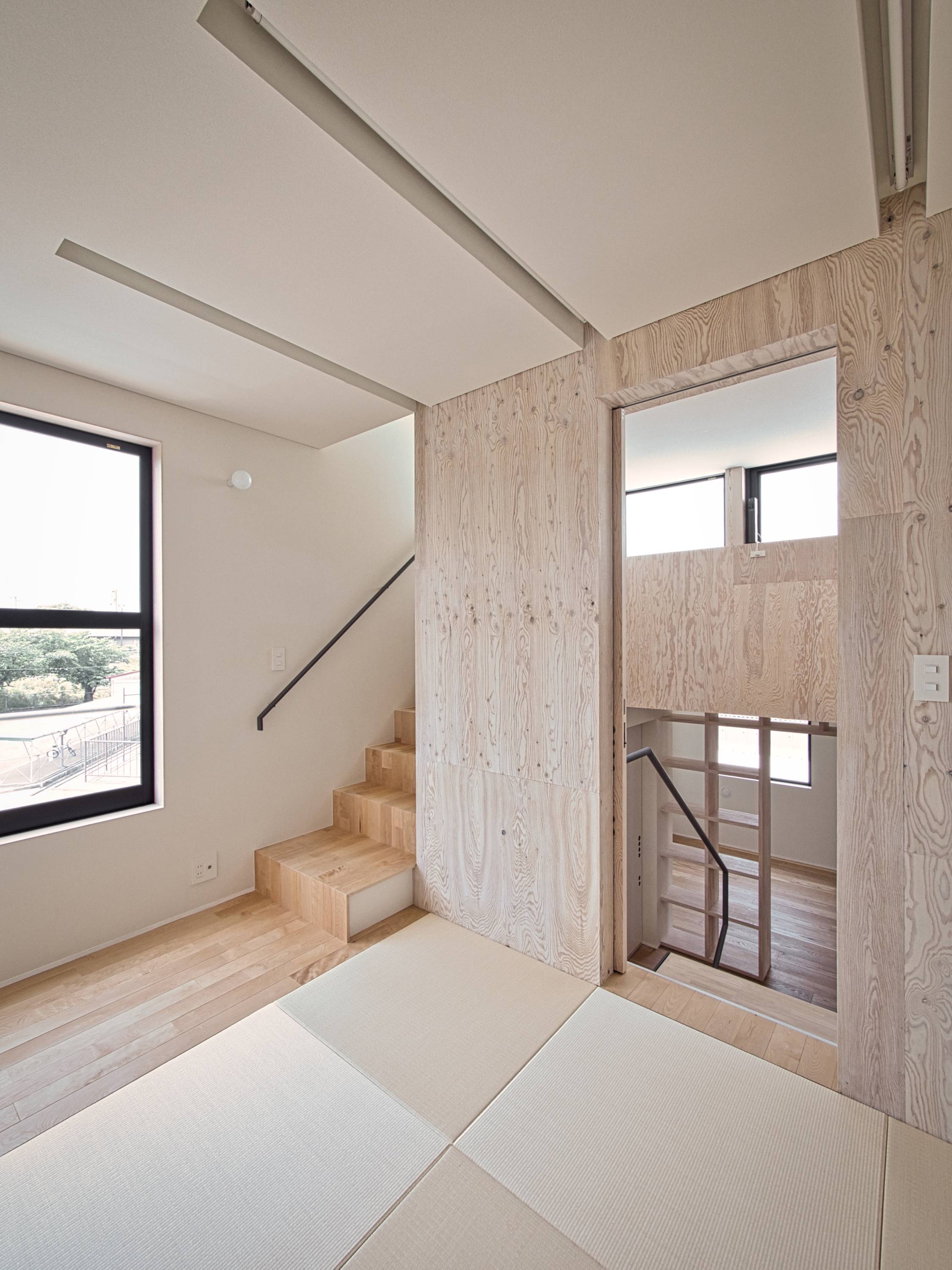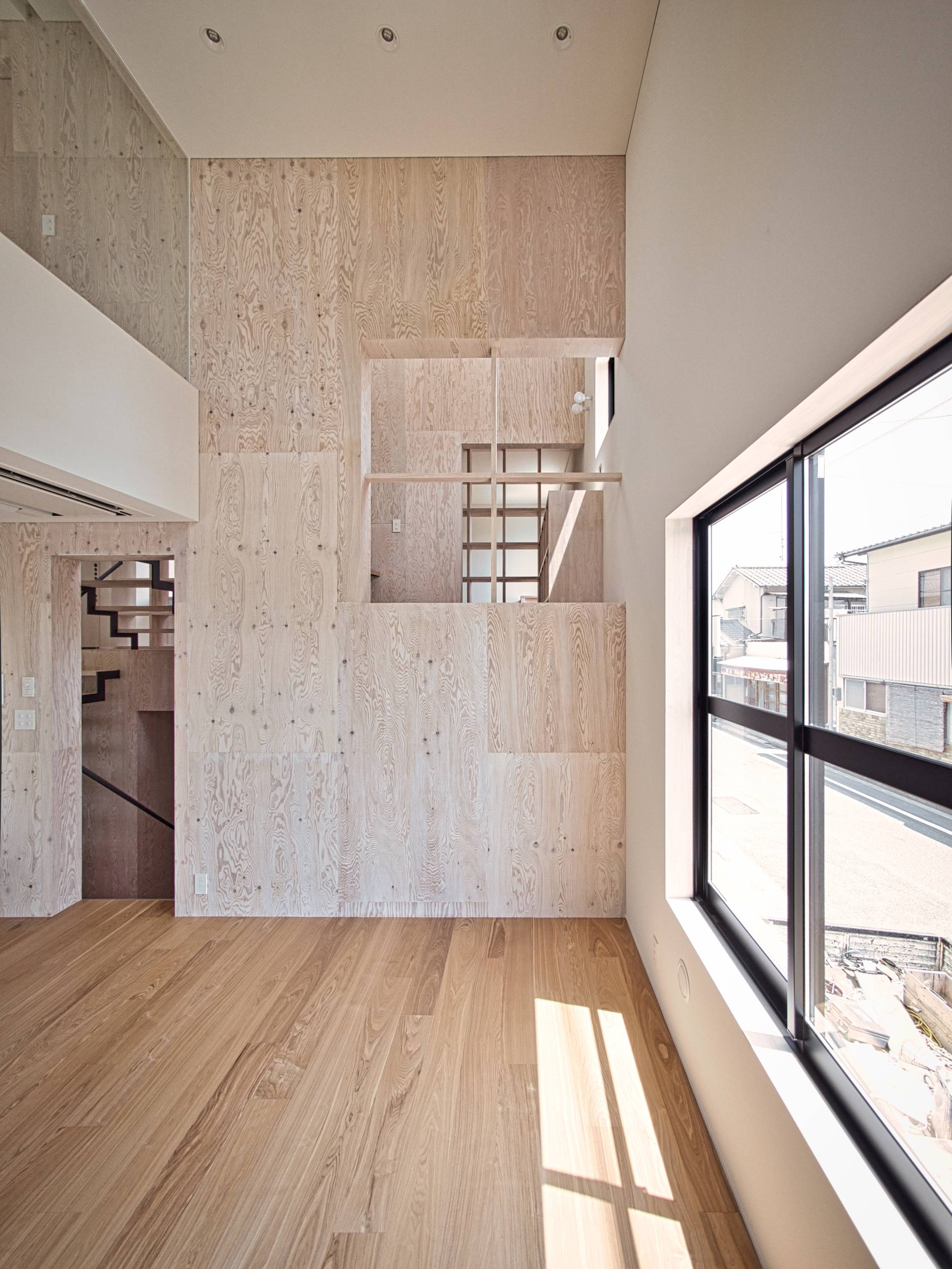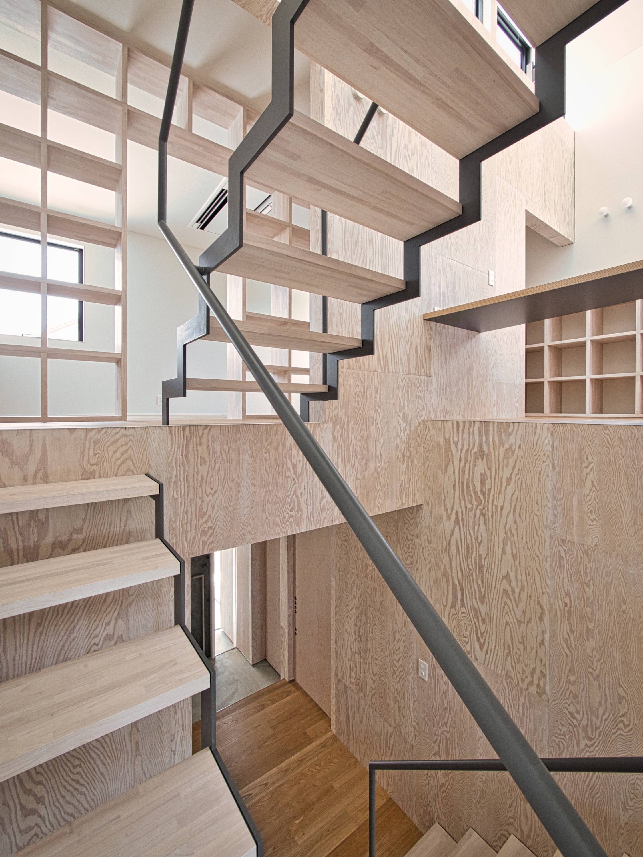 クライアントは、どこにいても家族がお互いに気配を感じることが出来るようなオープンな住宅を要望としてお持ちでした。家族のオープンな関係を外部の喧噪から守る考えていく必要を感じました。そこで、各スペースがスムーズに繋がっていくスキップフロアで構成された住宅を提案しました。要望でもあった大きな収納を床下収納で確保することで生まれたレベル差で、スキップフロアーの構成とすることにしました。道路から1.8mの視線のズレは、プライバシーを得ることができます。またスキップしたことで各フロアーは、連続した空間として意識させることができました。そして、2つの大きな木質の壁を通り抜けるように繋がっています。木壁を刳り貫いたような開口は、各フロアーにいる家族の気配を無限にフレームワークしていきます。