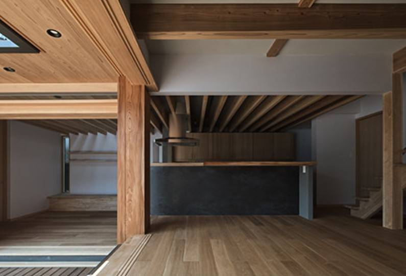 欅の尺二寸断面の大黒柱を中心に、レベル差を設けた田の字PLANを採用した田の字の一角に外部を取り込み、内部と外部を混在させ床高・天井高のバリエーションにより多様に変化する空間を目指しました。
