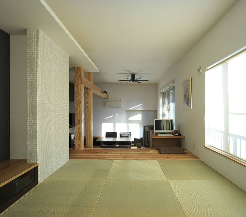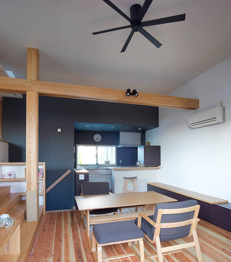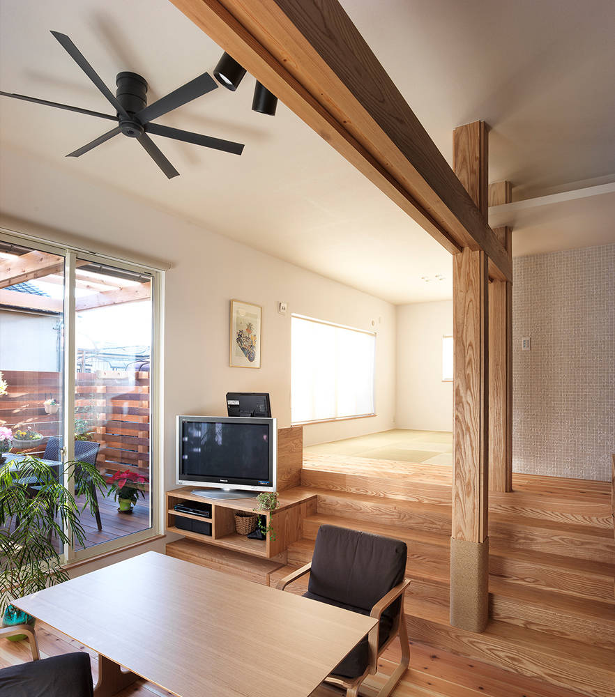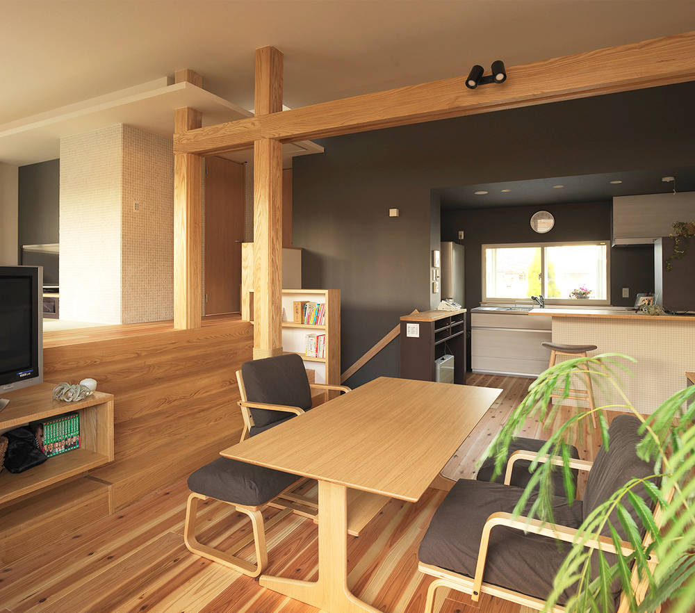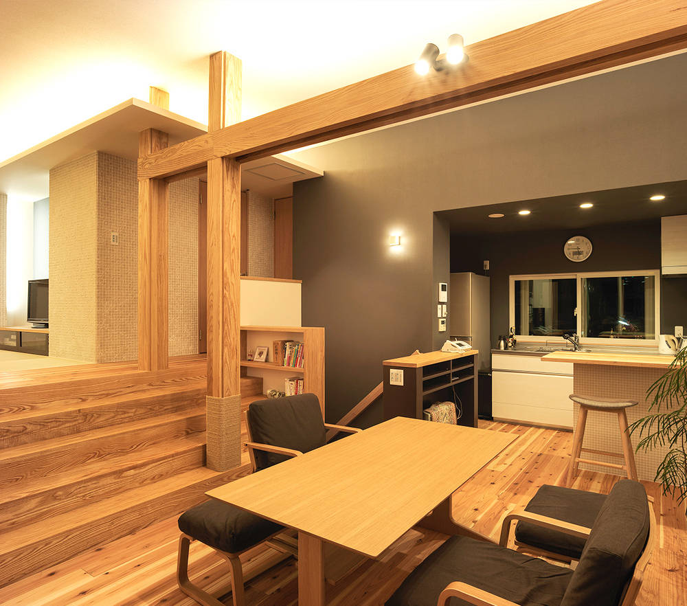 LDKでは、もとからあった床の段差を生かし、いくつかのスペースを用意することで、同じ空間に居ながらそれぞれが好きなことを出来るような空間構成にした。家中、どこにいても同じ温度で暖かくなるよう高気密高断熱工事を行い、あわせて耐震改修工事も行った。