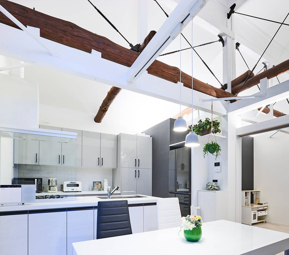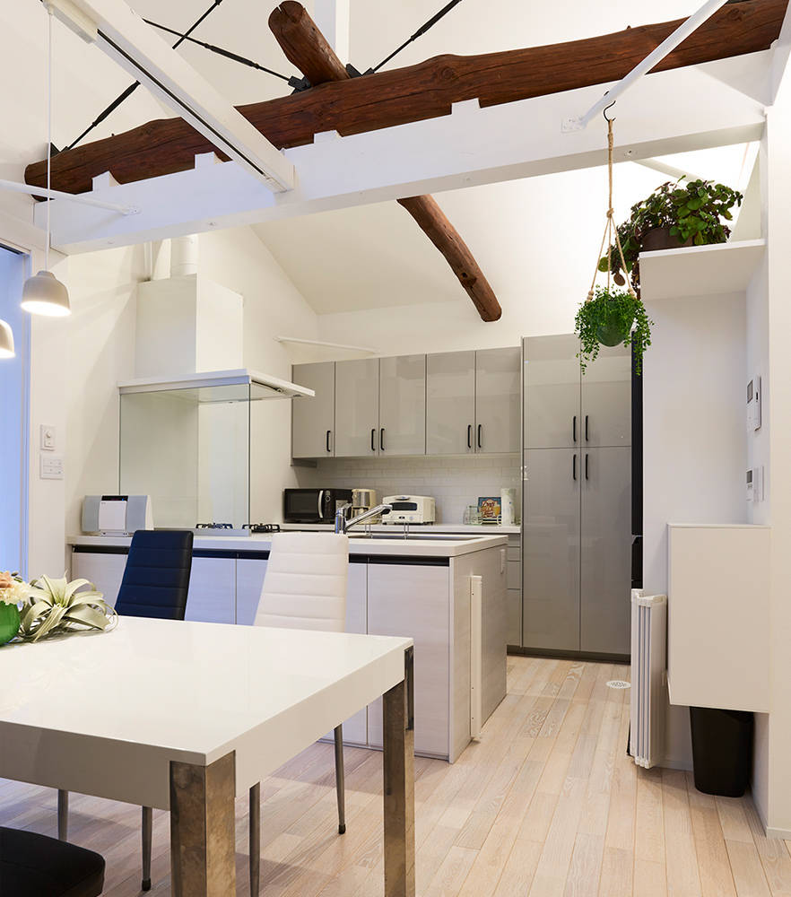 築80年近い木造平屋のリノベーション。若いご夫婦とお子様のための高気密高断熱住宅。古い柱、梁の撤去が難しかったので新設の木構造と一体にすることで耐震補強を行った。またそれを生かしたインテリアにしている。