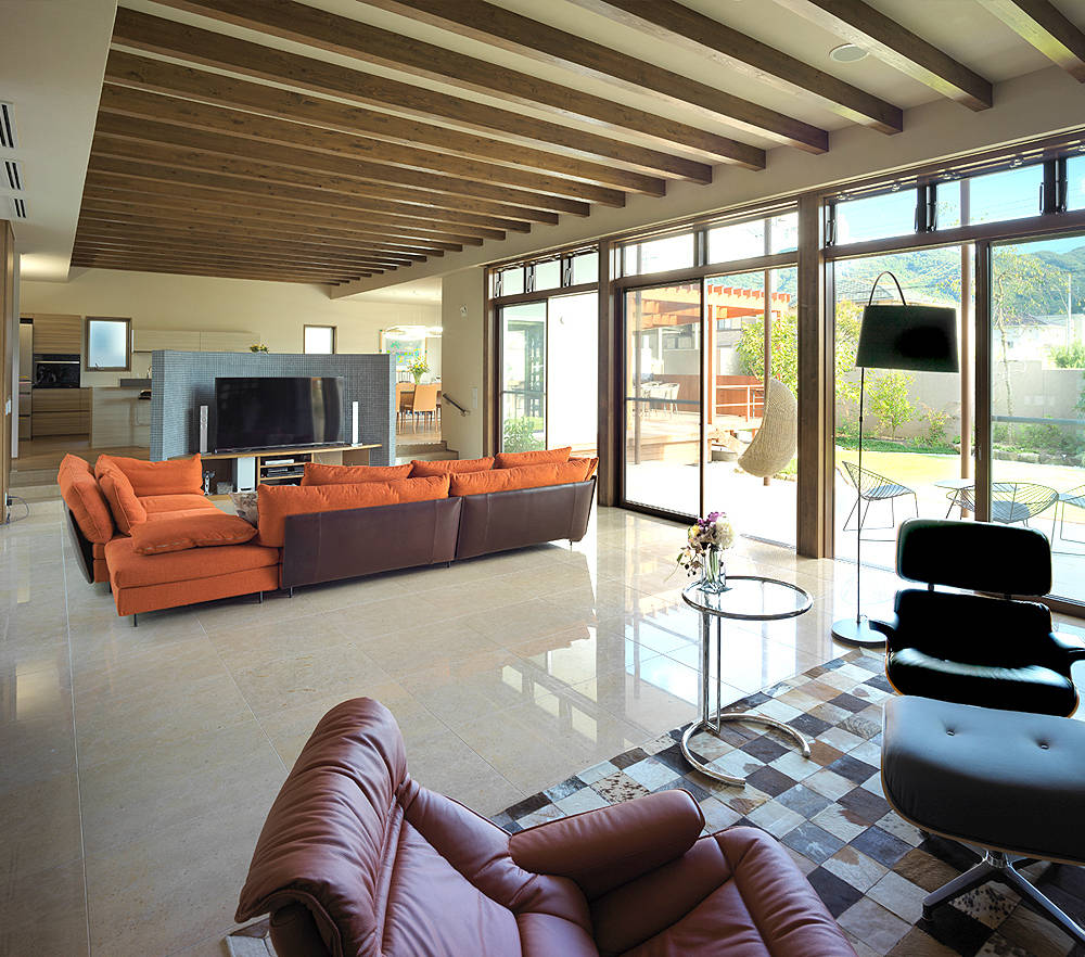 庭に突き出たテラスはダイニングスペースとして、BBQスペースとして欠かせないものになっていて、毎朝鳥たちも食事に訪れるという。大きな庭と中庭に囲まれたリビングには暖炉とオーディオコーナーが置かれ、普段お忙しいご夫婦がゆっくりとくつろげるコーナーになっている。