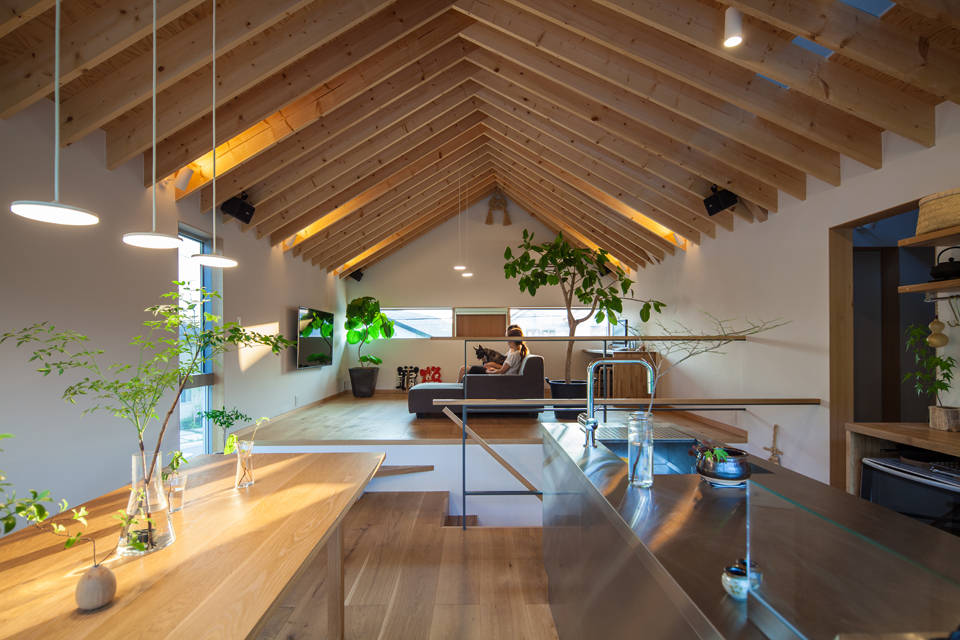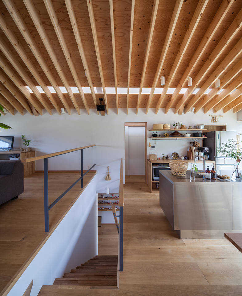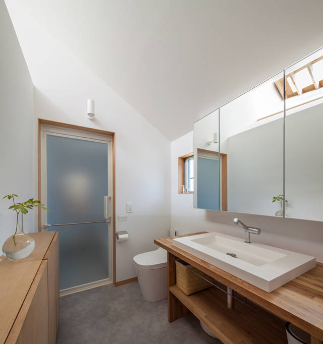 屋根にはスリット状のトップライトをとり、LDKだけでなく、北側の洗面室や趣味の部屋も自然光が入ります。
