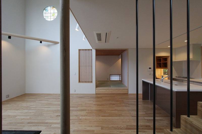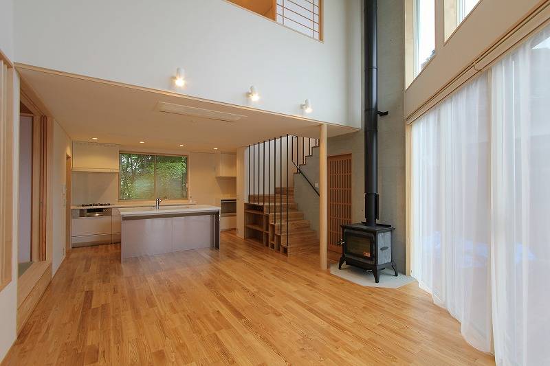 杉木立と竹薮を背にして、入母屋瓦葺の平屋と切妻2階建て住宅が東西に建ち並ぶ。既存の平屋住宅に渡り廊下で繋がっていた2階建ての部分を取り壊し、新たに2階建て木造住宅を増築し、既存部分の浴室を共有する2世帯住宅となる。