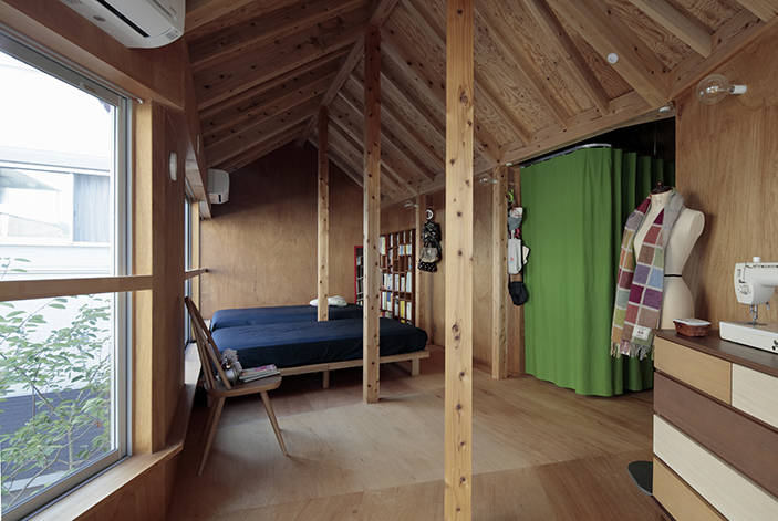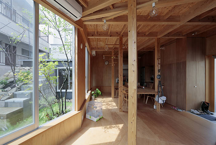 庭には建設発生土で作られた、フェンス、ベンチ、花壇、階段など様々な形をした版築の構築物を設置し、生活を外部に拡張しています。この構築物は1階と2階を動線的に繋げると共に、隣接する建物や道路などをも巻き込んだ立体的で多様な関係を作り出します。