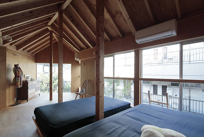 最寄り駅から続く緩い坂になった生活道路の先に見える敷地は、道路境界線の中央に電柱が立つ五角形の変形地でした。そこで電柱を中心に建物を二股に割り、一方のボリュームを道路や電柱・送電線から成る都市環境の軸に沿わせ、大開口が設けられたもう一方を真東を向いた自然環境の軸に沿わせ、朝日と山脈への眺望を室内に取り込みました。