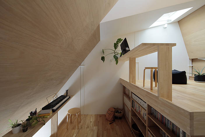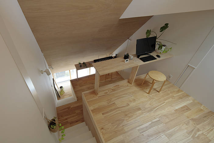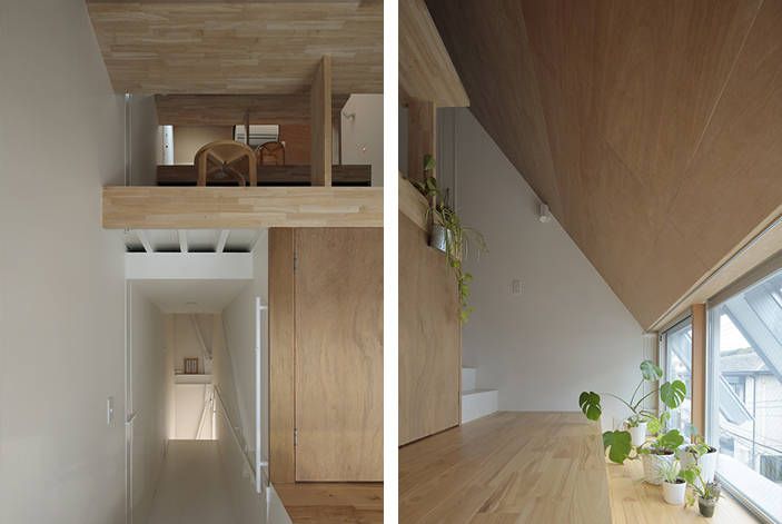 1:0.625勾配と1:1.25勾配の2つの斜線に挟まれた3階では,斜面地に建つような段上床で出来た居場所を南側ハイサイドライトから北側地窓へ抜ける山から海へ吹き下ろす風が通り抜けます。