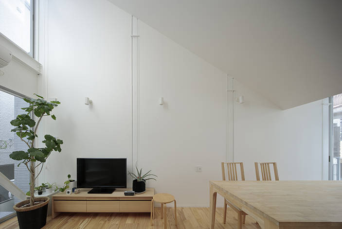 この住宅は道路斜線制限による1:1.25勾配の斜線と冬至の南中時太陽高度からなる1:0.625=32°(≒31.92°)勾配の2つの斜線が断面に現れており、両者の差分がこの住宅と環境との接点となっています。