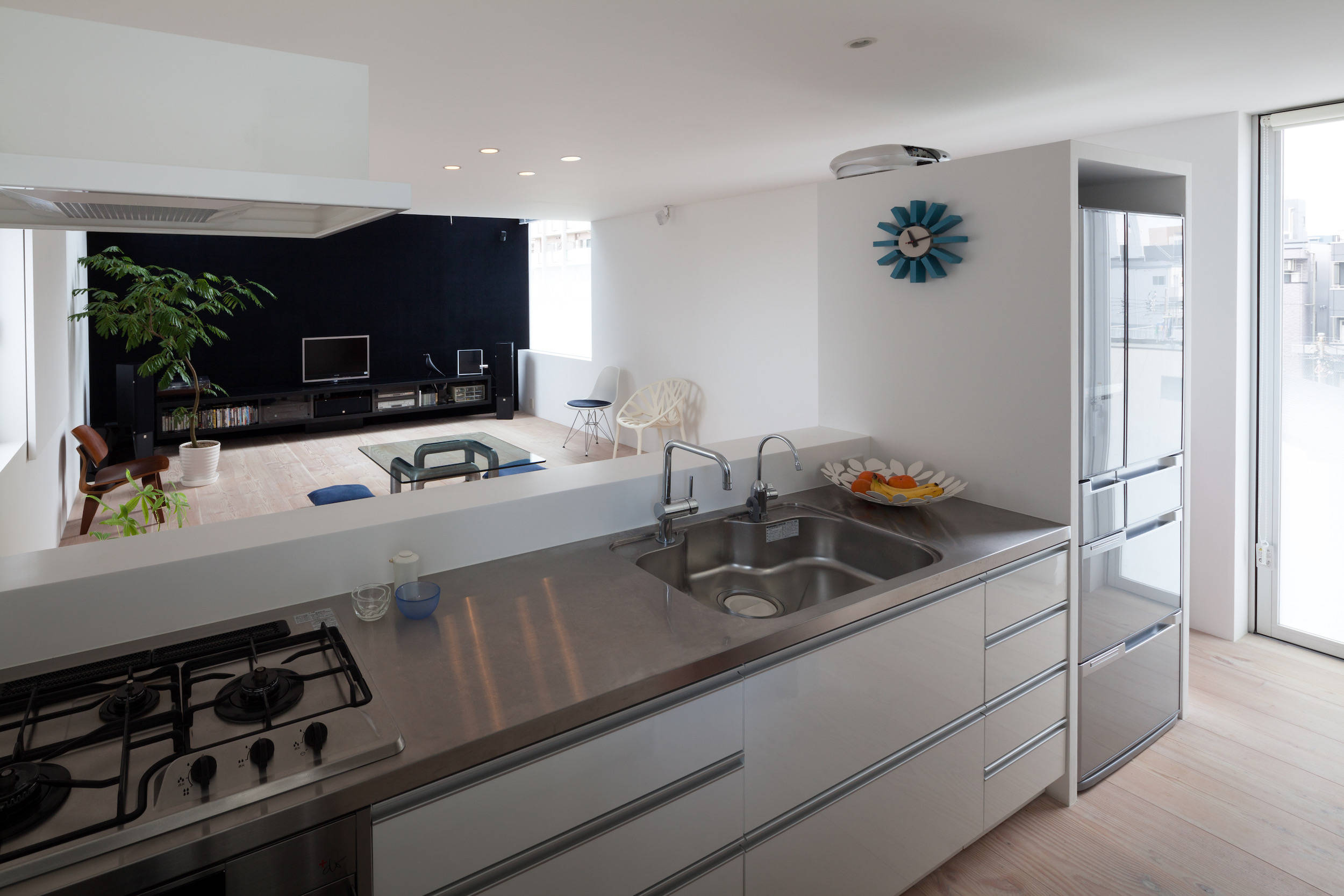 敷地の前面道路が4車線の交通量の多い道路なので、車の騒音と振動を軽減しながら、住宅は縦方向の生活を楽しめるようなプランで、風抜けがよく明るい住宅を目指しました。