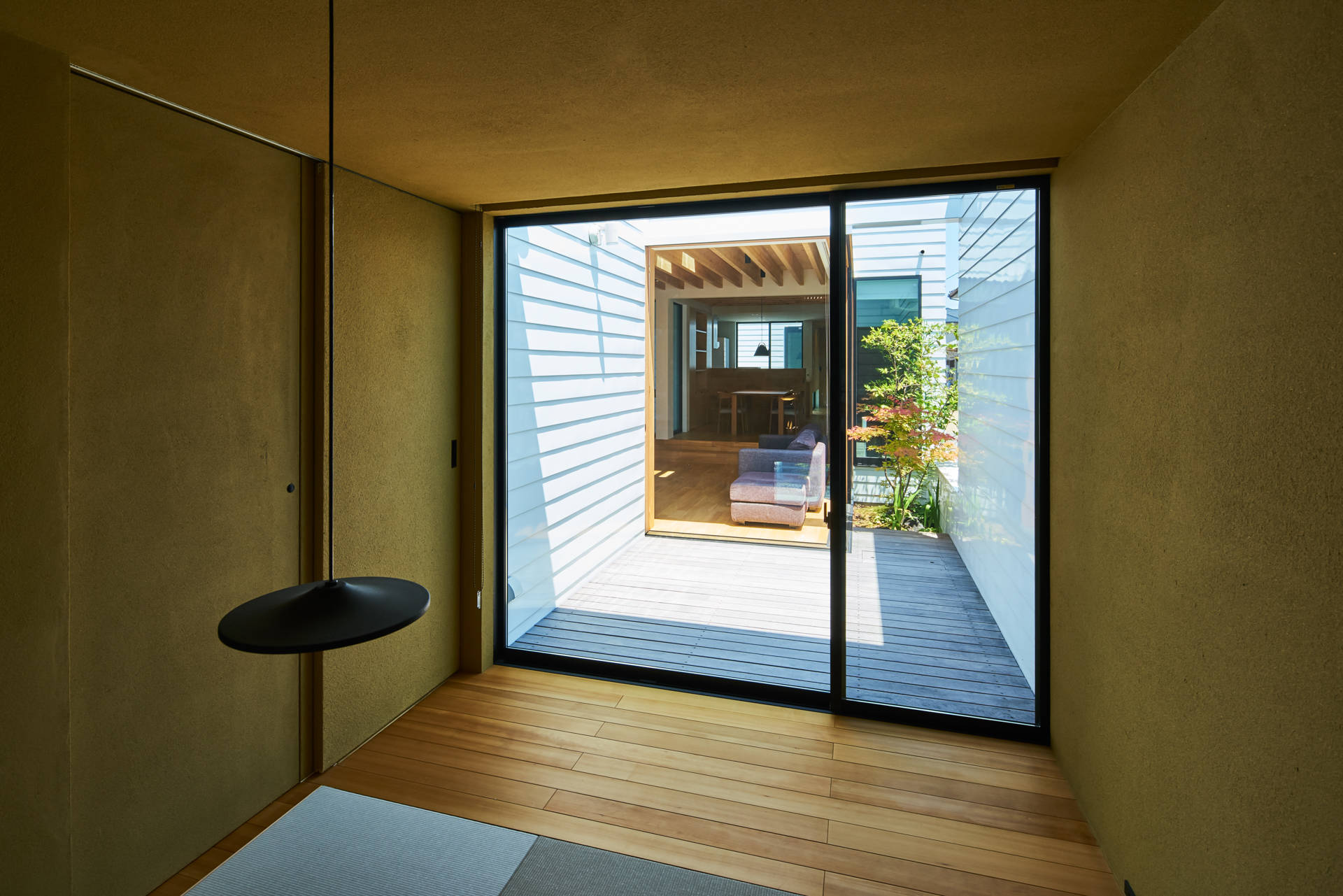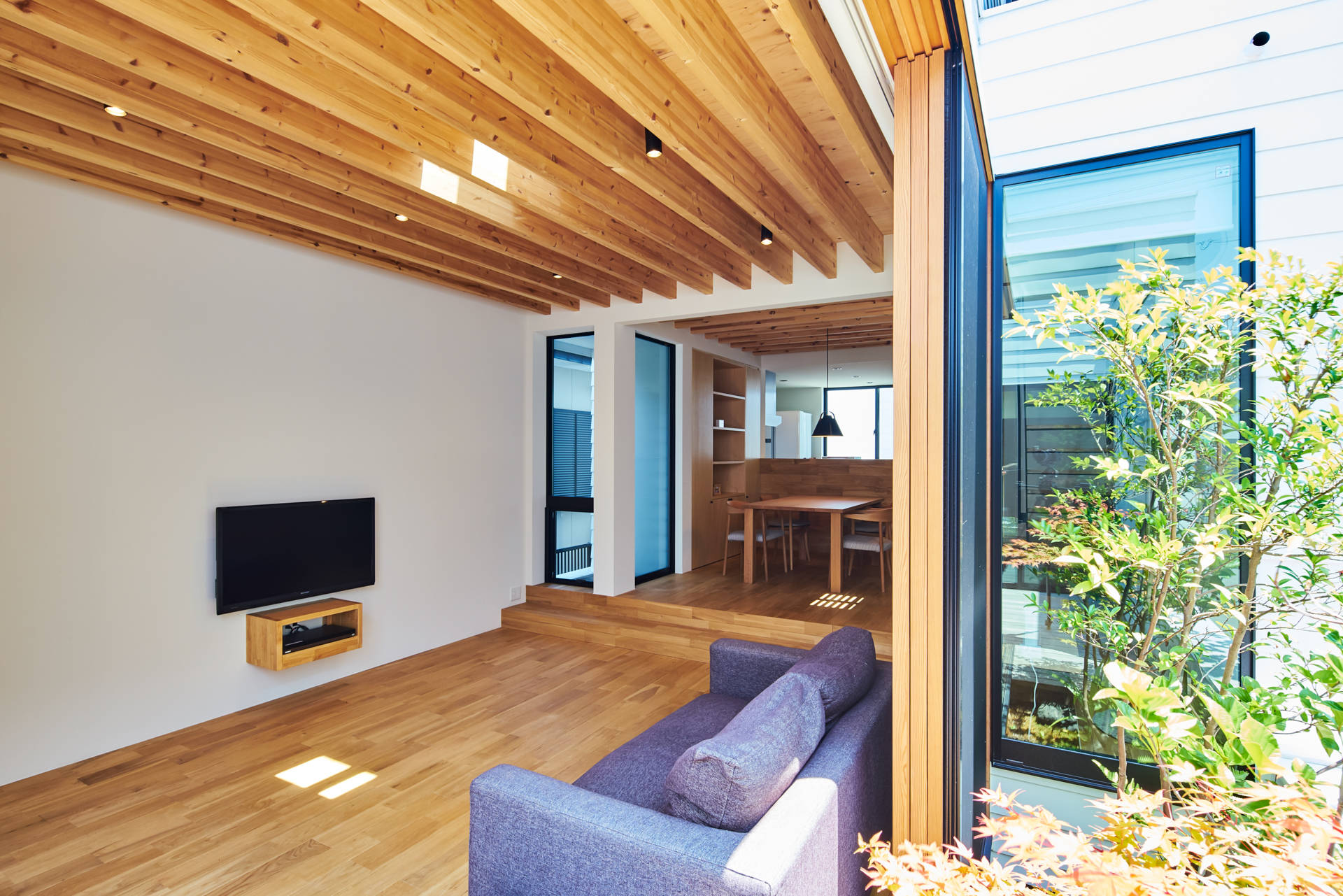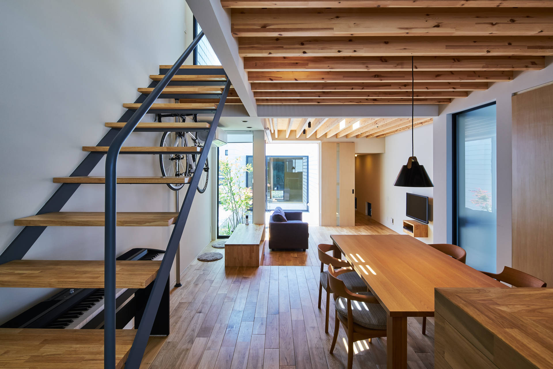 間口6m、奥行32mの細長敷地を活かし、中庭、スキップ空間を取り入れたひと繋がりの家。