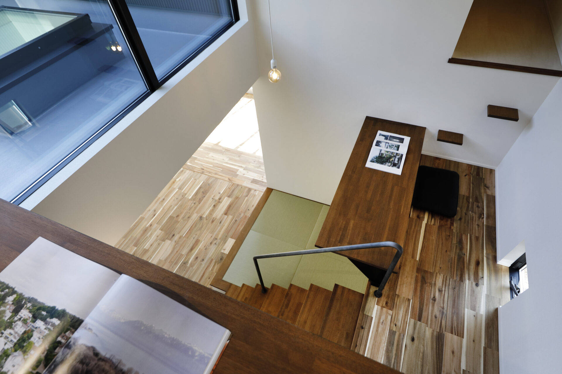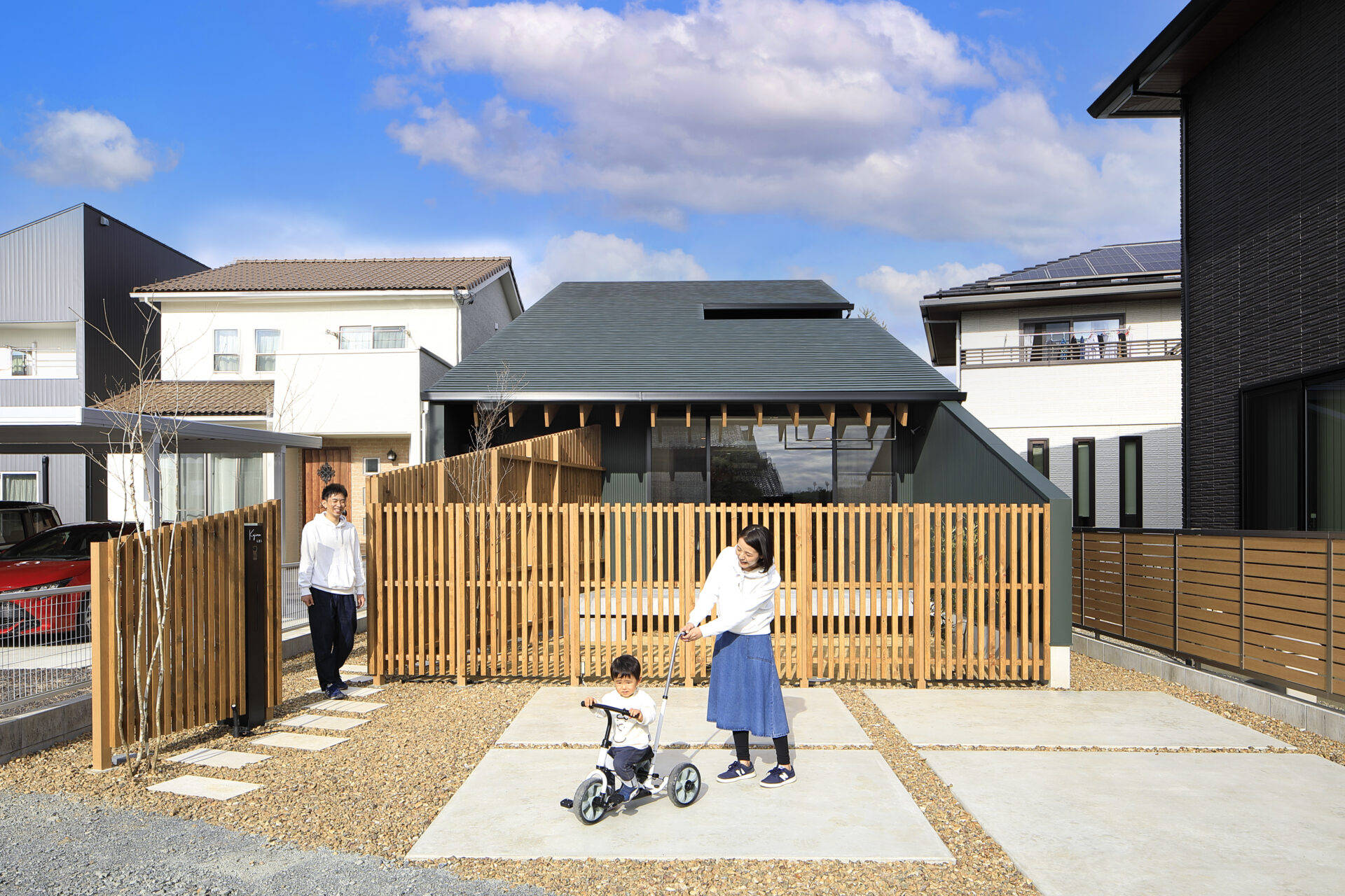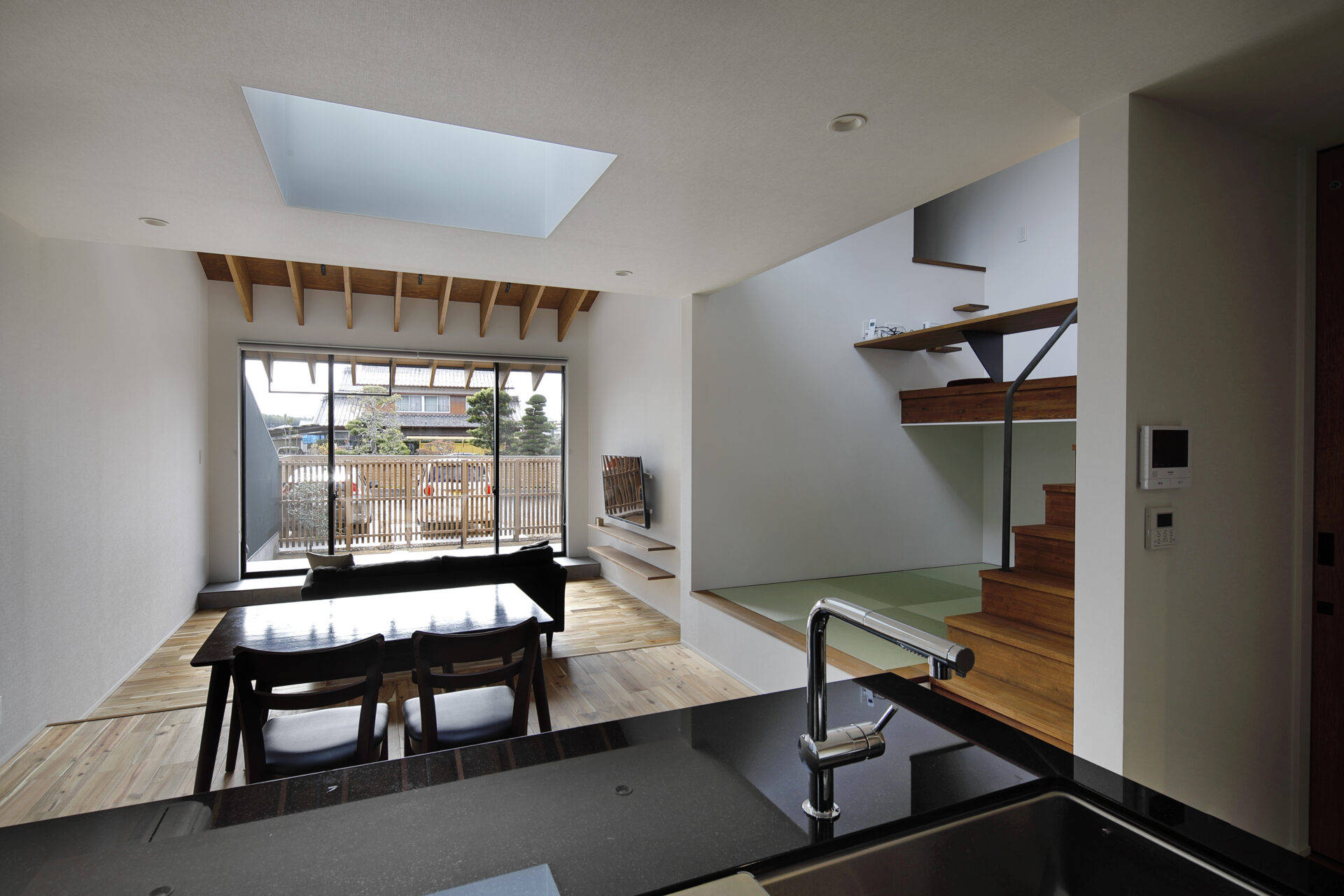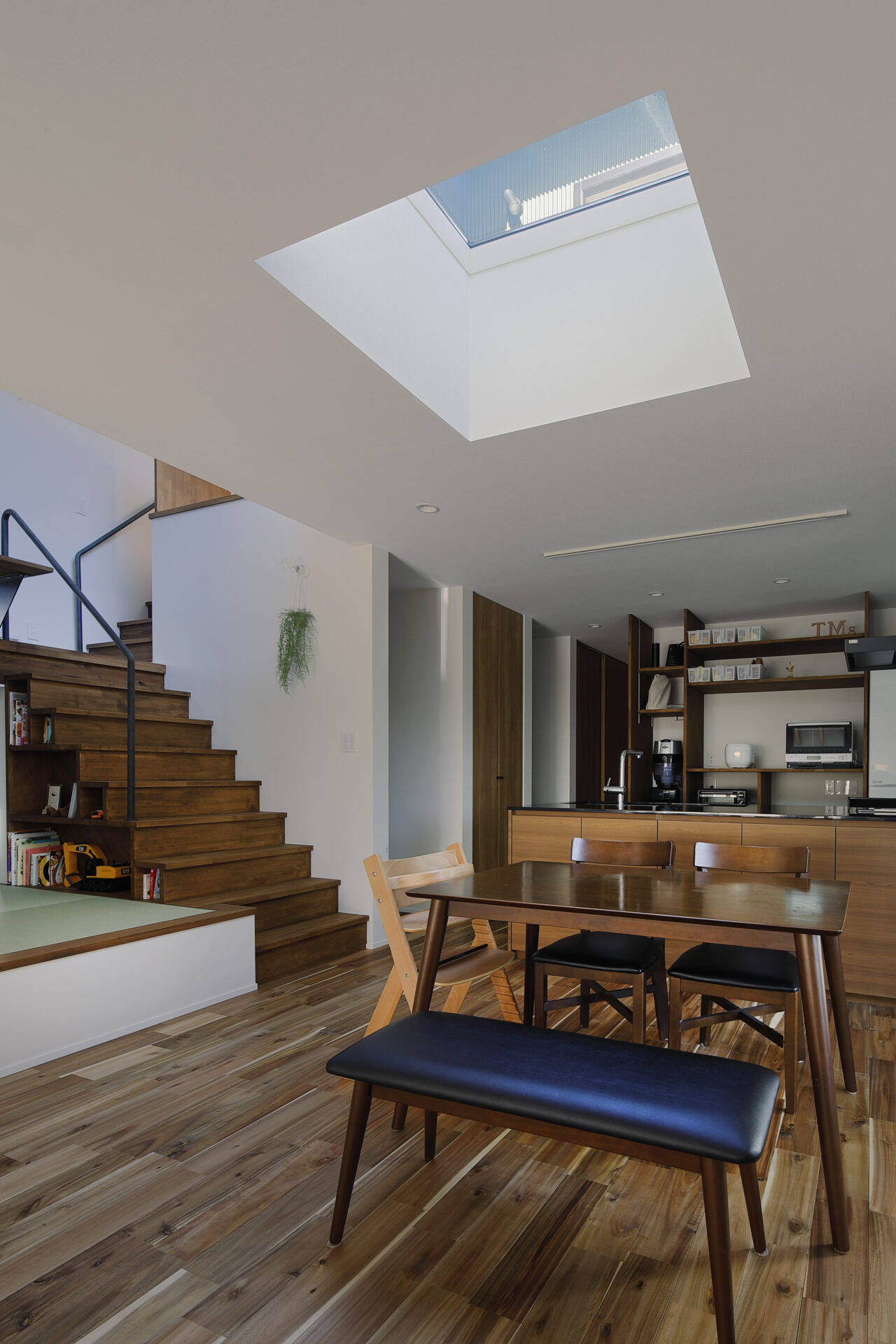郊外の住宅地の一画にあり、隣地との関係を踏まえて、ブライバシーの高いテラス空間を中心とした、スキップ空間のある住まいの計画です。1階はLDKと寝室、2階は子供部屋の構成となっており、将来は、1階部分のみで生活が完結できる仕様としました。タタミゾーンとホビーゾーンがスキップ空間にて構成されており、リビング、ダイニングキッチンや子供部屋が、ゆるやかに繋がった一体空間になっています。