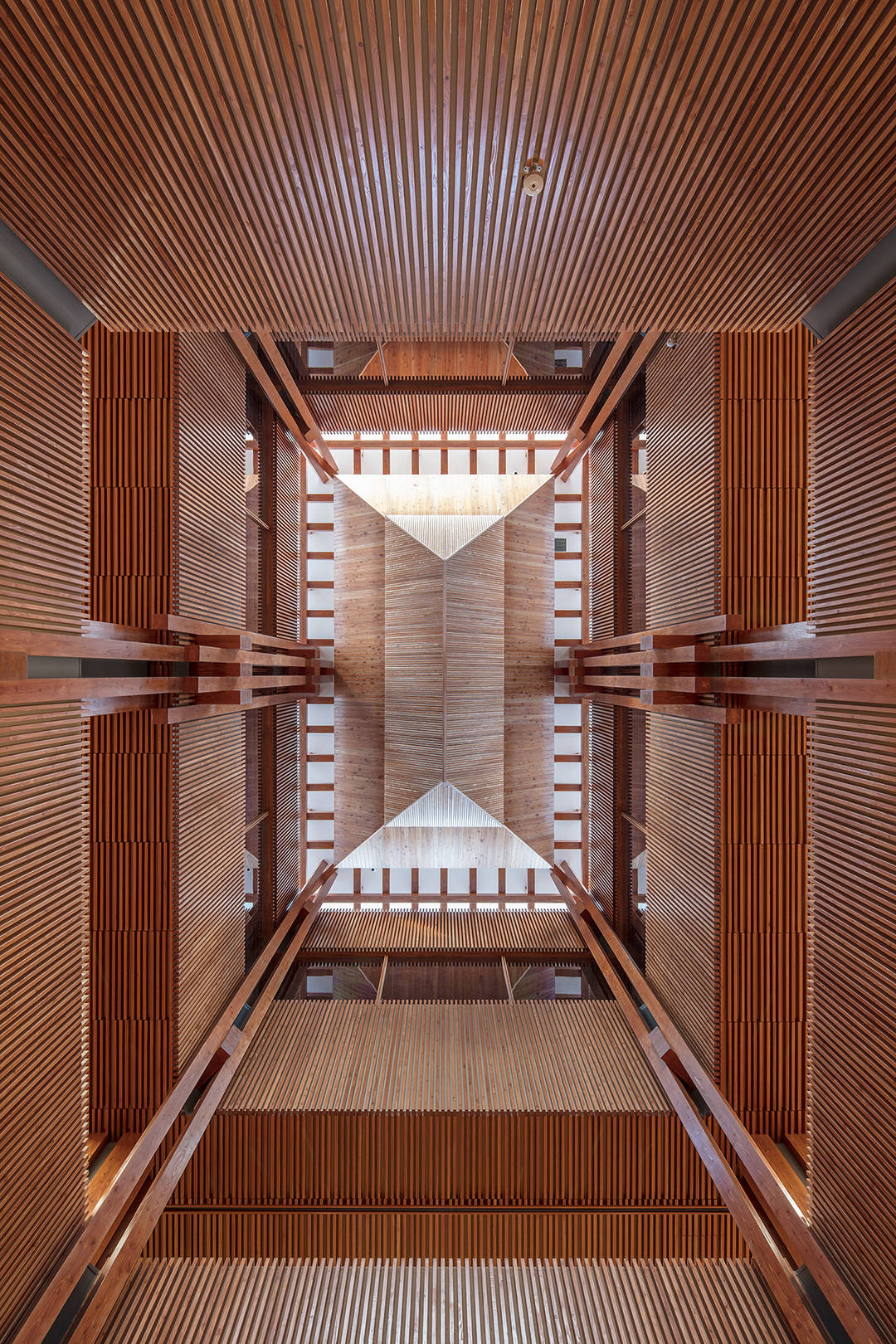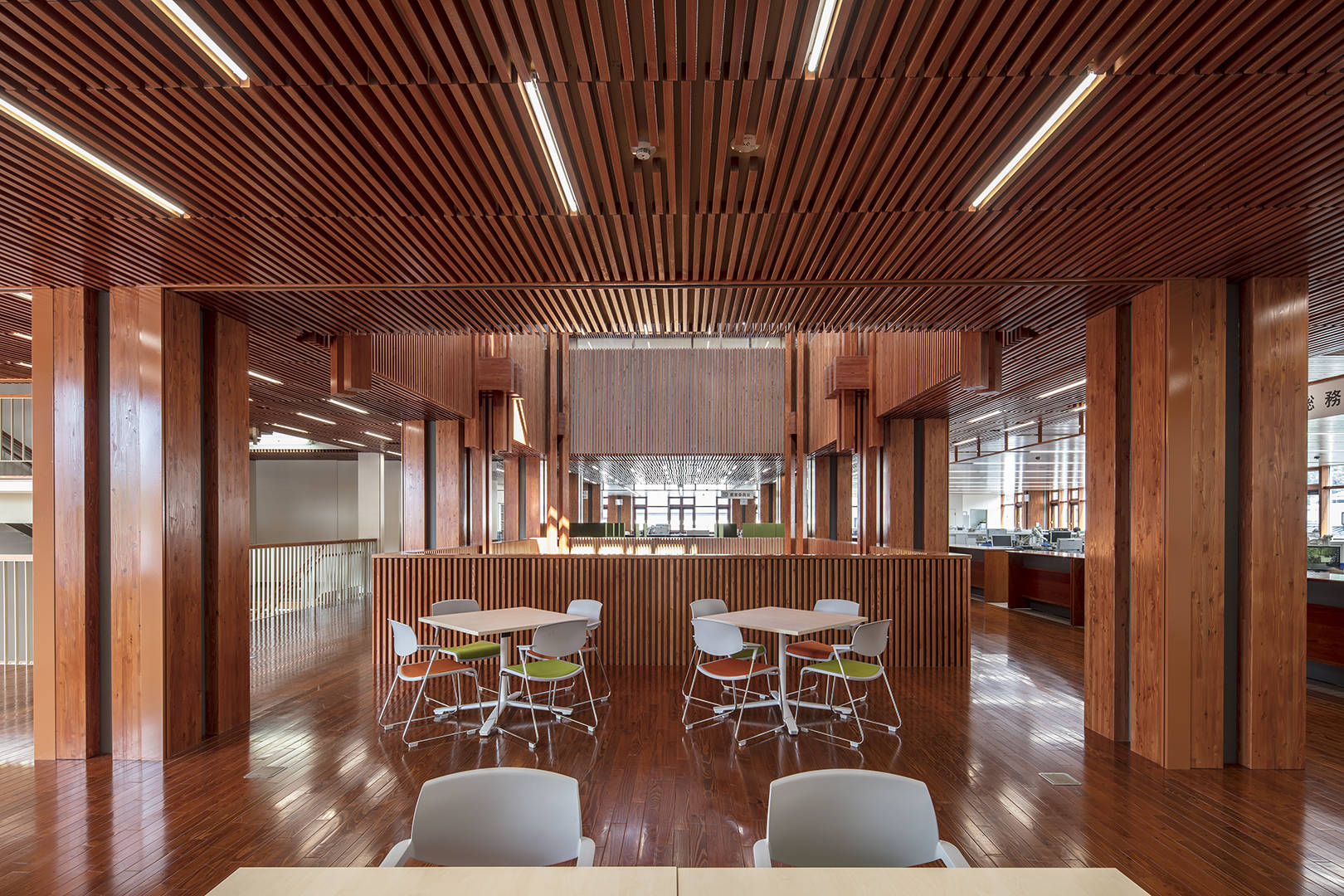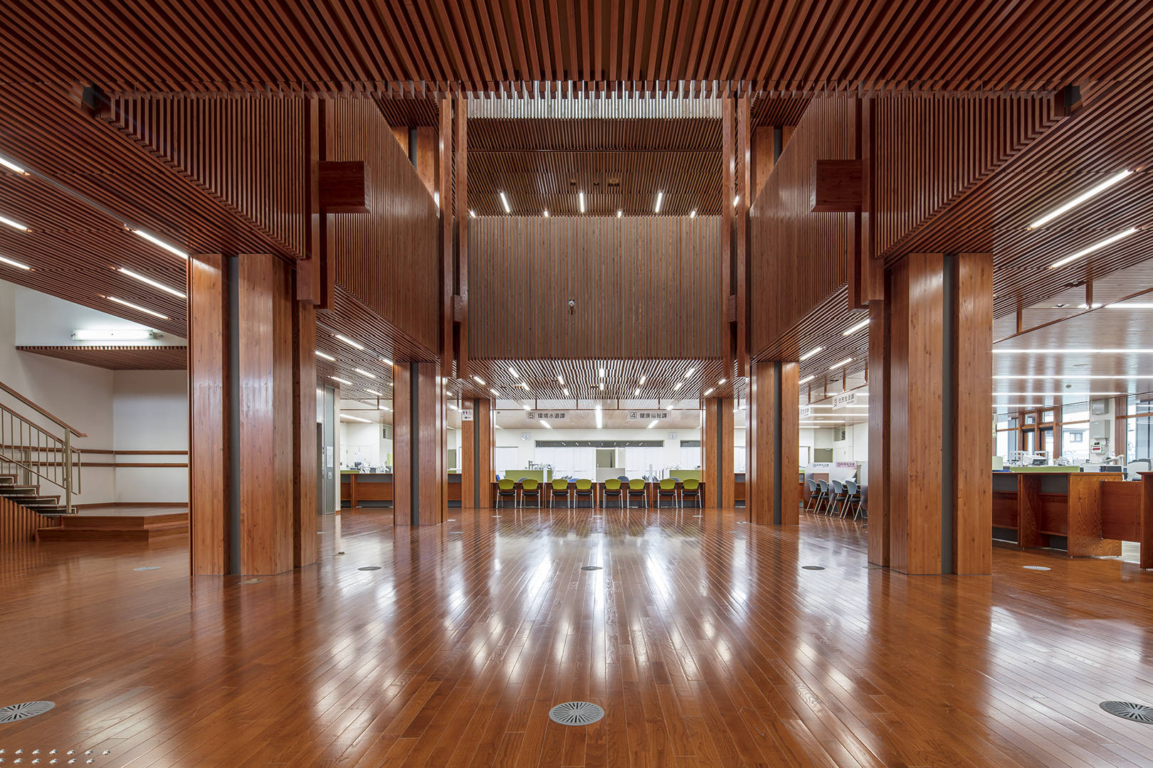 中央の吹抜は、この地域に根付く文化である田島祇園祭の山車、農村歌舞伎小屋の軸組のイメージを取り入れており、地元の職人の熟練した技術が存分に活かされたダイナミックな空間です。広葉樹を含めた11樹種の南会津町産木材を内装および家具にふんだんに使用し、木の温もりに包まれた空間となっています。庁舎そのものが町の産業を魅せる拠点、「ショールーム」として機能しています。