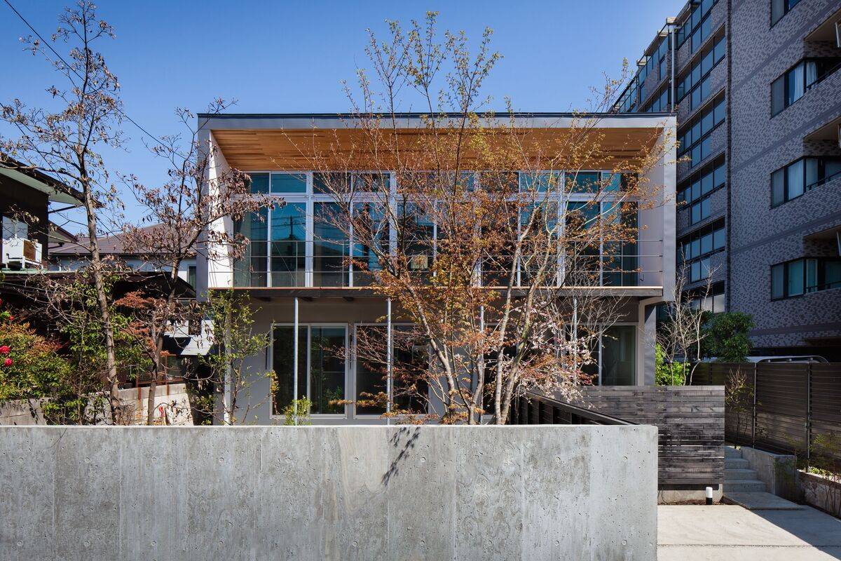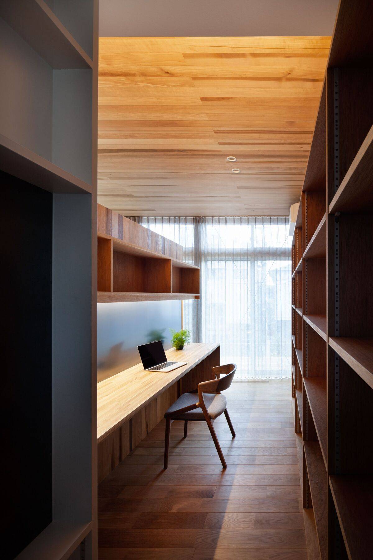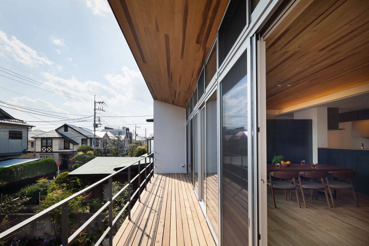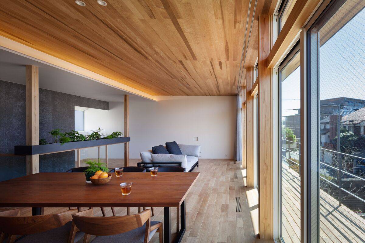 幅9mの大きな窓でデッキテラスに開いたLDKとワークスペースのある家、素材感のあるサステナブルな材を使った簡素で普遍的な住まい