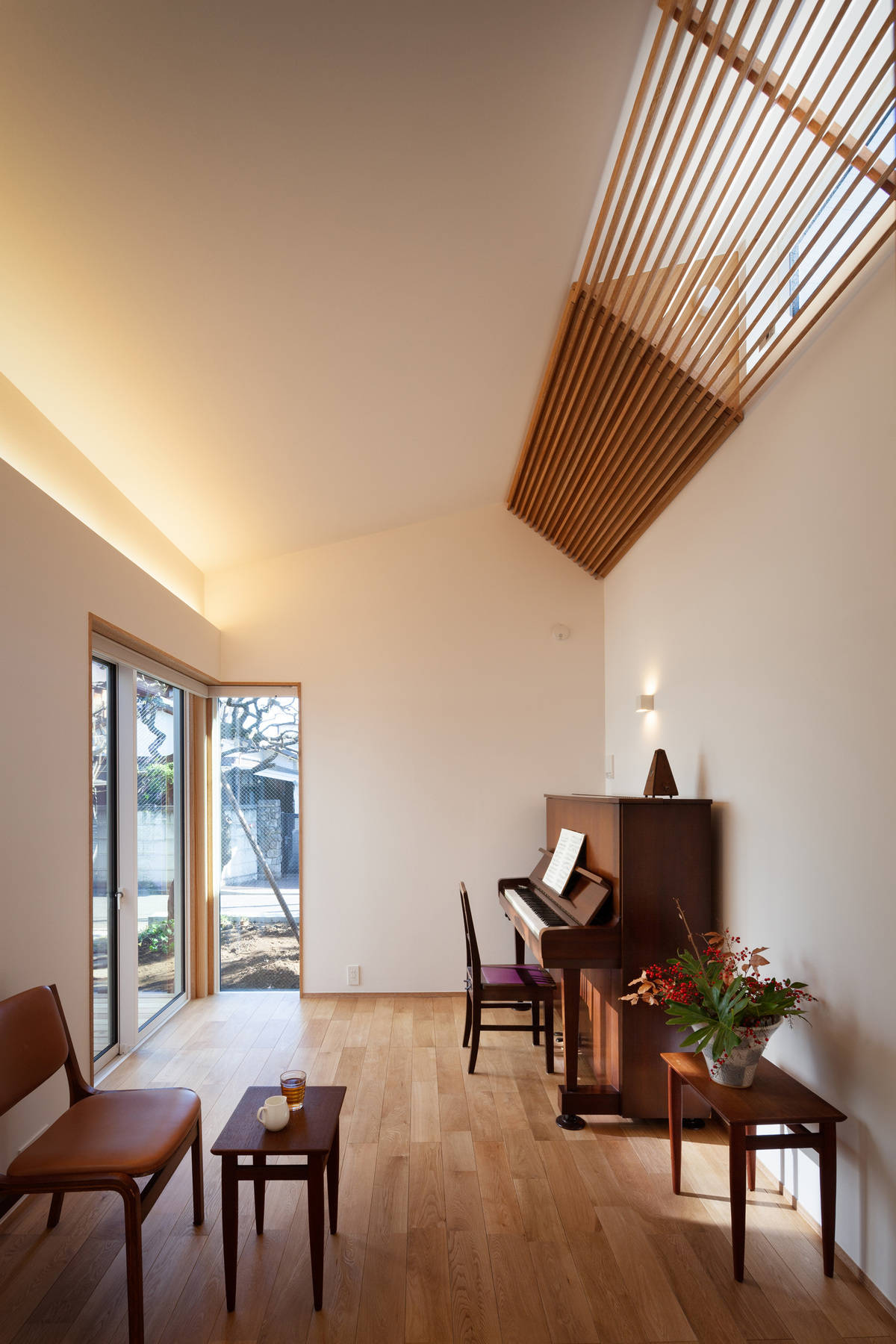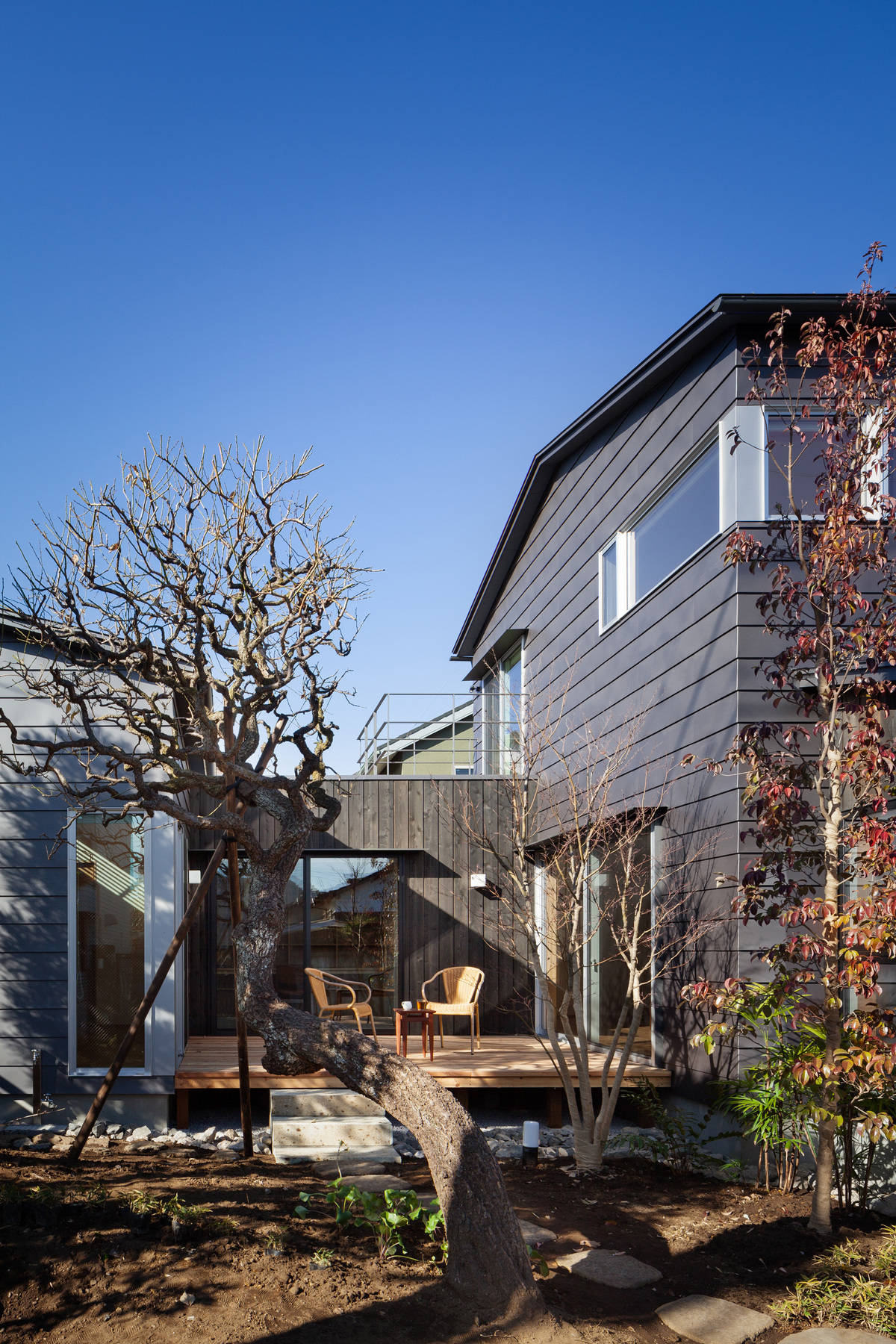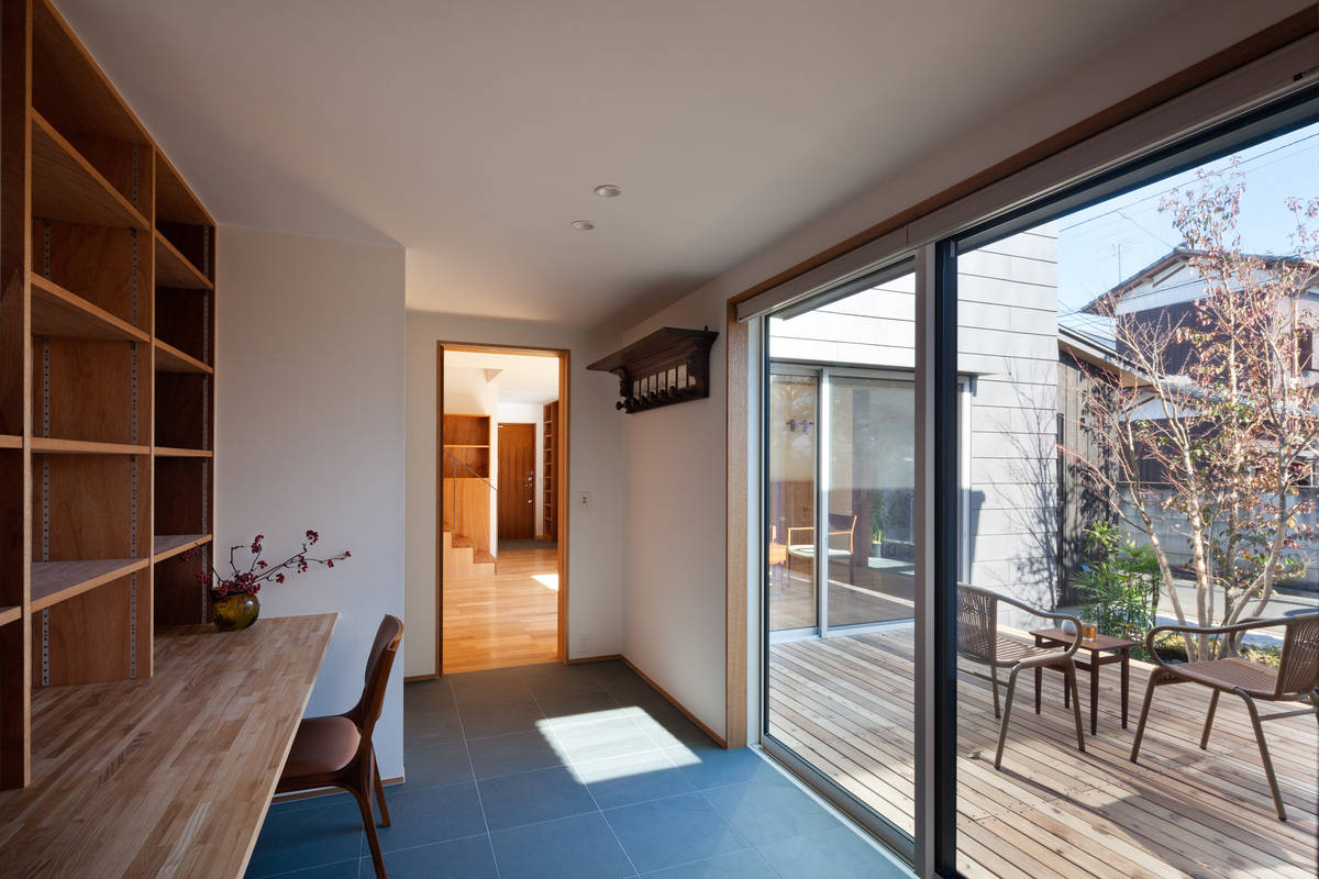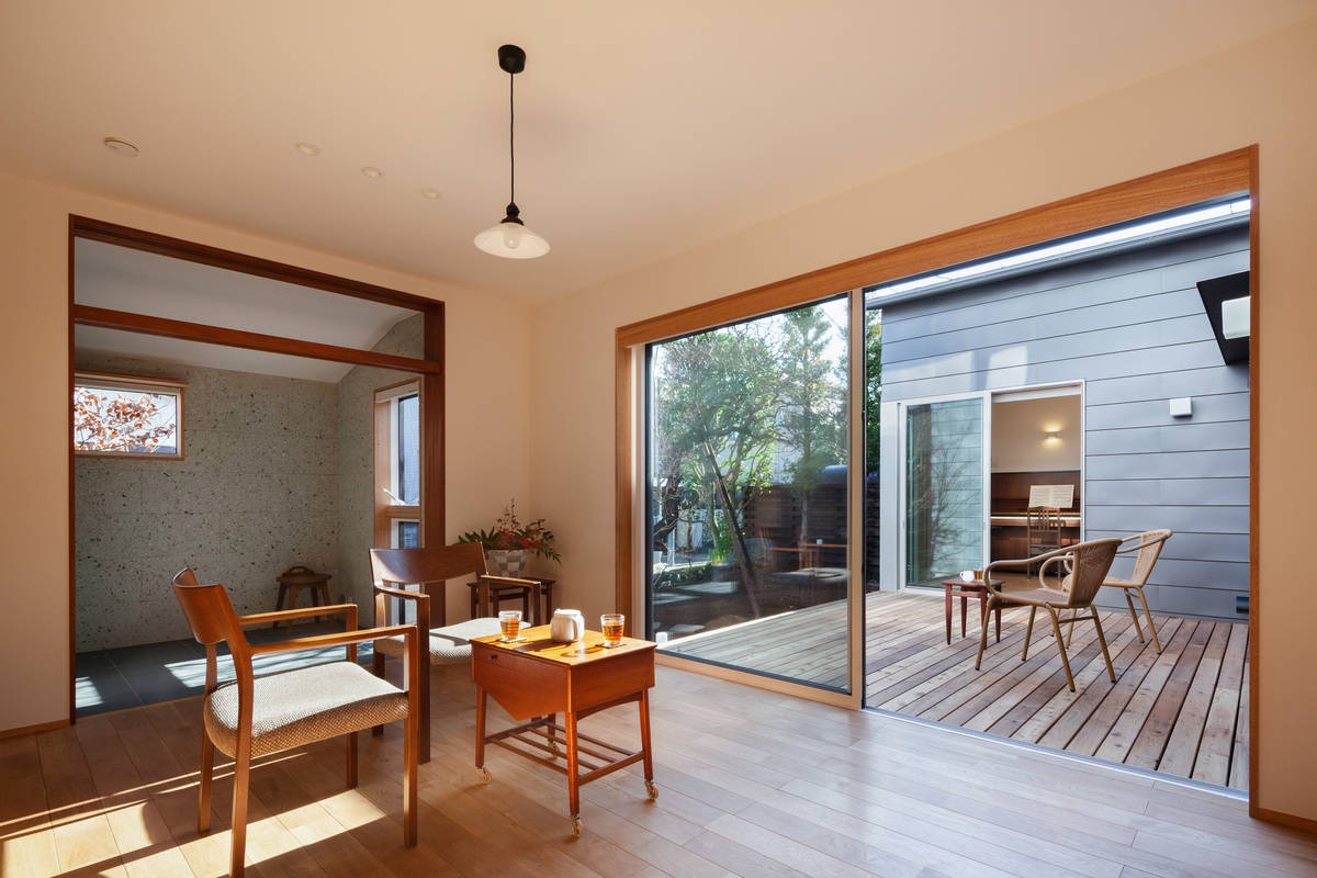 ご両親から引き継いだ庭(樹齢60年以上の梅等)と中庭デッキを地域に開く。生まれ育った家で使われていた建具も利用し、暮らしも引き継ぎながら、人が気軽に集える暖かな家。