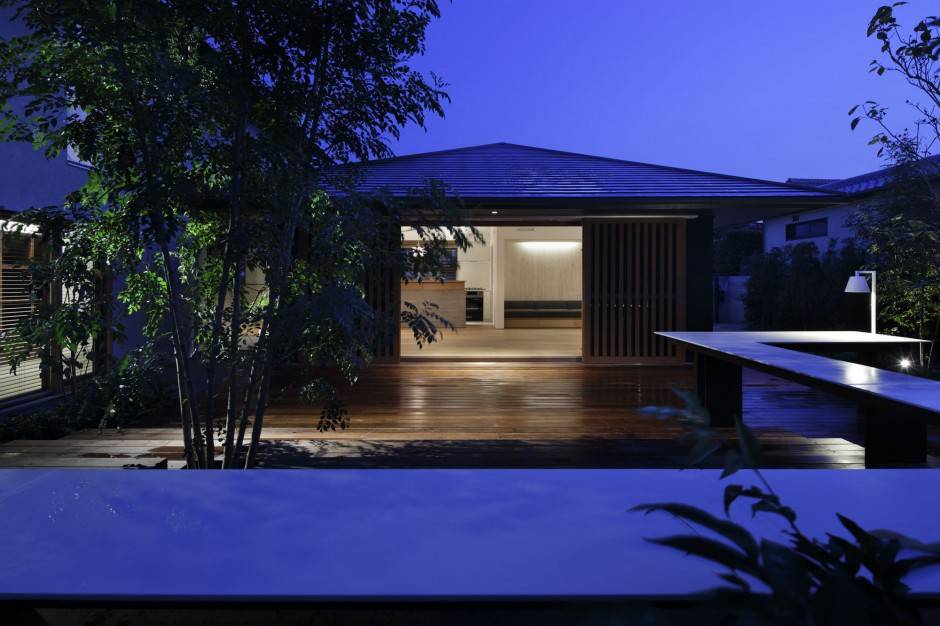 全体としては1棟なのだが、すべての機能を1つのボリュームにまとめると街に対して大きくなりすぎるため、またパブリックとプライベートを割とはっきりと分けたいという要望からリビング棟と個室棟の分棟に見えるように設計しておりそれぞれが違う場所に感じられるように仕上、ディテール、スケールを変えている。また、デッキ・庭を含めて部屋の延長として考えてそれぞれの部屋から性格の違う庭を眺めることができ、庭と建築を含め一体的なデザインを目指した。