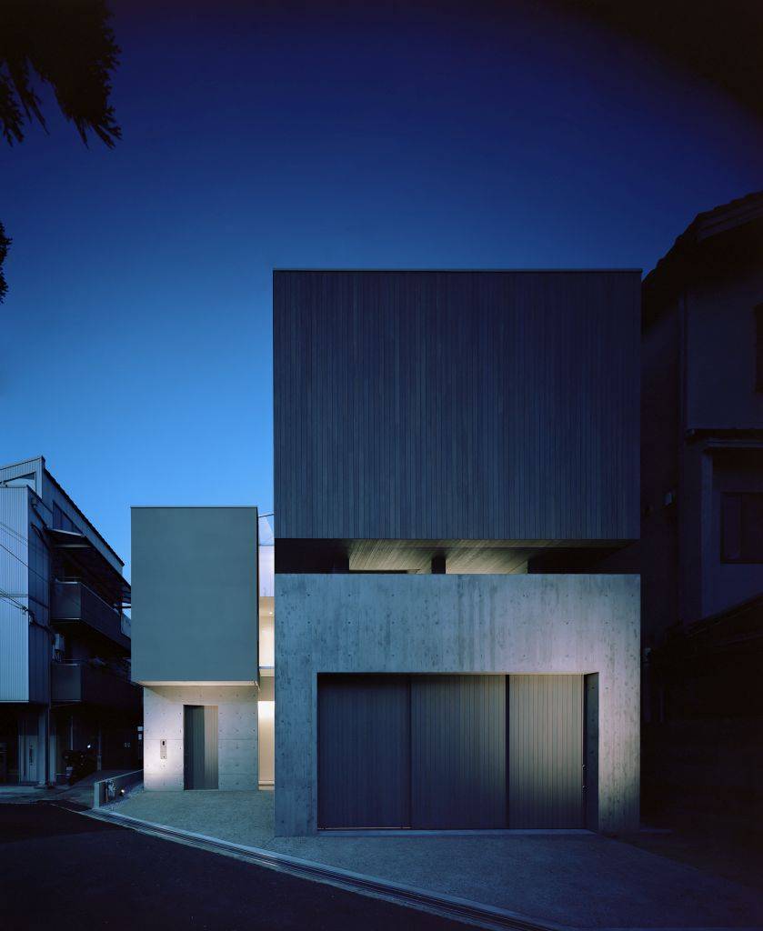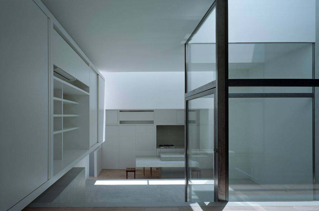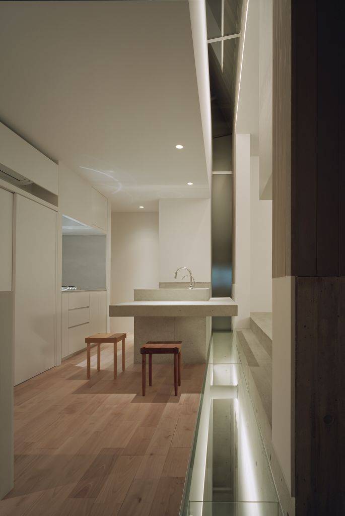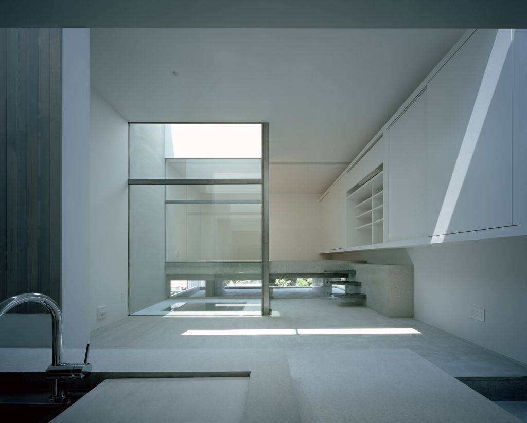 この光庭に落ちた光は、床のガラスを通じて1階のガレージまで届くようになっており、 箱と箱の間の隙間だけでは足りない光量を補うとともに、LDKに半屋外的な空間を設けることで外部に閉じた空間だが閉塞感のない空間を実現しています。