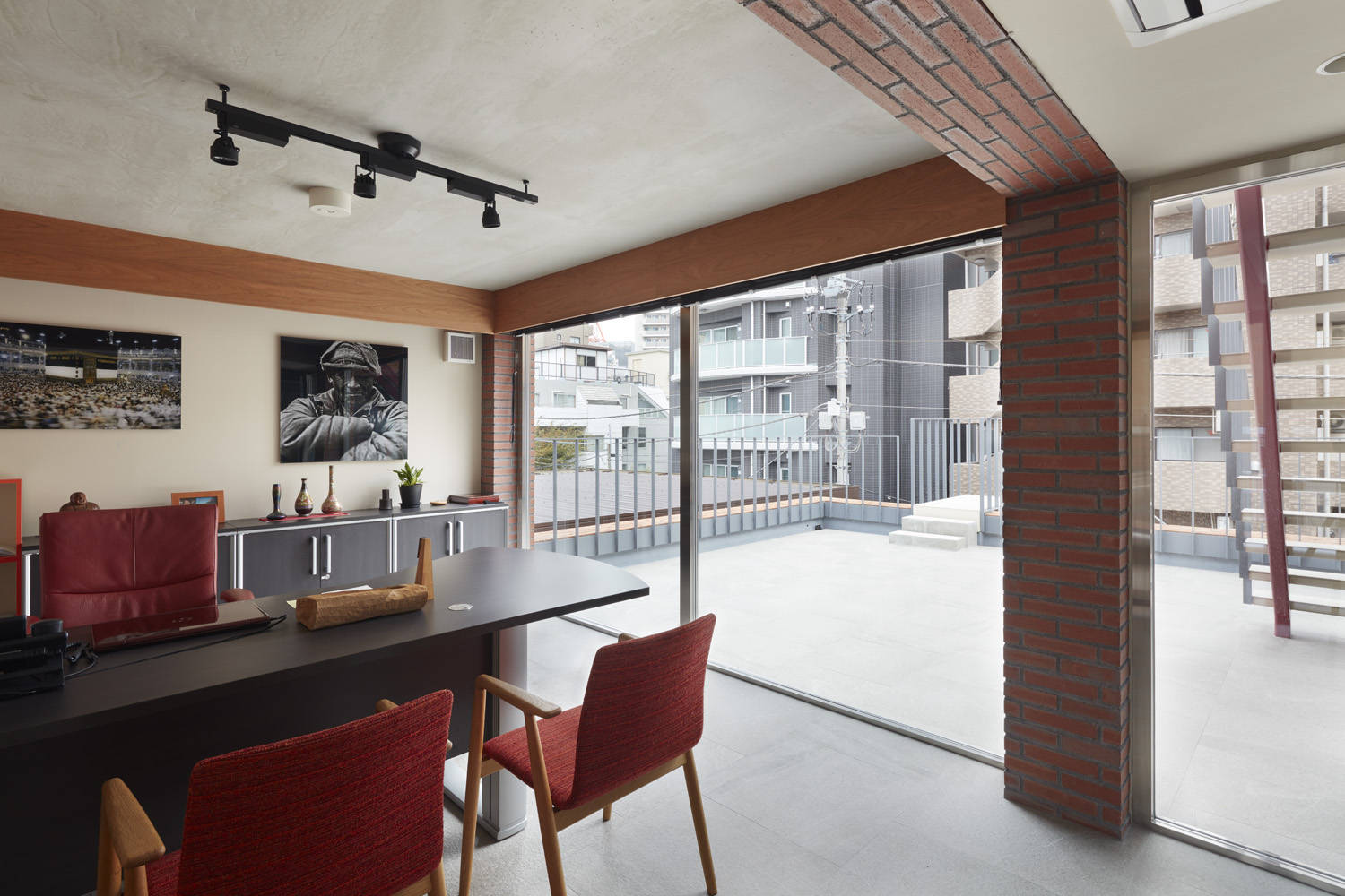 事務所本体は、賃料を伴う整形な空間であり、淡いレンガタイルで外観を仕上げている。各階をエレベーターで繋ぎ、屋内階段は設けず、可能な限り床面積を確保している。上階になると日影規制で北向きにひな壇状のバルコニーが出来てしまい、床面積を減らさざるを得ないが、その代わり事務所からバルコニーに向かって大開口のサッシュで連続感を持たせ、開放性を確保している。