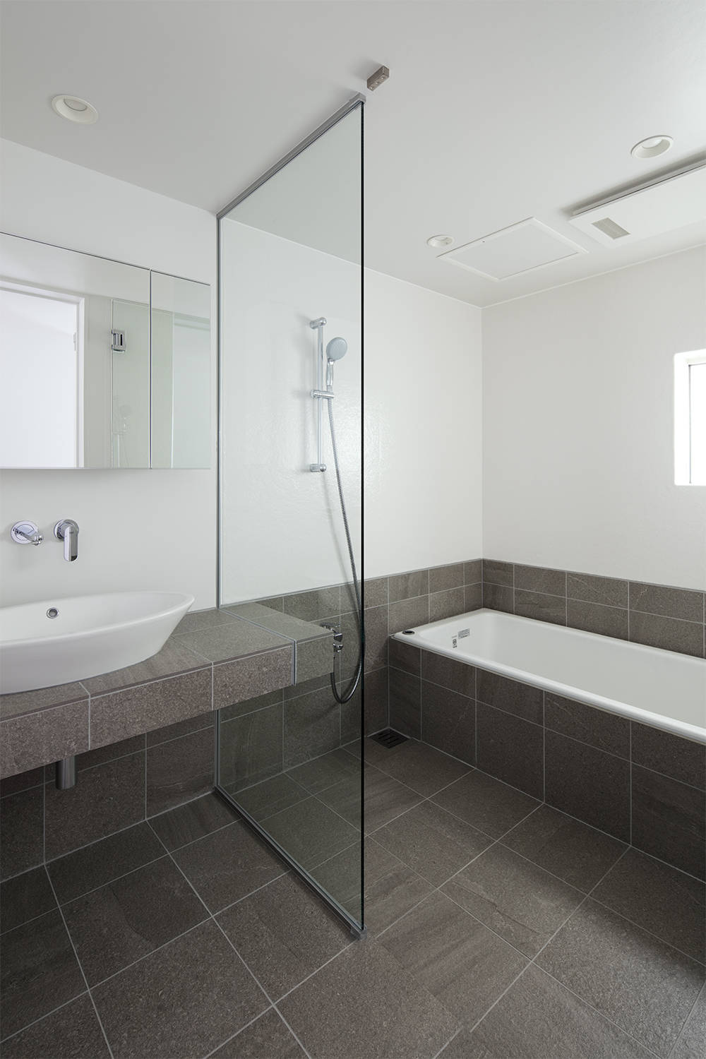 直角三角形の隙間は、玄関ポーチの吹き抜けや各部屋のバルコニーになると同時に、床面積や建築面積を許容範囲に収めるための、いわば引き算の空間にもなっている。外側の正方形平面をすべてそのまま建物として立ち上げると、予算から想定した床面積や法定の建蔽率をオーバーしてしまうからだ。