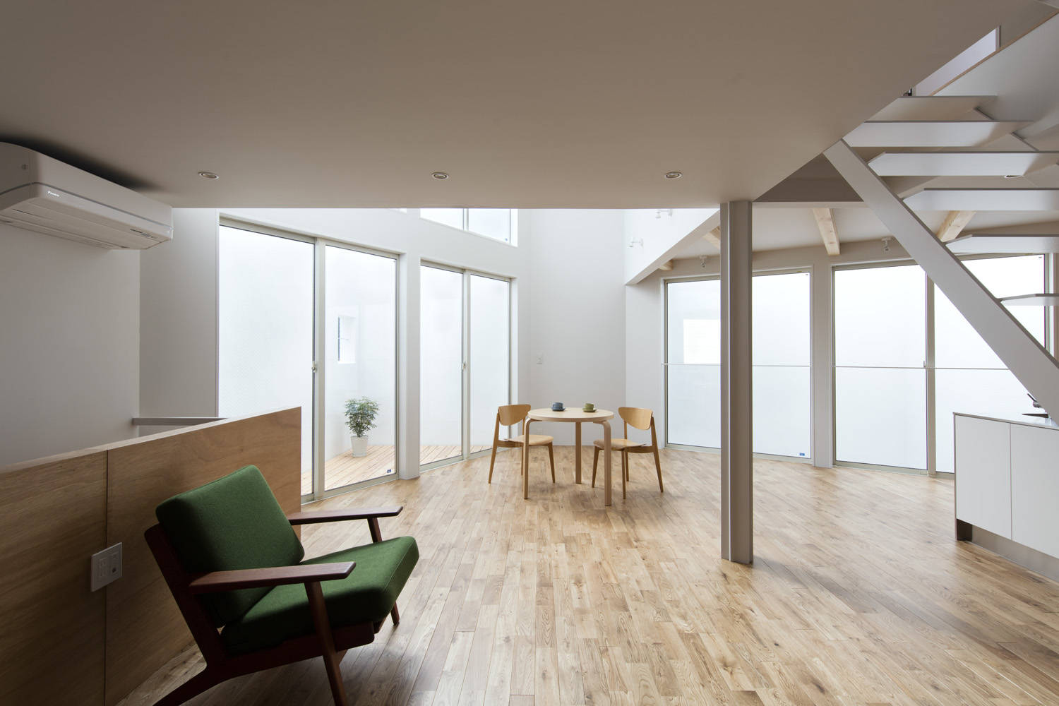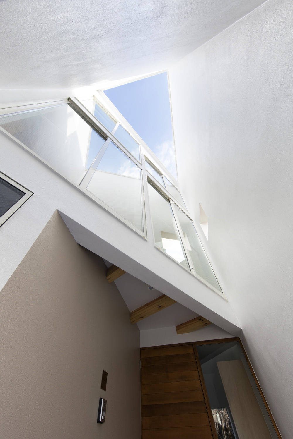 内側の正方形平面の壁に対してはできるだけ大きな窓を設け、外側の正方形平面の壁には控えめな開口部を設けている。そうすると、室内から窓越しに見えるのは隣家ではなく自宅の壁(=外側の正方形平面の壁)になり、窓に隣家からの視線を遮るカーテンがなくても過ごせるようになる。カーテンがないため、窓越しに見える自宅の壁まで室内からの視線が伸びて、床面積以上の広がりを感じることができる。壁は4つの直角三角形を経由して降りてくる光が柔らかく反射するようにツヤを抑えた白い塗装で仕上げ、感覚的な広がりを加えた。