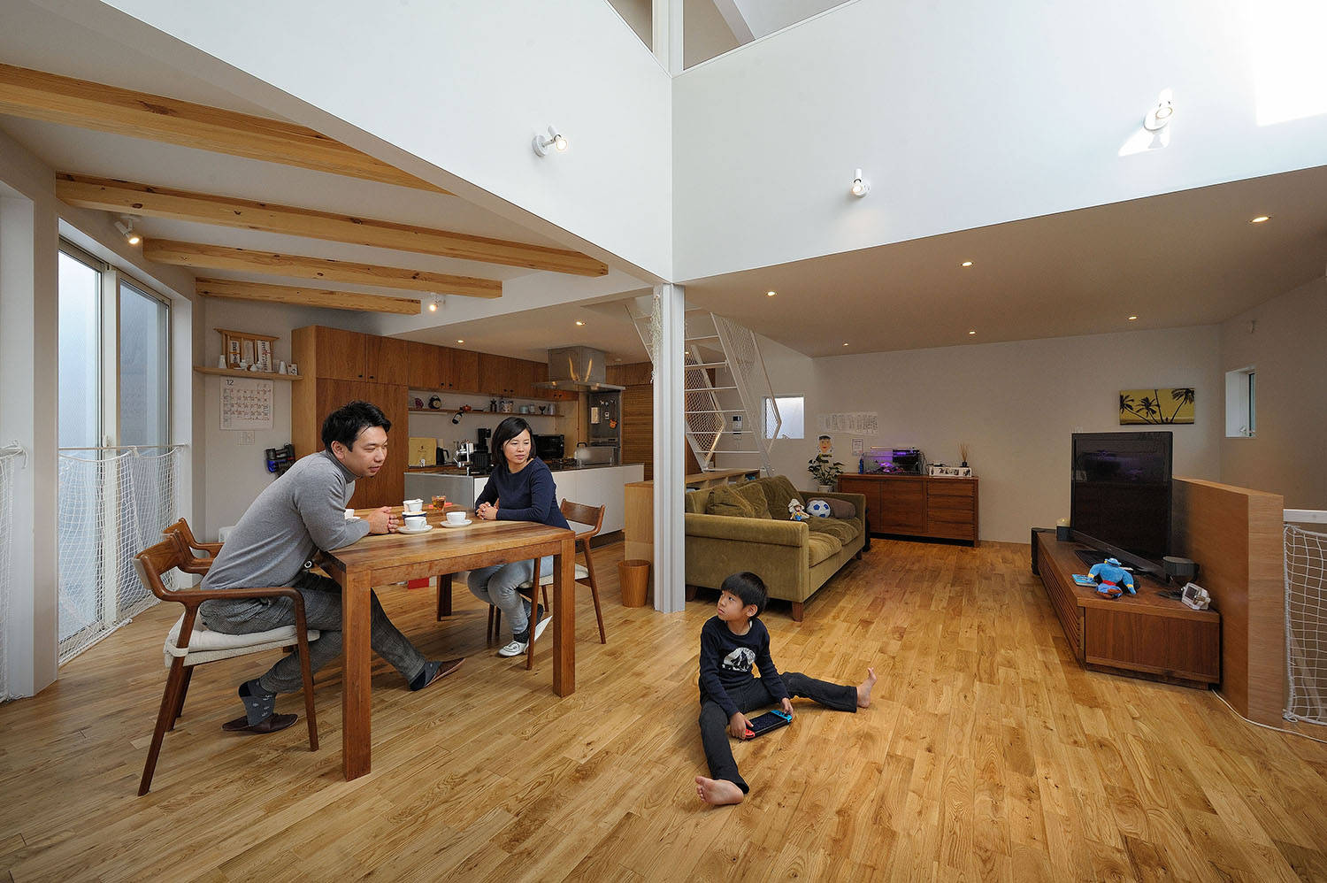 午後になると、前面の私道を下校の小学生たちが賑やかに通り過ぎ、どこからともなくピアノ練習の音が聞こえ、スーパーで買い物を済ませた大人が立ち話をする、そんな穏やかな風景が広がる。時間が経つにつれ、近づき合った周辺環境と4人家族の関係が、少しずつ馴染みながら自然に形づくられてゆくことを期待した。