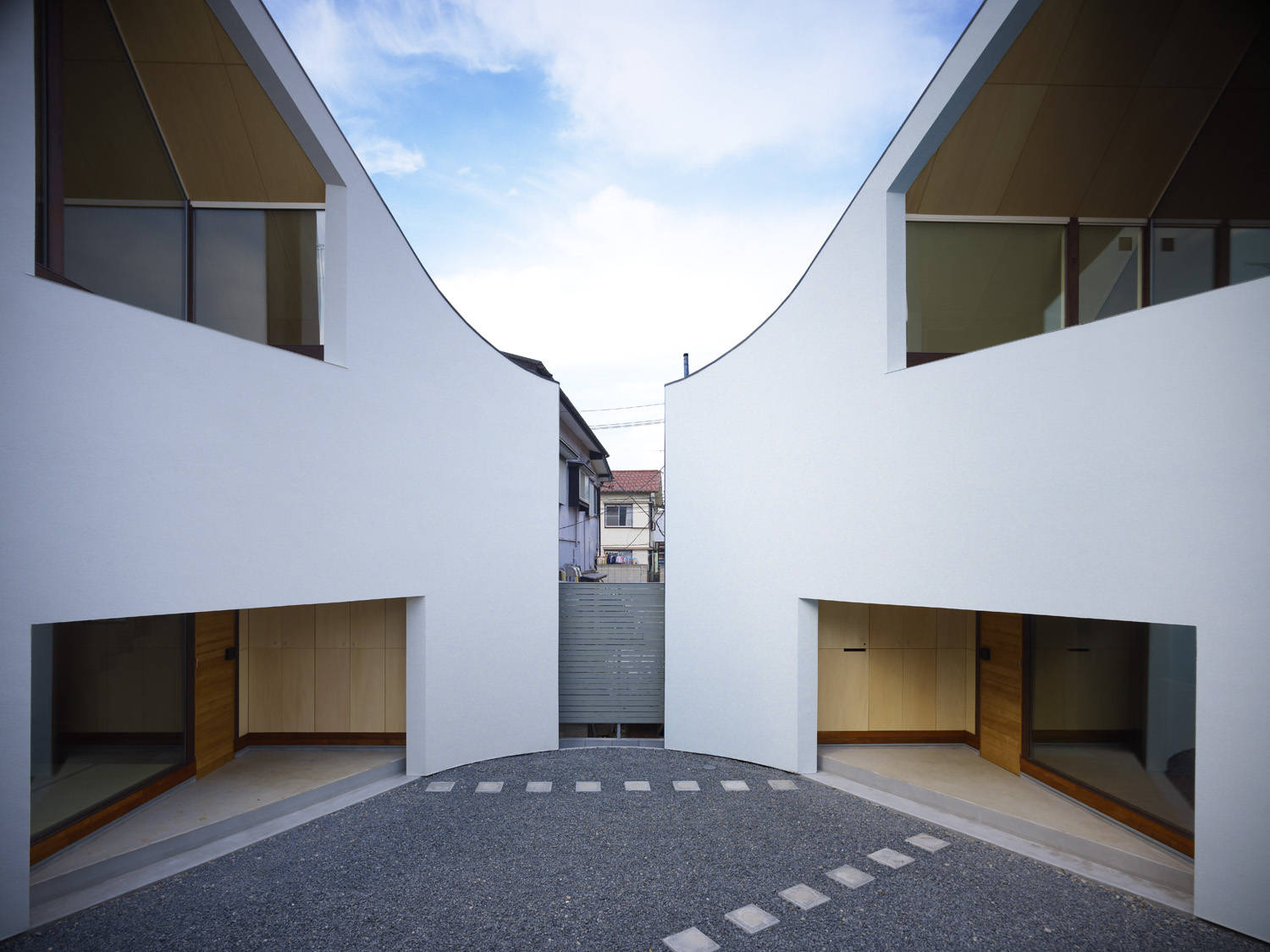 敷地いっぱいに大きな1つの家のボリュームを仮定して、それを曲線でくりぬき、残った2つのボリュームを実際の家として建てた。