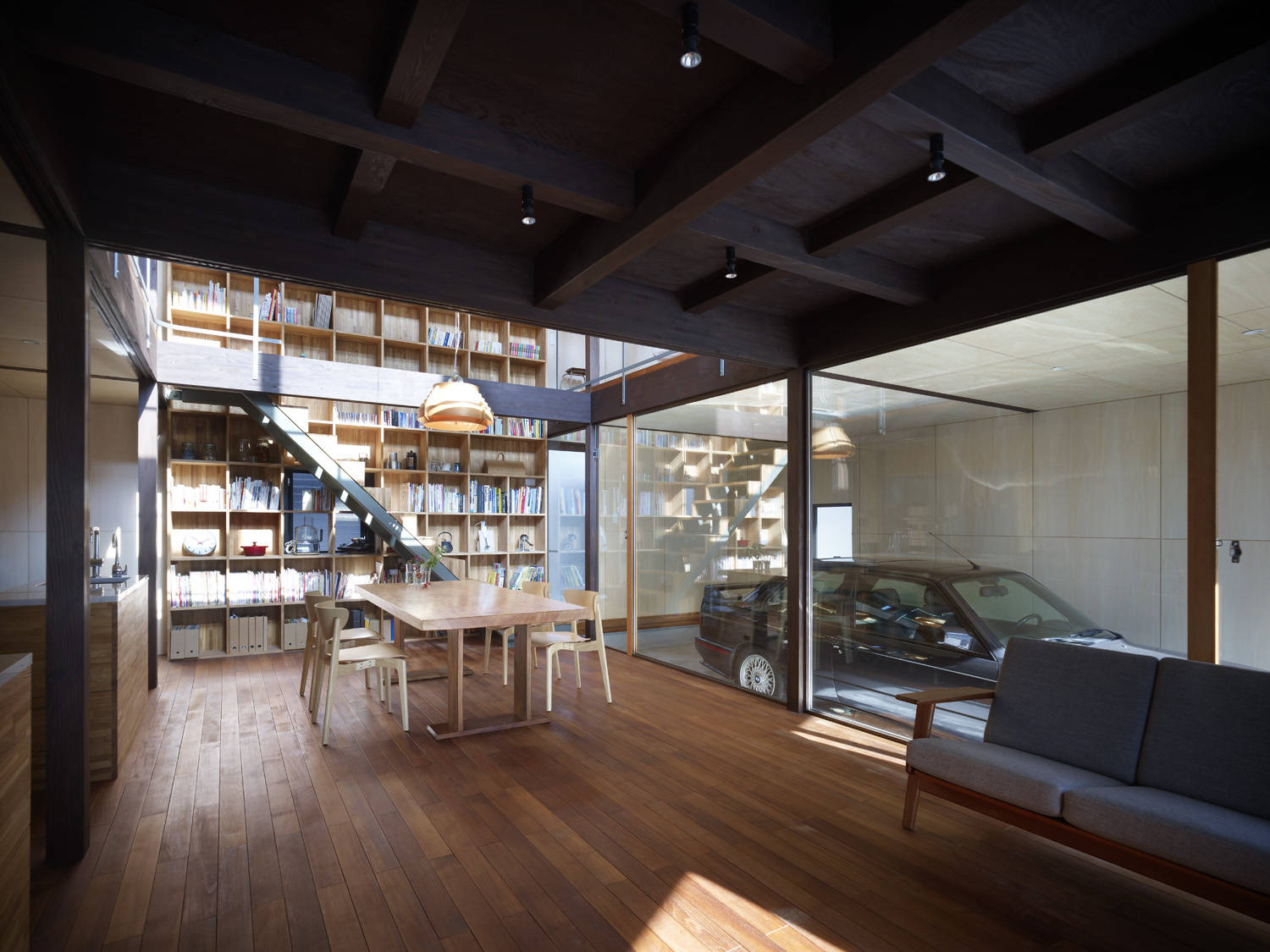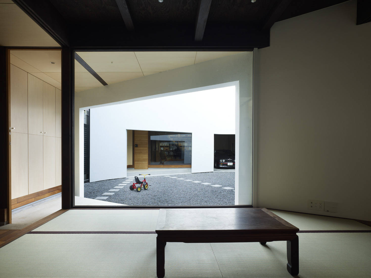 残った2つの家が「元々1つのボリューム」という仮定に従って、図面上の通り芯や木軸の構造形式、仕上げ材料を共通させ、離れているけれども繋がっているような関係を持たせた。くりぬいた部分は2つの家へのアプローチを兼ねた中庭になっている。