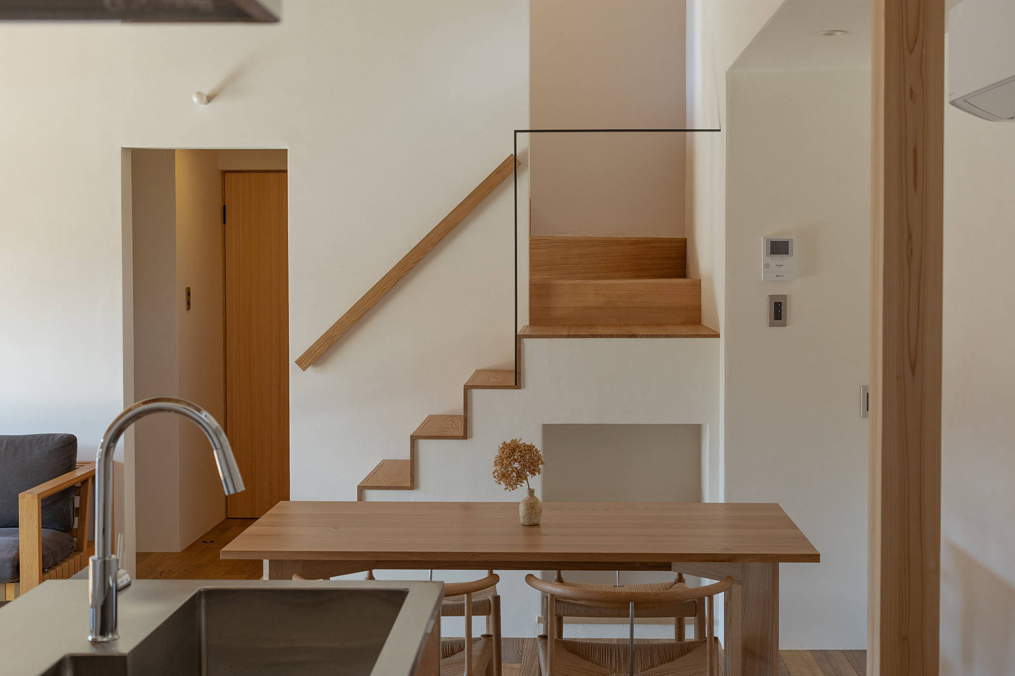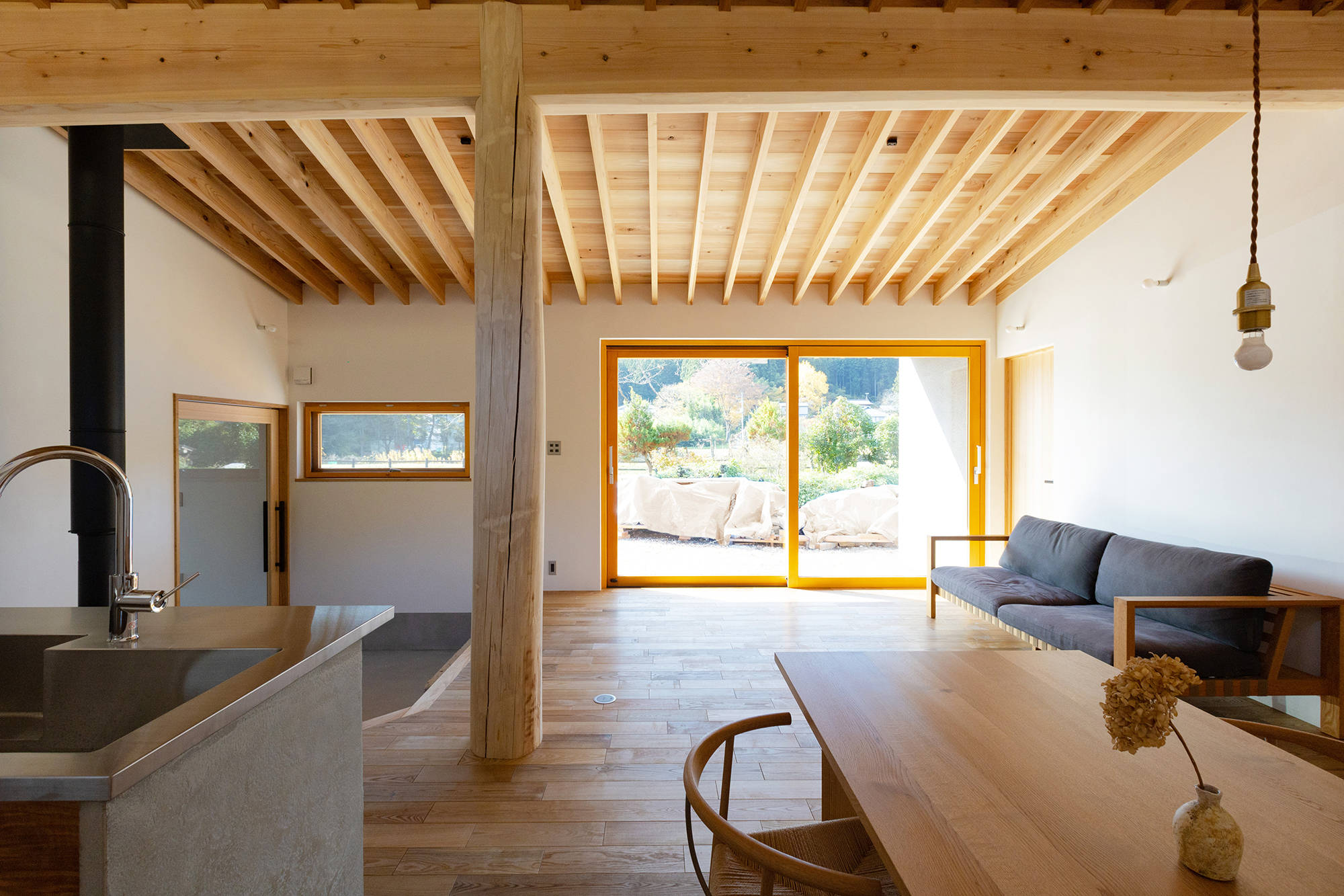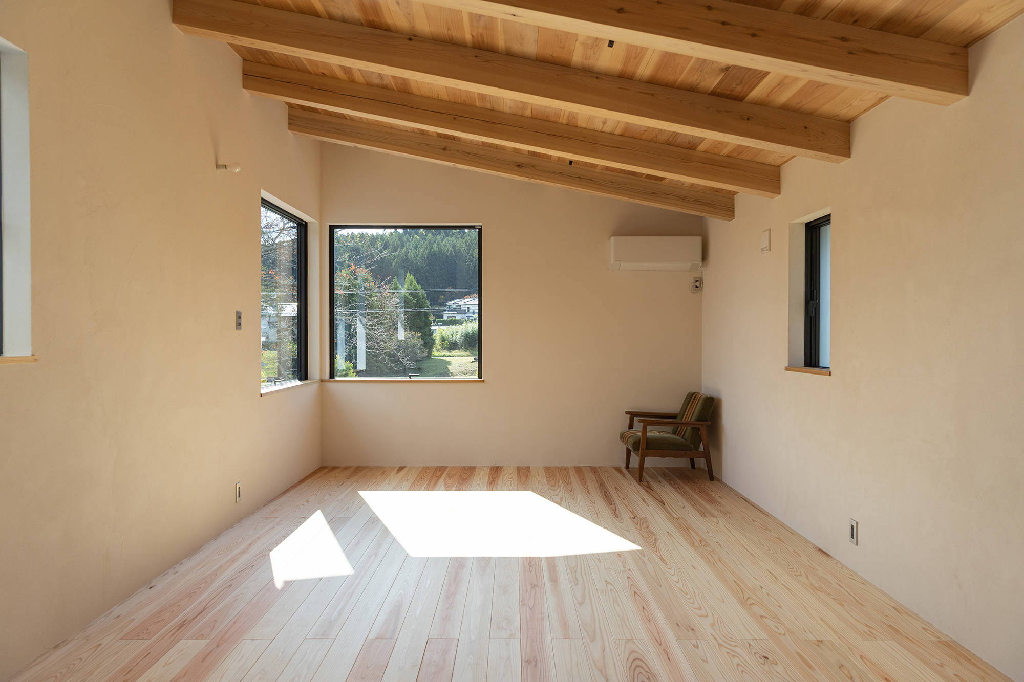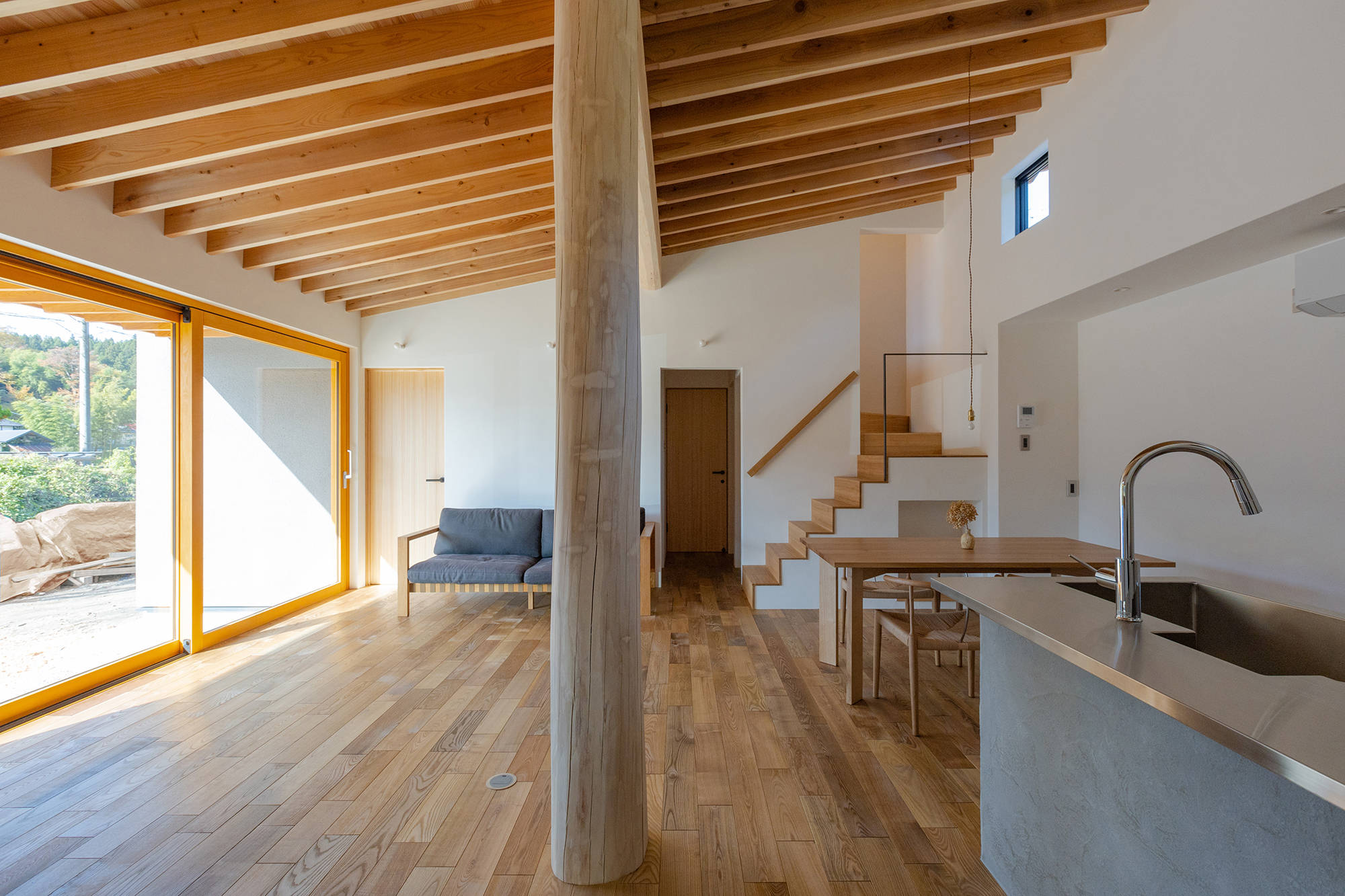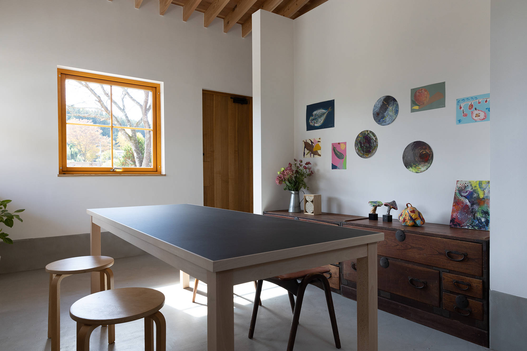 スタジオシンクロールのモデルハウスに位置付ける、自宅兼アトリエ。私たちが今後住宅を設計していく上で標準仕様として推奨したい手法や材を取り入れています。地域に開かれた家を目指し、象徴的な49本の垂木のかかる大屋根と土間空間で、外と内を緩やかに繋ぐ間取りを実現。構造材には燻煙乾燥させた県産材を使用し防腐・防虫効果を高めるとともに、山と森の木の循環にも寄与したいと考えています。外壁の断熱材には自然素材系のジェットファイバー、壁の仕上げは漆喰、珪藻土、自然塗料などの自然素材を厳選して使用しました。