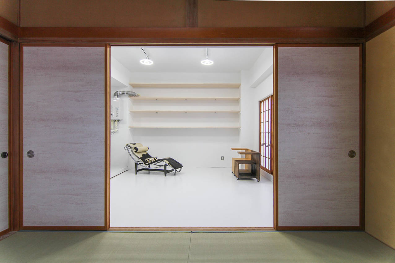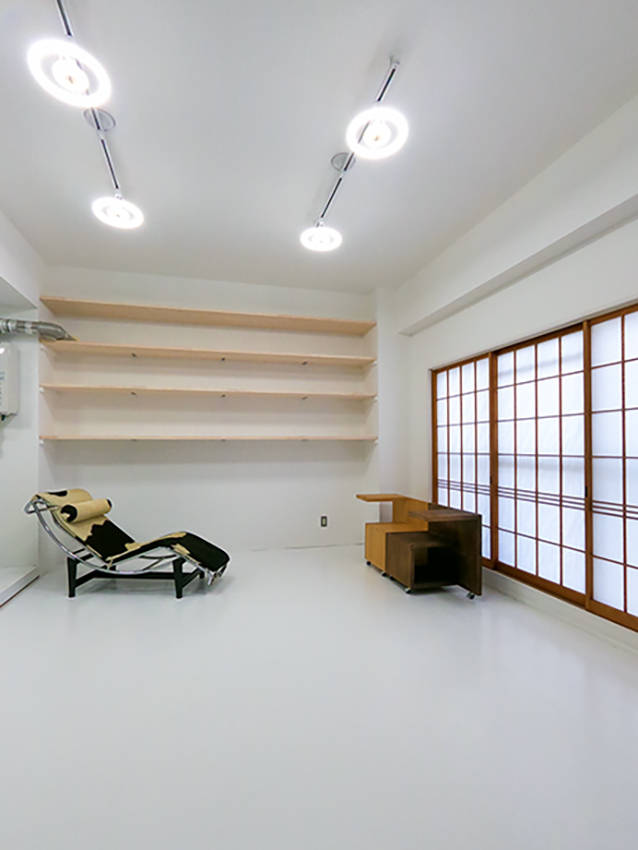 築後40年ほどのRC4階建ての1戸。都内の設計事務所の長岡分室とするため、2和室+水回り(K, WC ,UBなど)の間取りを水周りを除き改装した。