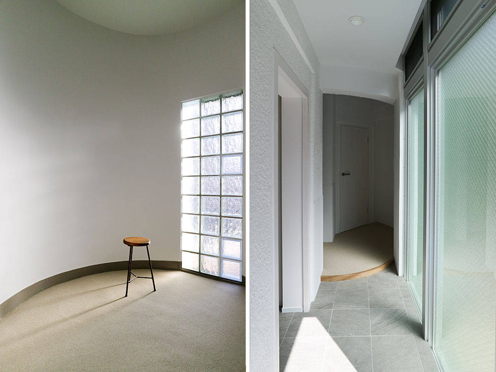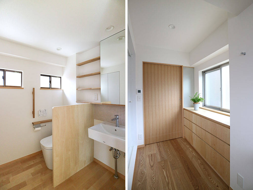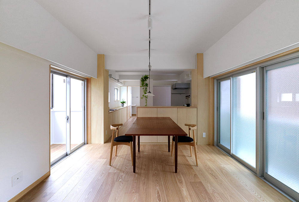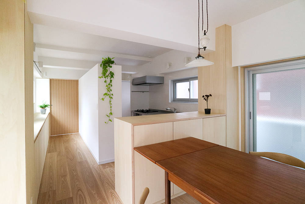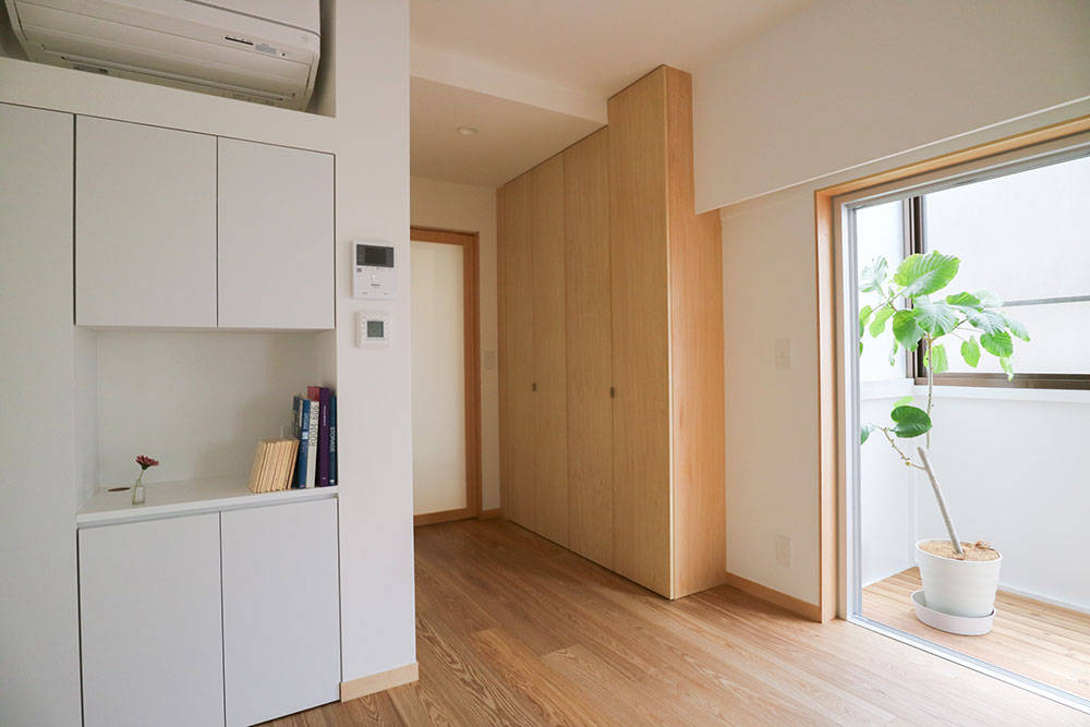 神楽坂の近くに建つ、築50年以上経つRC住宅のリノベーション。 部屋を細かく分断していた間仕切りは撤去し、間口3.5m 奥行き18mの細長い建物形状を生かして、奥へと続く抜けのある空間を作り広がりを感じられるようにしました。 柱にはシナ合板を貼り、連続する収納と一体とすることで存在感を和らげて、梁は奥行き感を強調させるため現しとしました。廊下の収納は手すり代わりに使える高さとしています。