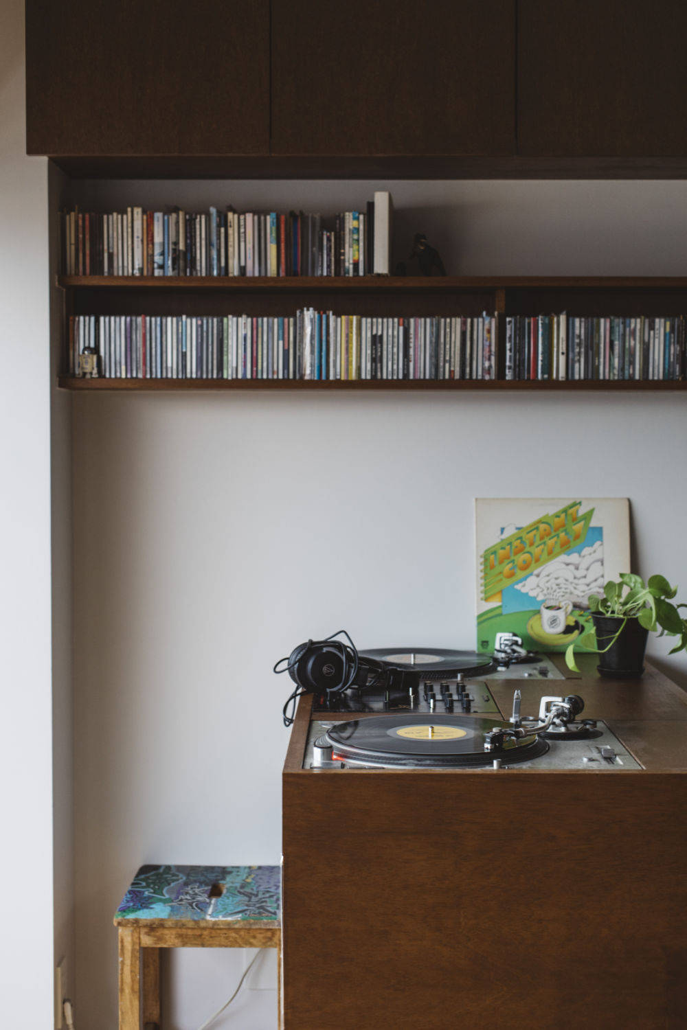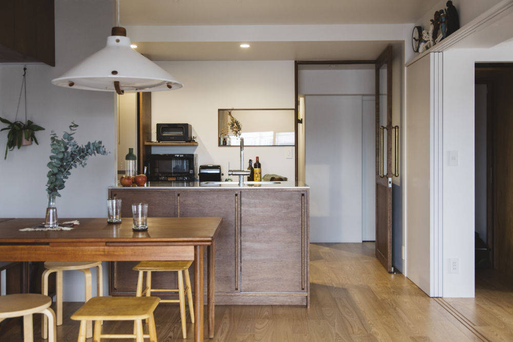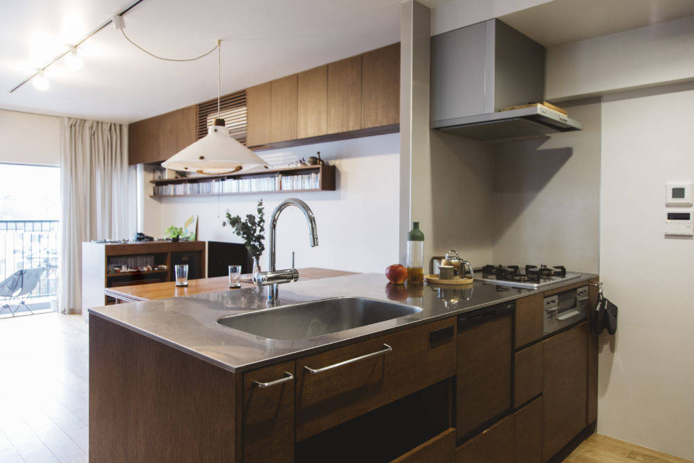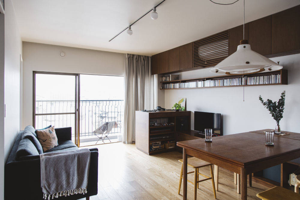 LDKとの間に室内窓とガラス框戸を設え、玄関まで光りを届け、視覚的な広がりを感じられるようにしています。 奥行きの広いキッチンカウンターやベンチ棚、ご主人の趣味のために計画したDJカウンターなどは造作家具。DJカウンターはターンテーブルがすっぽりと入るようになっており、コード類も隠せるようになっています。キャスター付きのため、リビングに向けたり、壁に向けたり、他の部屋に運んだりすることができます。