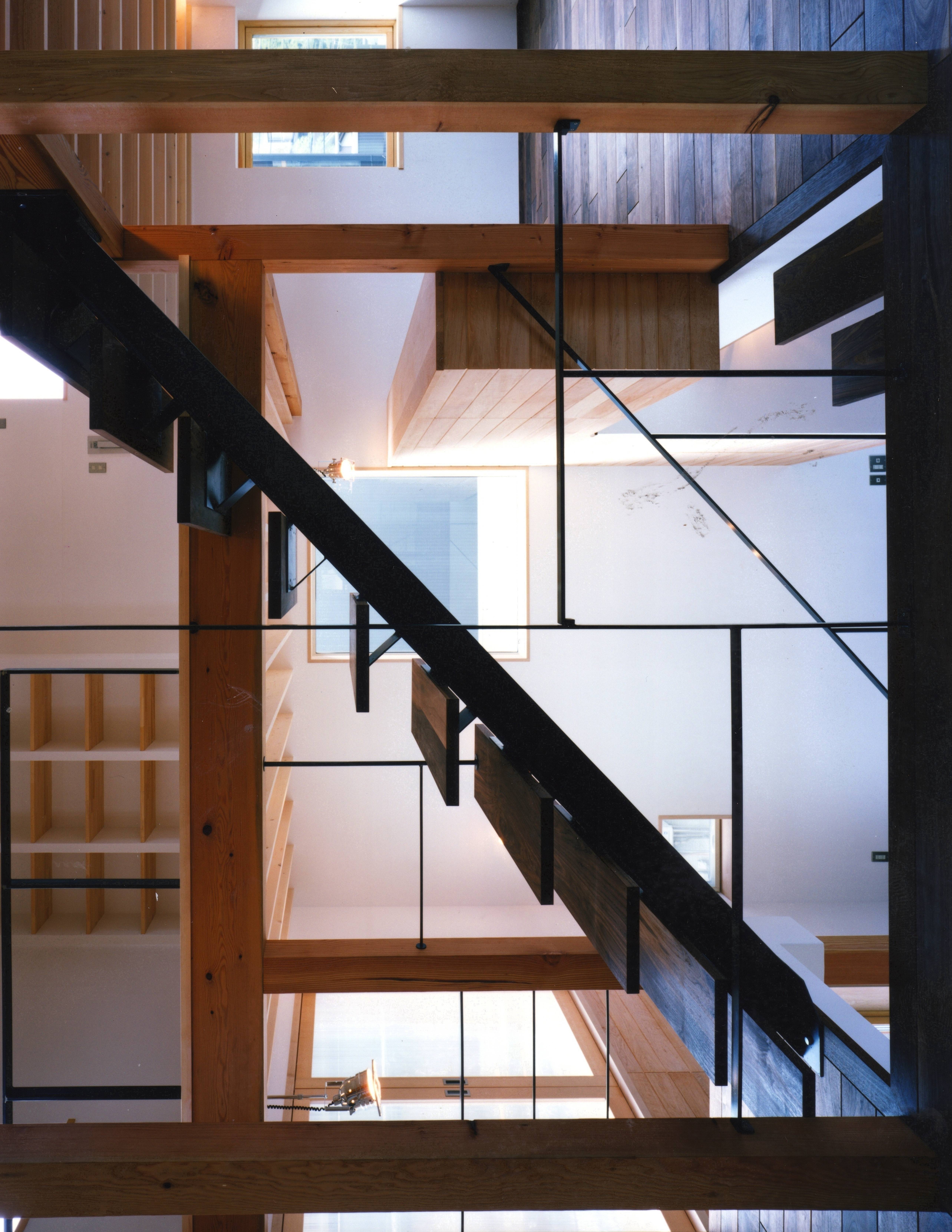 三方を建物に囲まれた敷地ですが、それぞれの方角からの光の特徴を生かした空間づくりをいたしました。 輝度の高い東からの朝日や北側の高窓からの採光で、暗くなりがちな1階を明るくしています。 全般に柔らかい無垢の木を使い、硬いタイルやスチールで引締めています。
