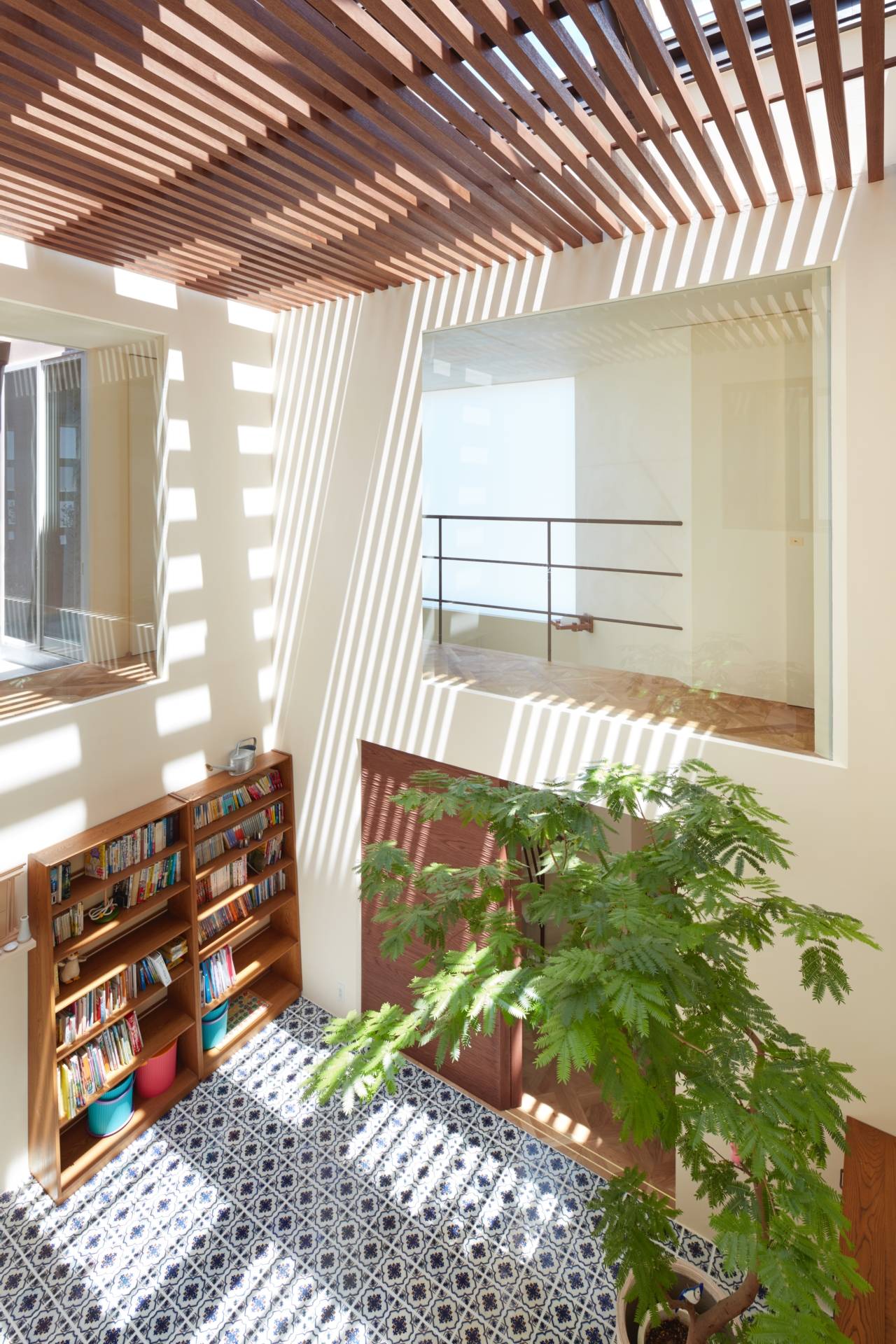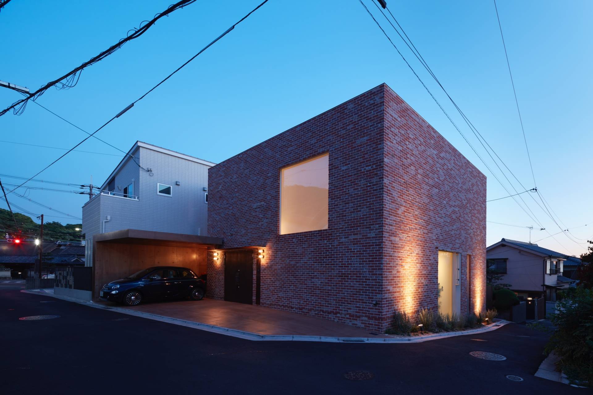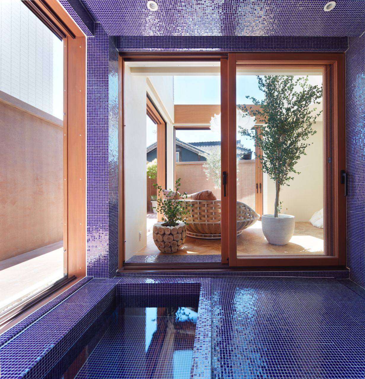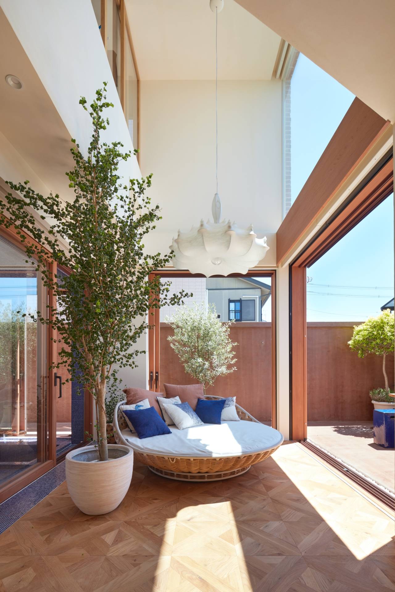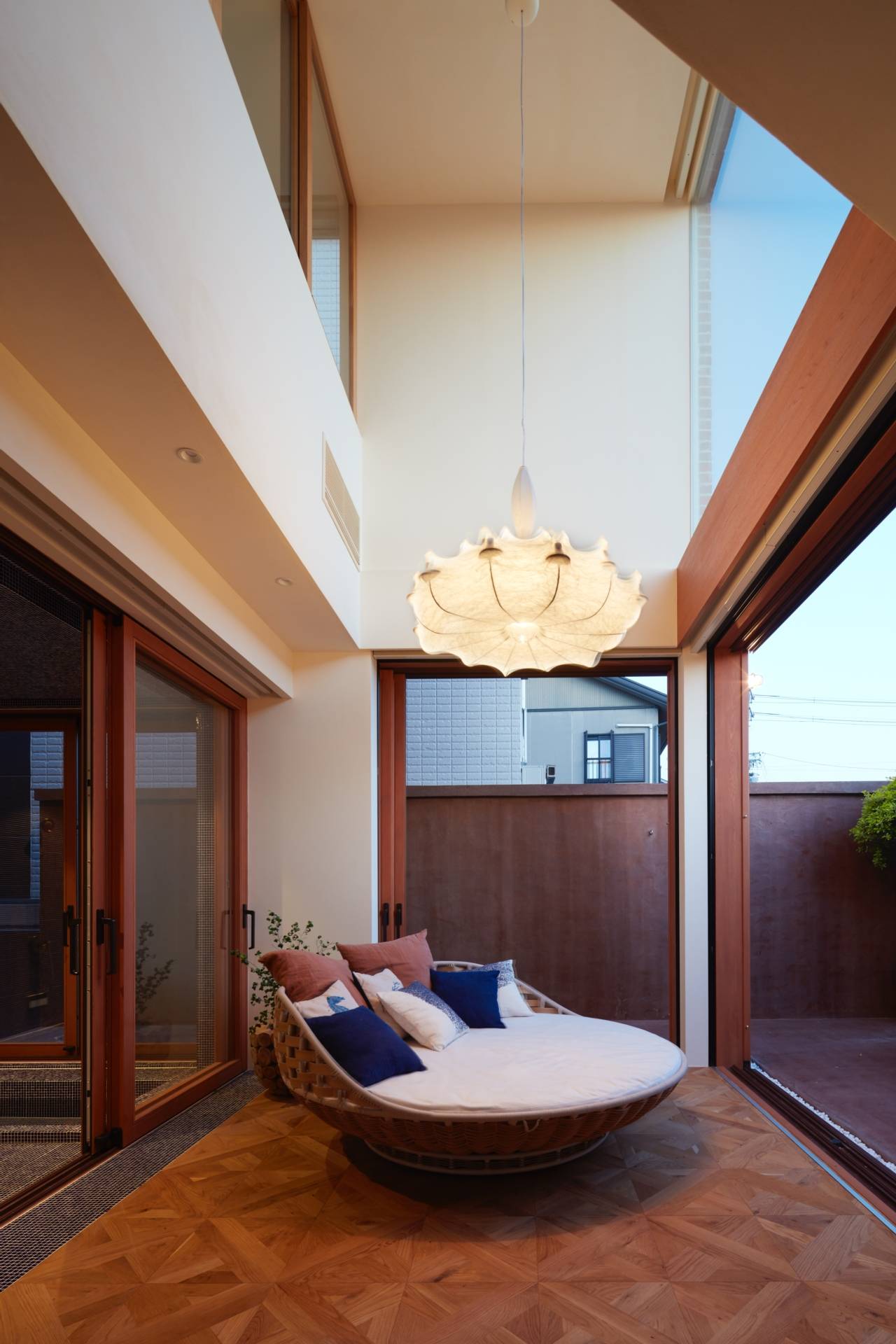 建物全体として、家の中央に光を内包するイメージを考えました。家の中央にトップライトのある吹き抜け空間を設けて、1階2階の各窓が吹き抜けに向かうように設置。各方向からの日差しや反射光が、家の中央のリビングまで到達し、1年を通して内部空間のニュアンスが変化していきます。構成としては、リビングの吹き抜けを通じて、各部屋がつながっています。1階は家族が集まる部屋があり、敷地南面に向かって大きな開口部を設けて、室内と外部スペースが繋がる。浴室は外部テラスとセカンドリビングにも繋がり、リゾート感のある雰囲気になっています。2階はサロンと個室を配置。外壁はアンティーク煉瓦、リビング床は特注の製作タイル、浴室はガラスタイル、金物は真鍮を使用し、建物全体に素材感のある仕上げを使用。来客が頻繁にあるサロンは、玄関から直接サロンに行けるように動線を配慮しています。