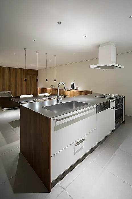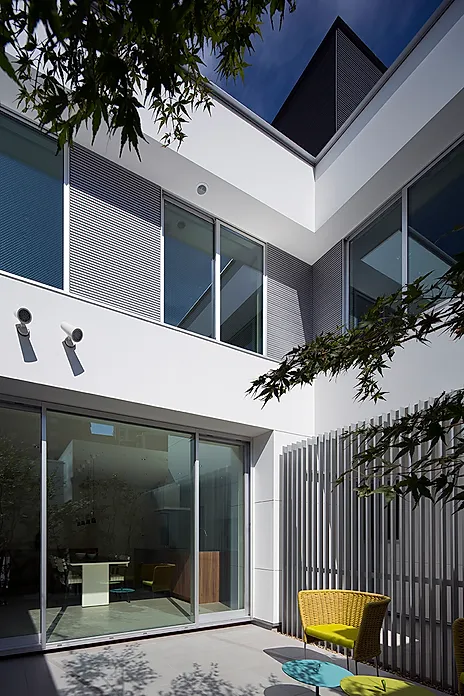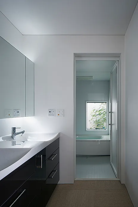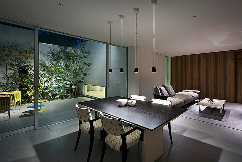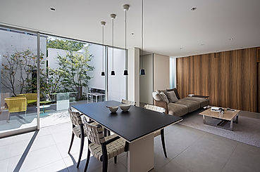 建築は用途ごとにブロック状に分節されたヴォリュームを敷地に対して卍型に配置し、ヴォリューム間に生じた「隙間」を中庭などに活用する事で、施主の要望に応え、且つ住空間に採光と通風を促す役割を与えた。