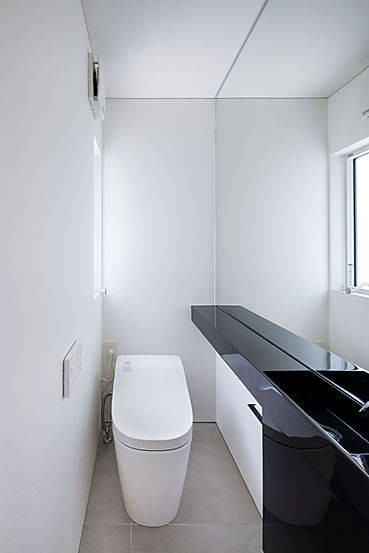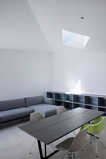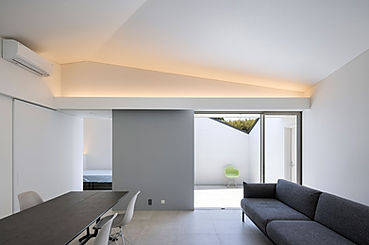 富山市郊外に建つ平家の小さな住宅。プランはグリッドに乗せて仕切られた住空間部分とガレージ部分、2つの方形のボリュームが組み合わさった単純な構成。この単純な構成の建築を、45°捻った横架材をかける事で全容の分かりにくい、変化にとんだ広がりのある内部空間とする事を構想しました。
