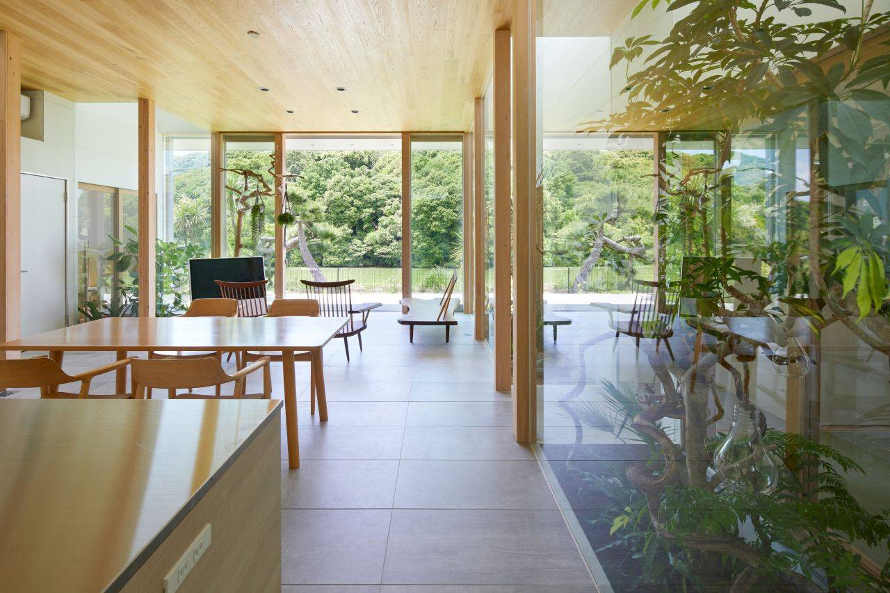 サンルームがあり、そのガラス面に外部と内部の緑が重なり合うことで、建物内部に景色が入り込んでくるようなイメージを実現しています。