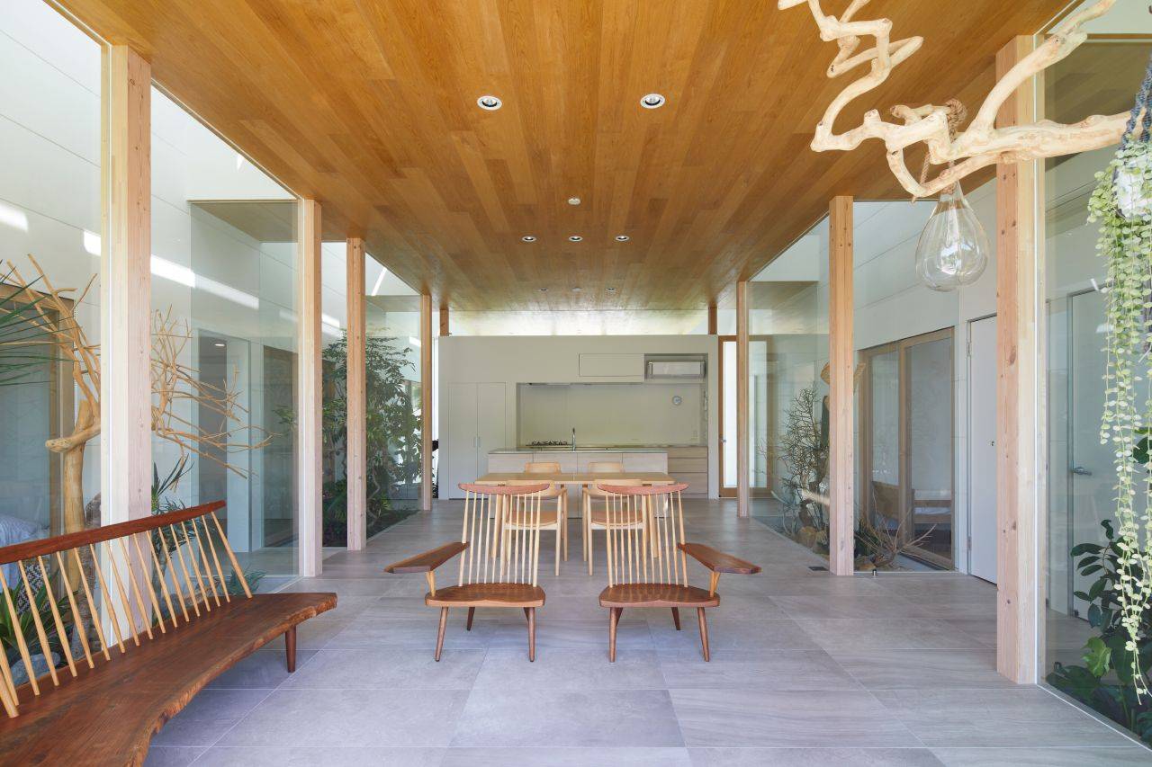 そこで、敷地の中に2本の植栽の道を設定し、それが建物を貫くことで、外部の景色と眺望と内部の空間が、親密に繋がっていくデザインの注文住宅を提案しました。