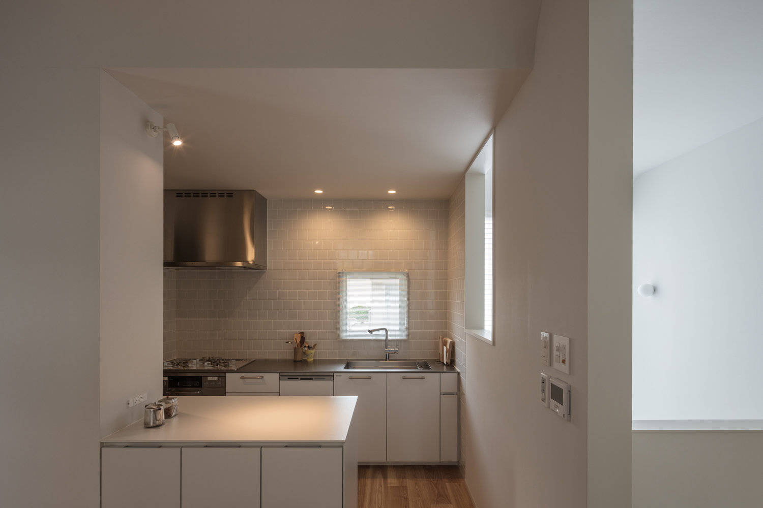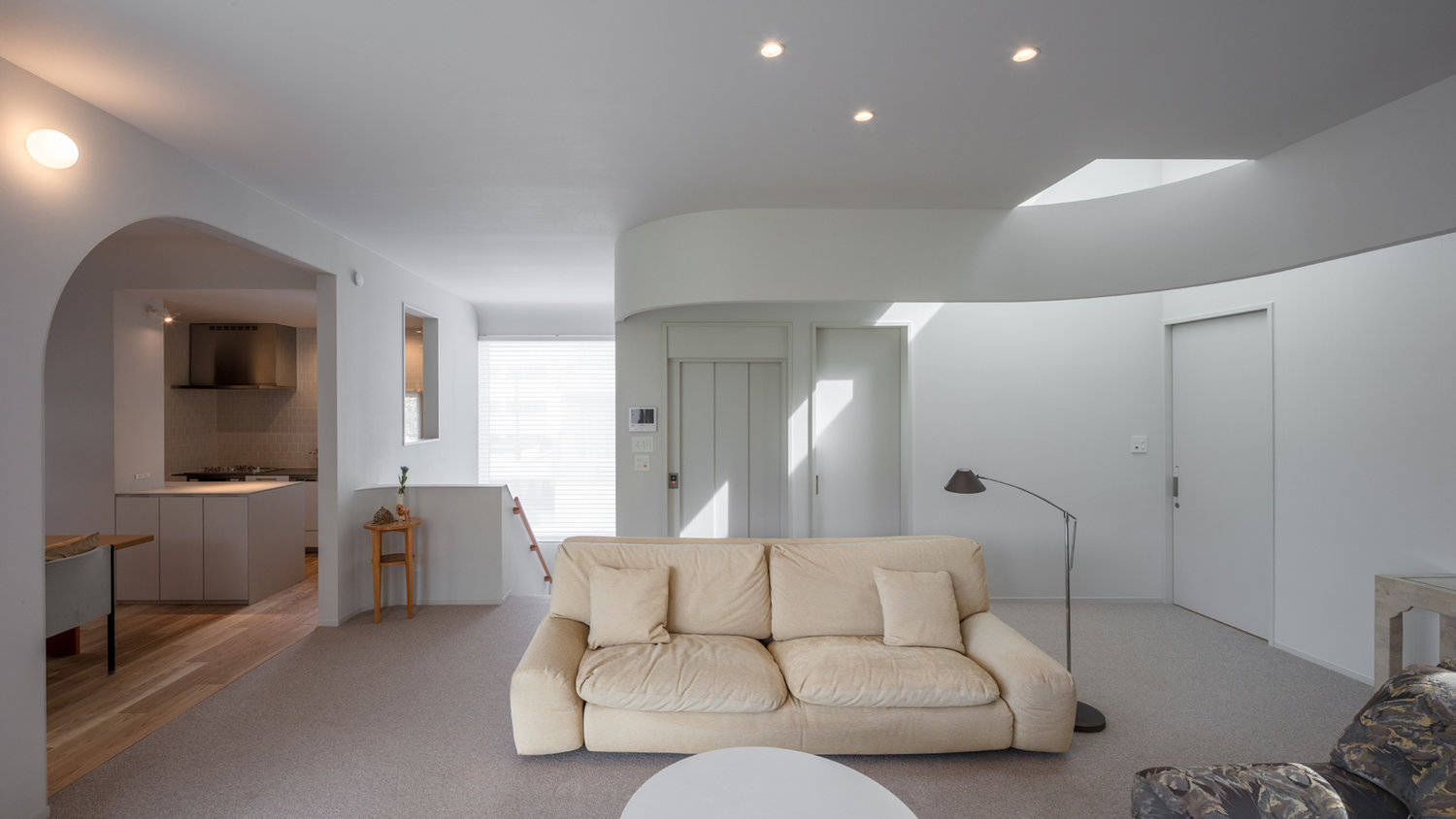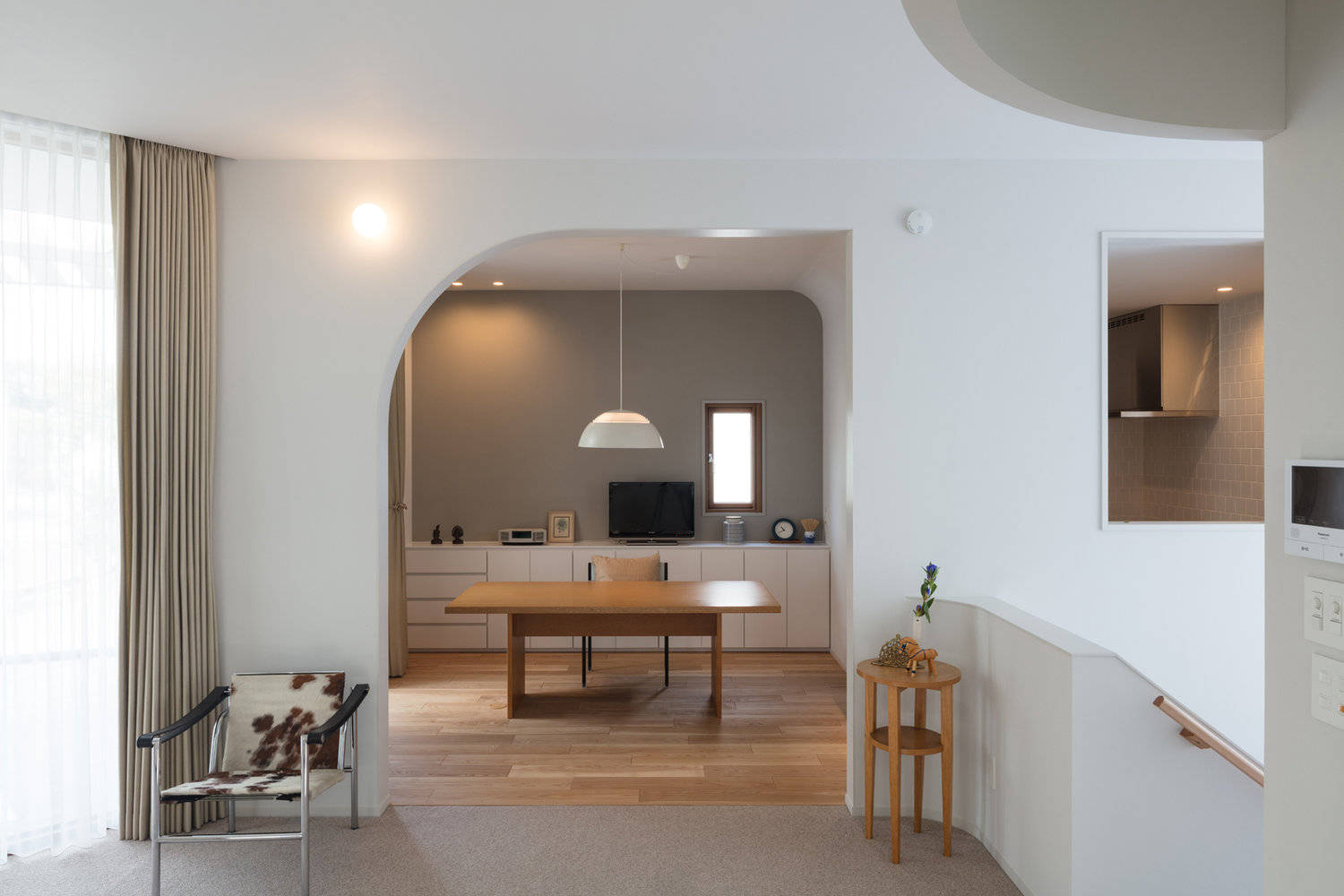 この住まい独特の表情をかたちづくる「曲がり」というモチーフは、機能の境界や人々の動線を暗示する役割も担い、内外のシーンに繰り返し現れる。