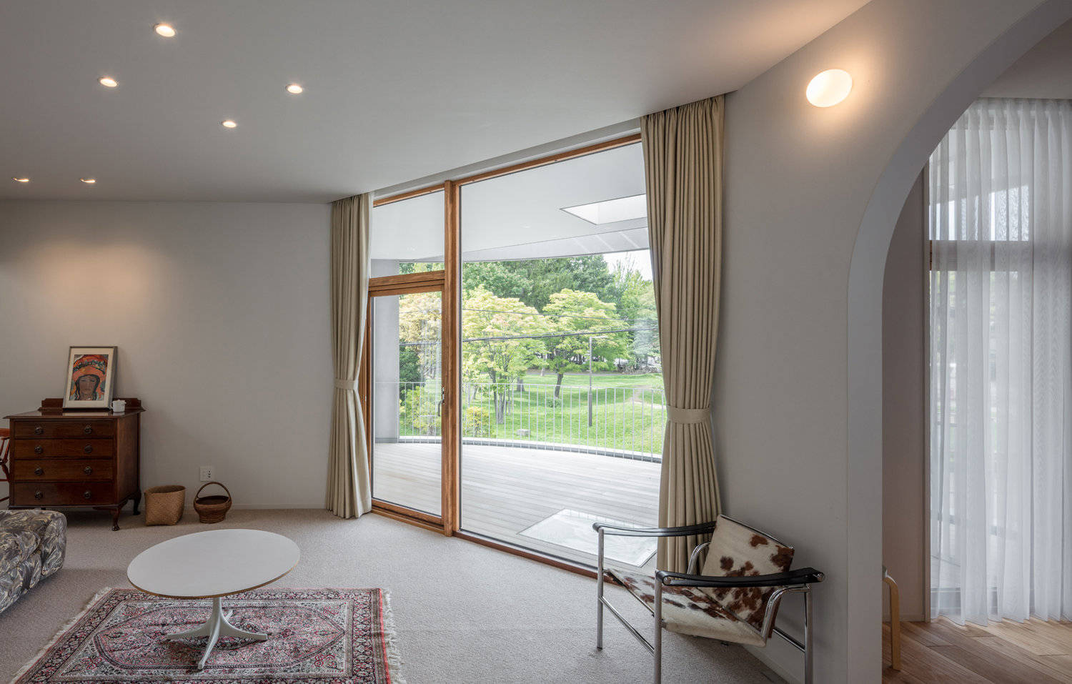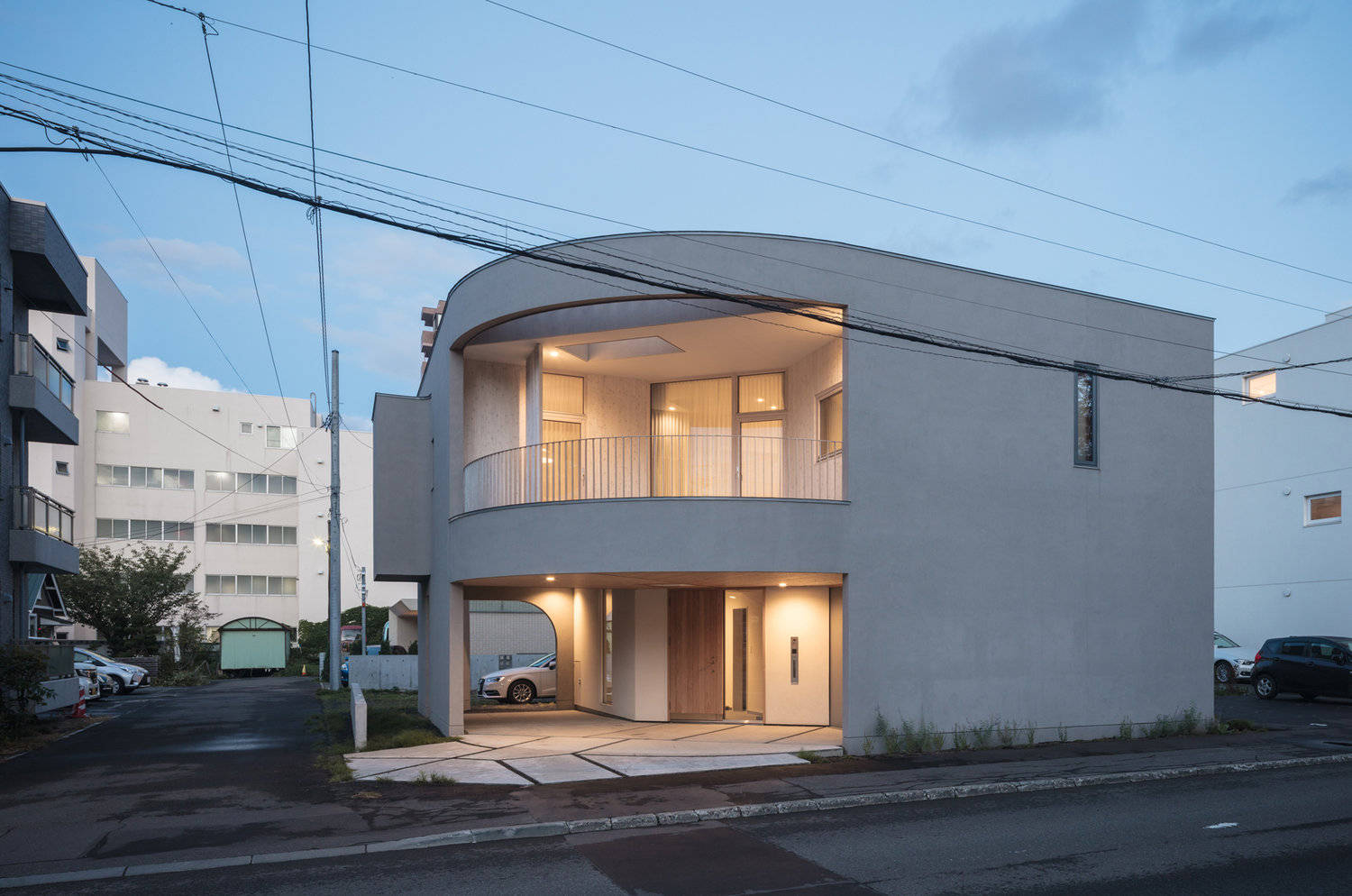 年間降雪量が6mに達する札幌において、車の軌道や玄関アプローチへの降雪を抑える湾曲した庇は有用である。それは奥行きのある広いバルコニーとなって、建物前の道を歩く人々の2階への視線を断つ役割も担う。つまりそれは、住宅のメインフロアである2階が、道路を隔てた公園と視覚的に一体化され、よく手入れされたプライベートな庭を手に入れることを意味する。
