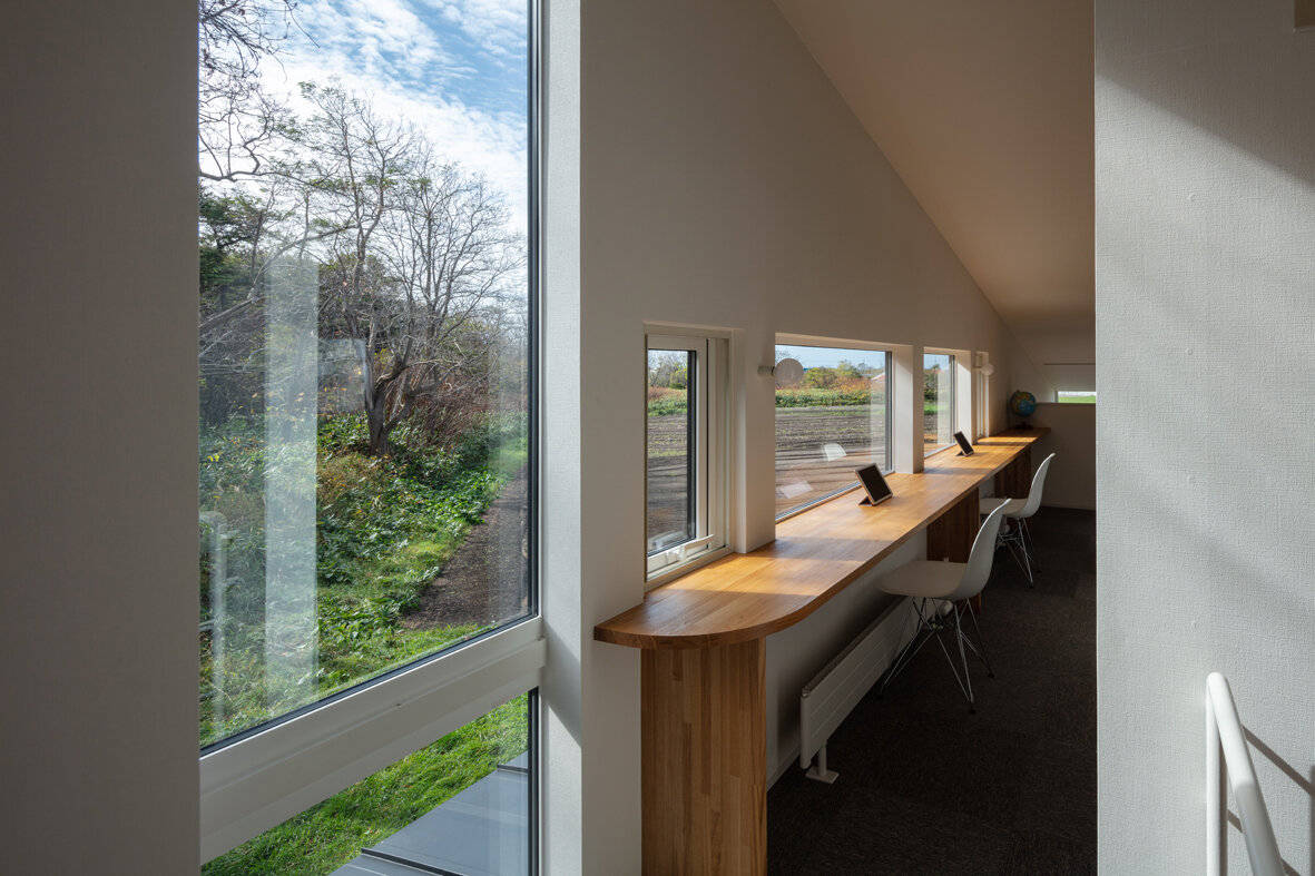 敷地は、80年代に廃線となった鉄道防風林と、隣家が営む大きな畑に面している。プログラムとしては、4人家族が暮らす場に加え、地域の人々に福祉に関する情報を提供するSOHO的スペースが求められた。