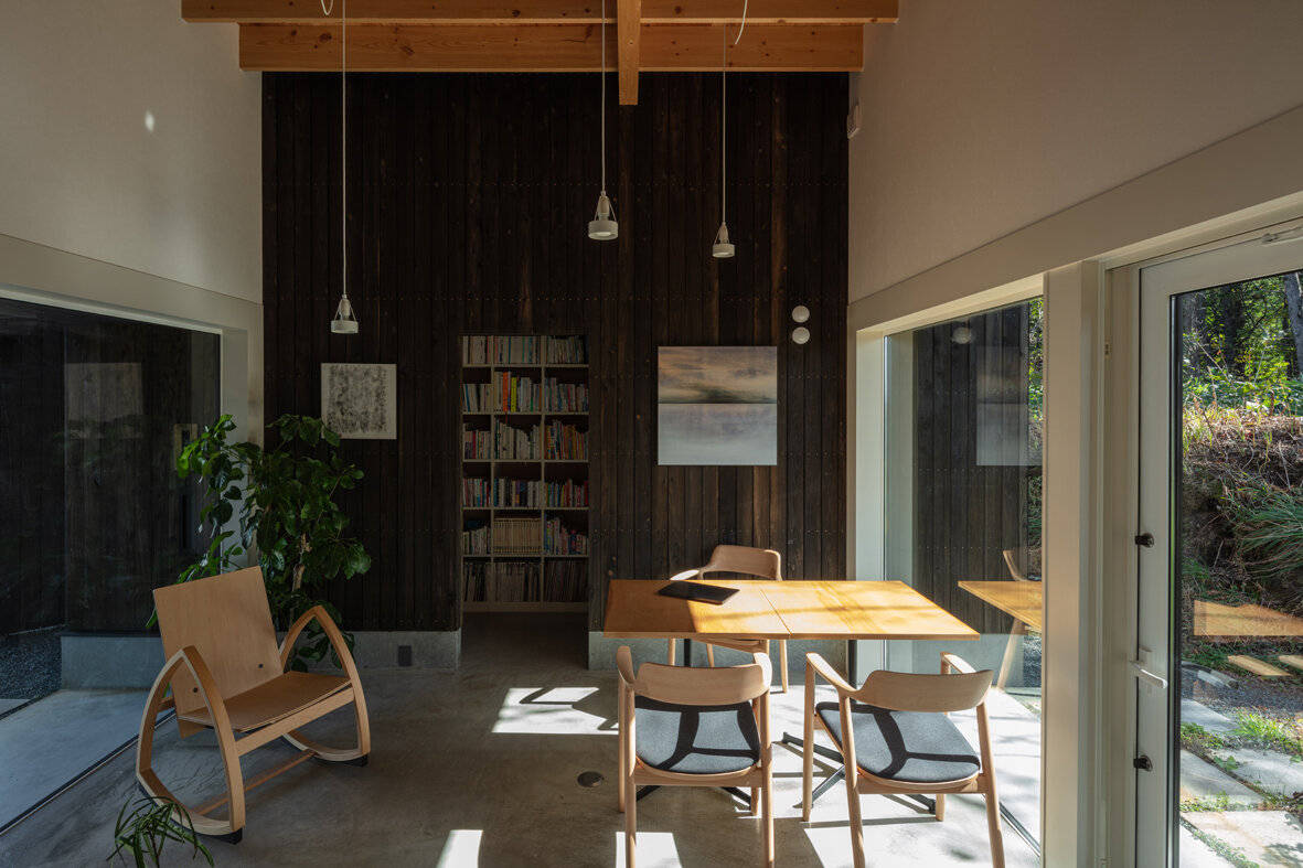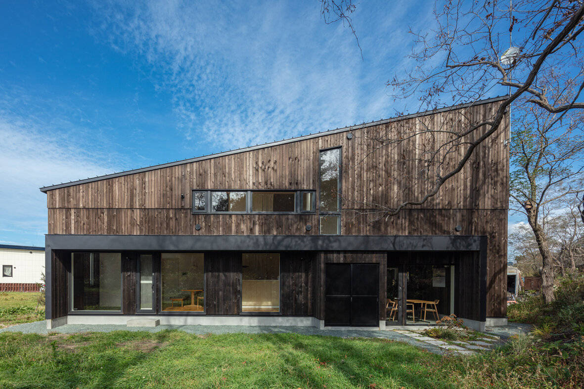 北海道産のカラマツ材に木酢液を塗布することで耐候性を高め、黒みを帯びた建物は、片流れの屋根形状と相まって、地域の島で見られる希少な海鳥「オロロン鳥」を連想させる。