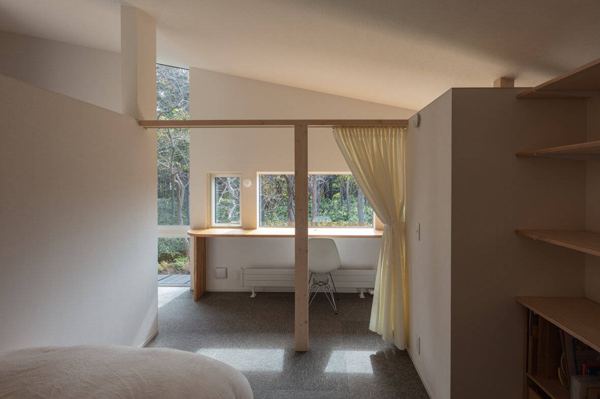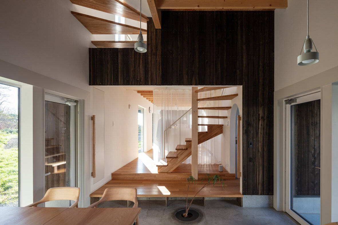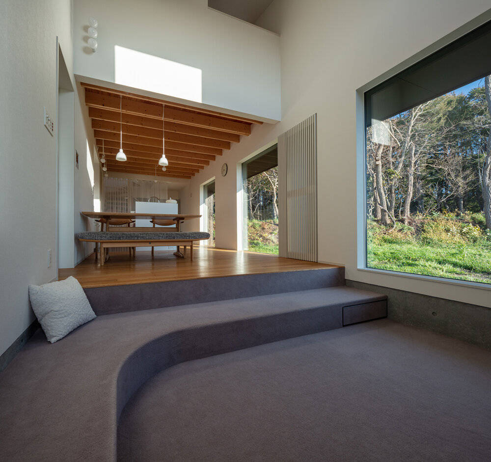 片流れ屋根を持つ建物を、周辺街区のグリッドに対し斜めに配置し、地域を受け止める佇まいを見せながら、冬季の強い海風が当たる壁面をできるだけ小さく抑える全体計画とした。すべての居室は、地域の歴史や気候を反映した防風林に面し、四季折々の光や植物の変化を楽しめる住まいとなっている。視覚的に地域へ開かれた家族玄関をSOHOとすることで、地域住民の「入りやすさ」を生み出しつつ、家族のプライバシーを、奥行きある平面や床のレベル差などによって適度に担保できる、フレキシブルなワンルーム住宅を目指した。