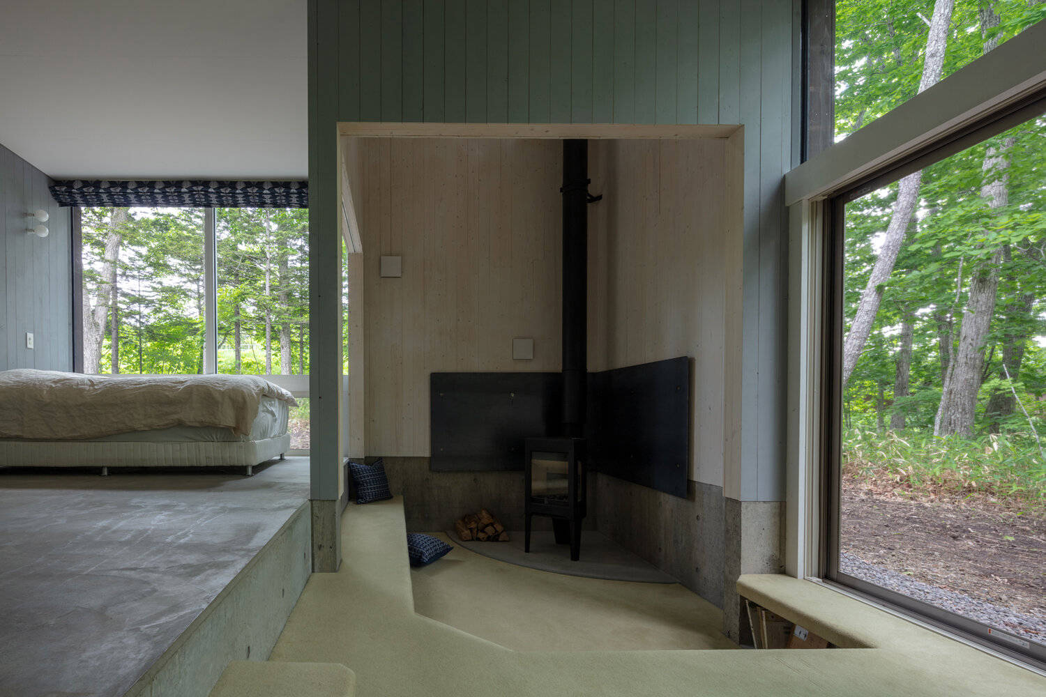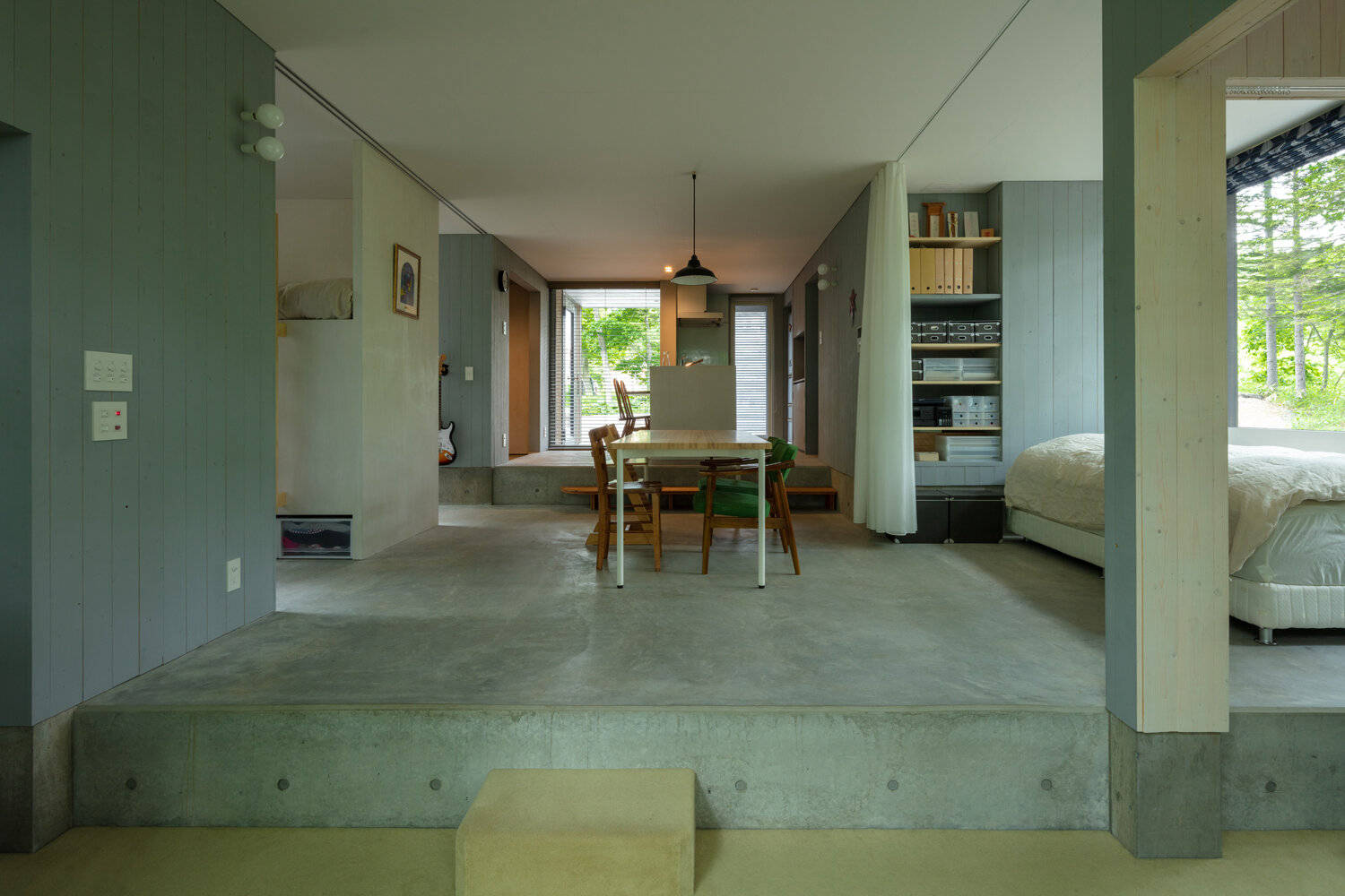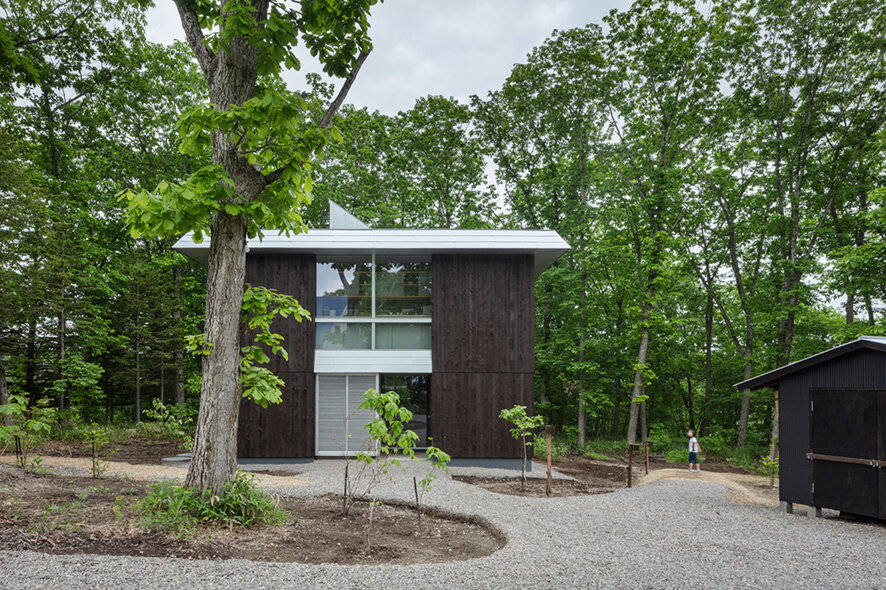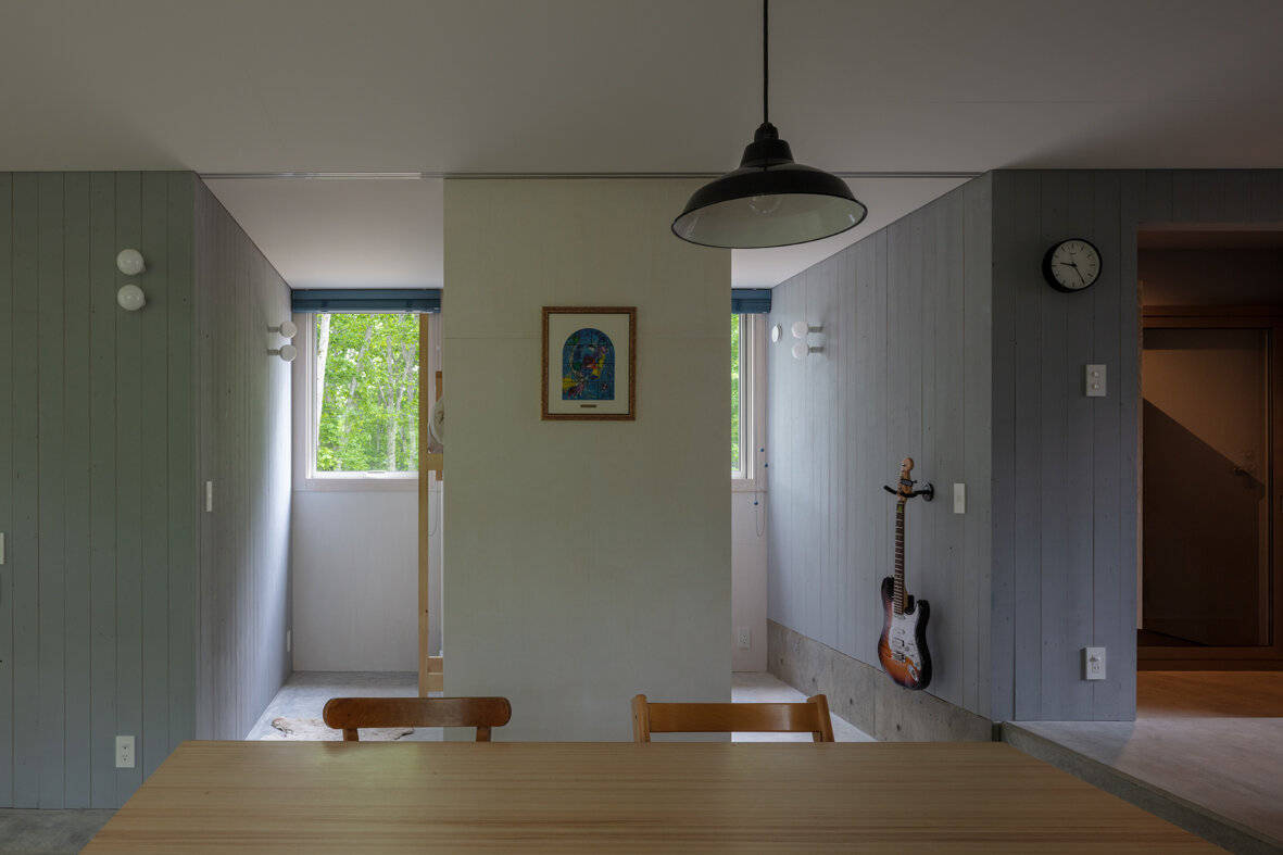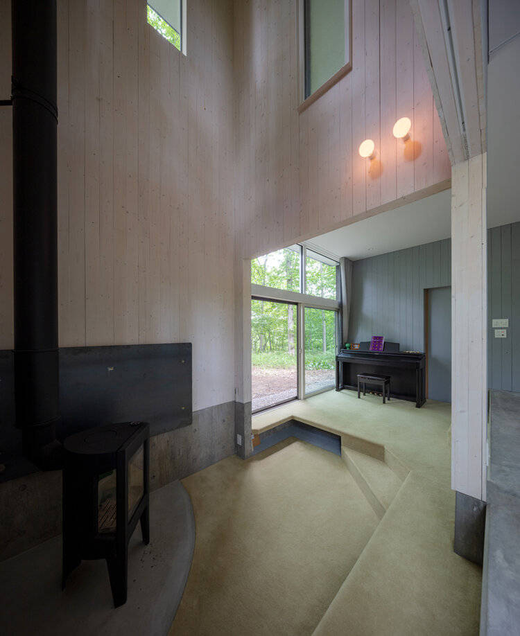 2階天井上にあるペントハウスは、ナイトパージや雪下ろし作業時の安全な出入口としてはもちろん、弧断面を持つ銀天井への写り込みにより、屋根周囲に広がる梢の動きや葉色を抽象化して室内へ届ける装置としても機能する。1階床は地盤の傾斜と十字型の平面に呼応した階段状のステージとなっており、天井高のあるリビングへと家族を誘い、森や小川と生活を繋げてゆく。