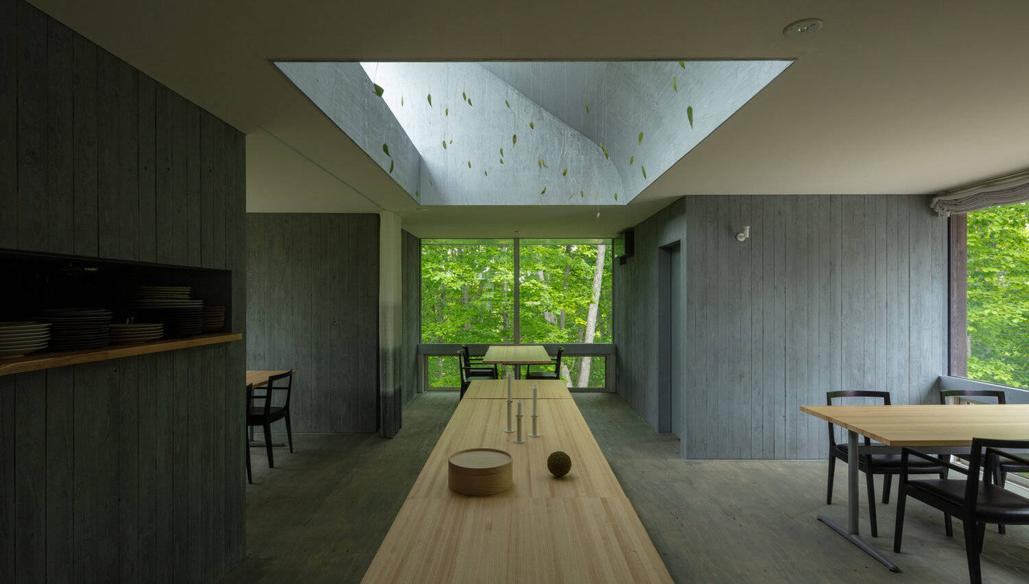 料理と同時に森の表情も楽しんでもらえるよう、枝葉に近い2階をレストランにする一方、シェフの子供たちが気軽に土に触れられるよう1階を住居にあてた。長方形平面の四隅に配されたボックス状の構造的柱体が無落雪のフラット屋根を支え、その間に「個」と「全」が曖昧に同居する十字型平面が生まれる。この平面形状によって、中央の広場から外周に分散したアルコーブ状の場まで、利用人数やアクティビティに応じたフレキシブルな空間使いが、店舗と住居に共通して展開できると考えた。