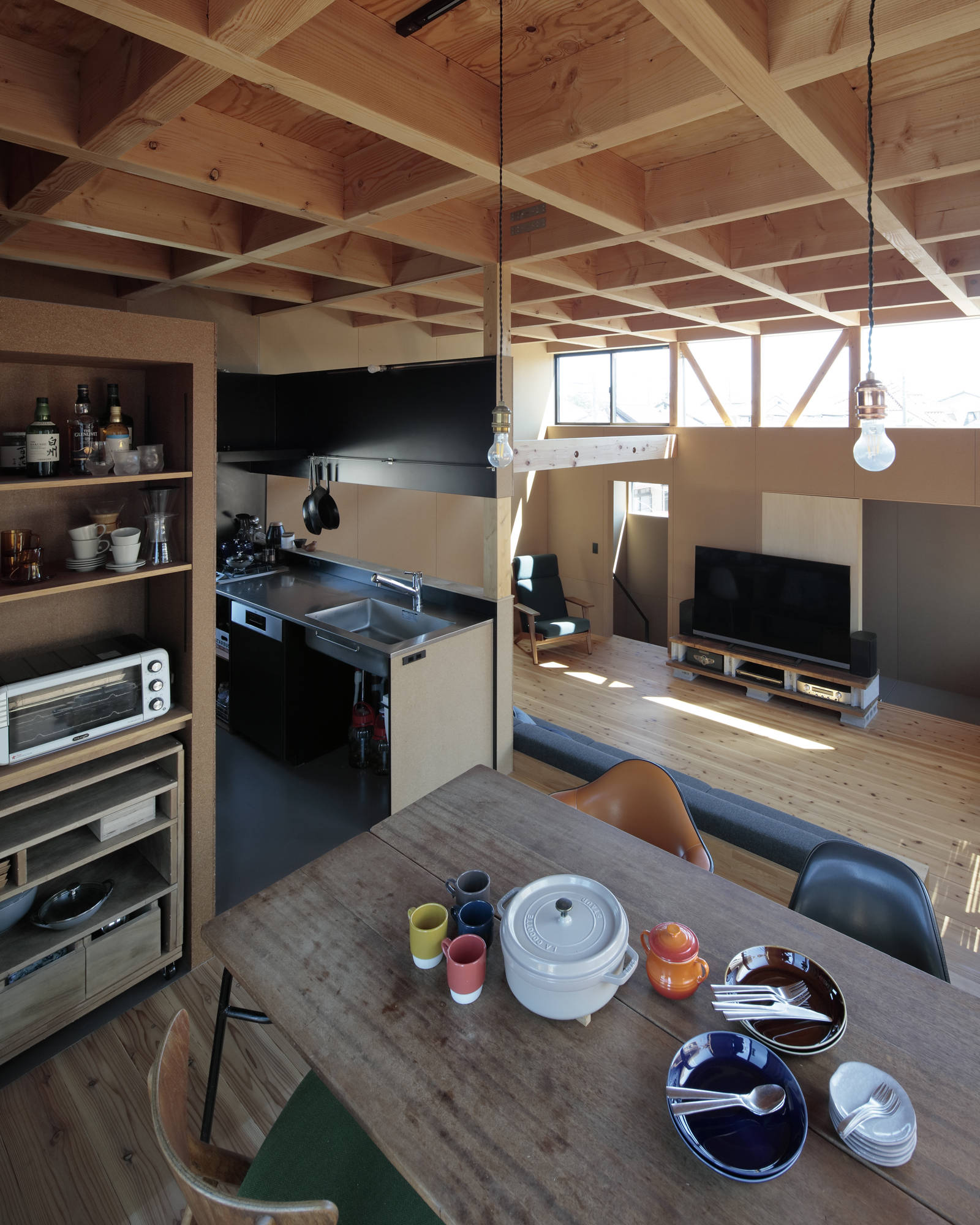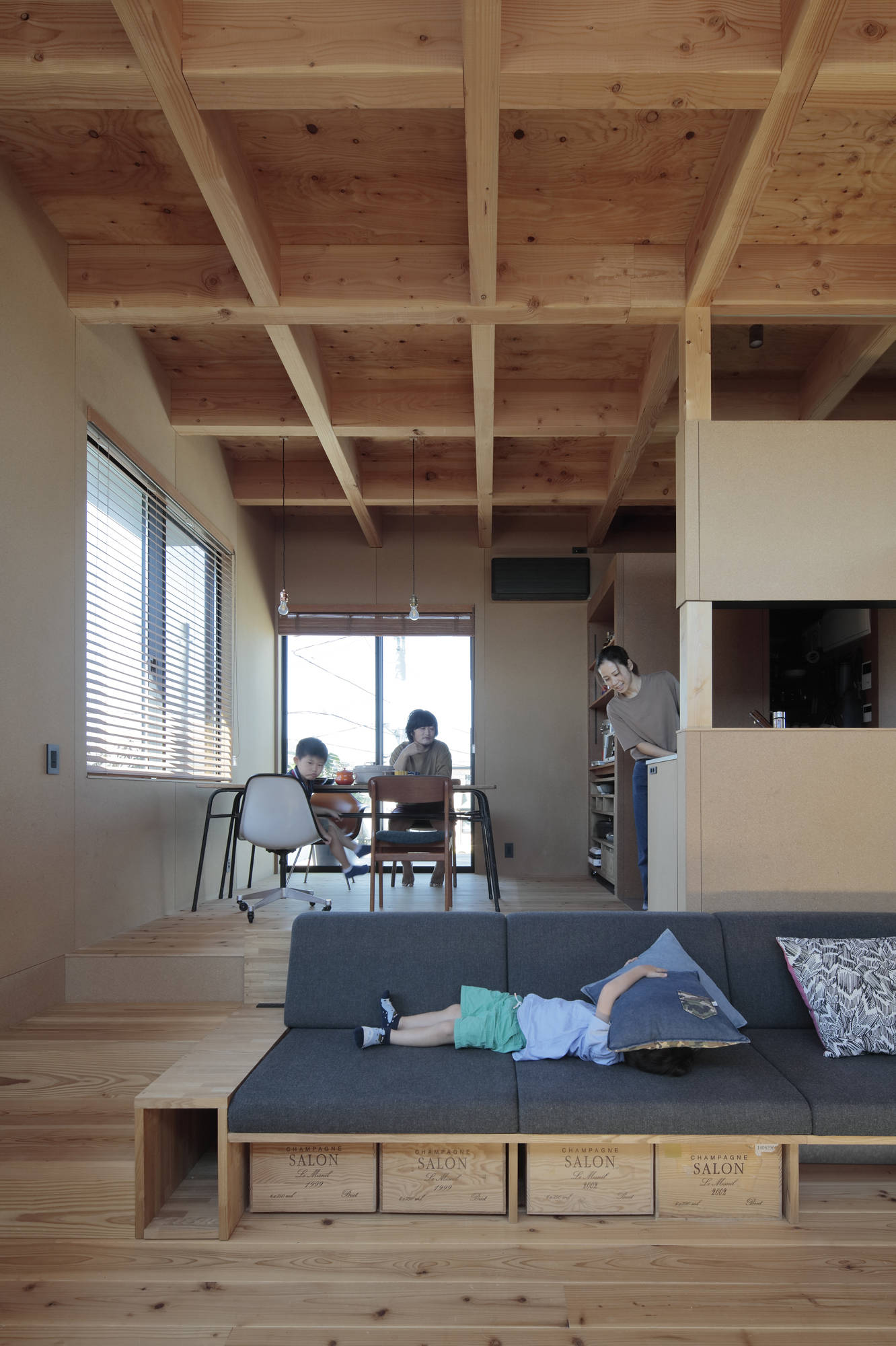 「冬のリビング」ではこの場で最も効果的な南東からの光に向かって段丘状に上がる三段のフロアを配置した。これは、この段丘地で行われてきた日照への探究を範とする身振りであり、入れ子的なリフレクションである。将来のロフトも備えた広がりを持つワンルームは見晴しで家族を繋いでいる。